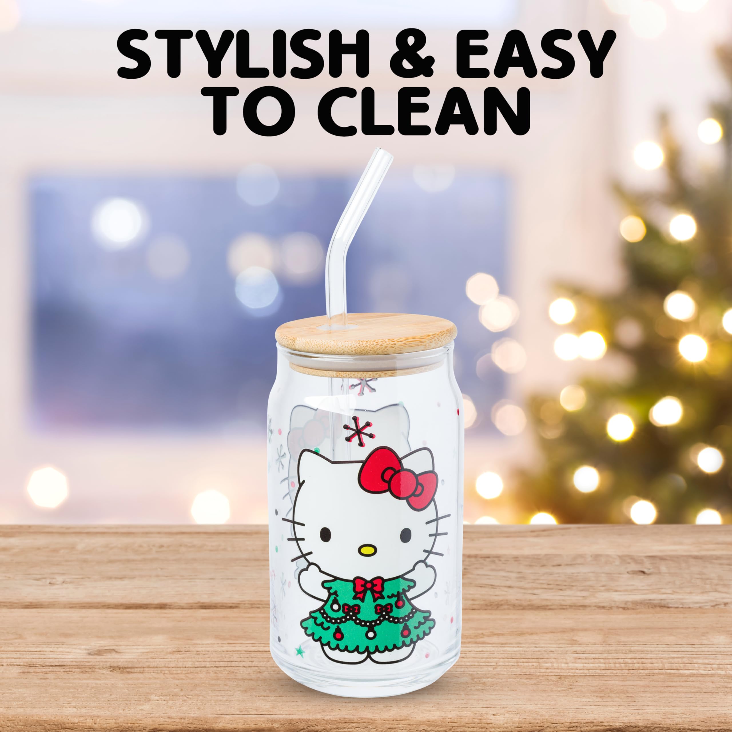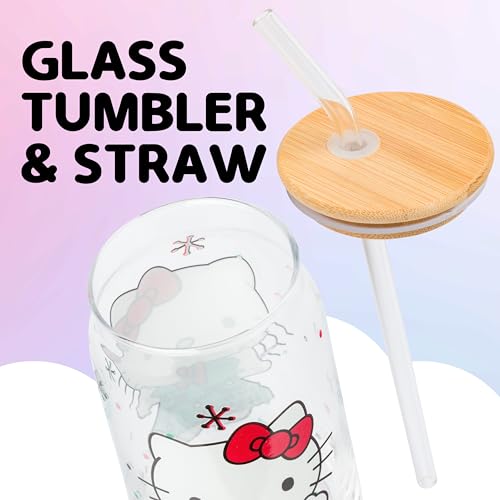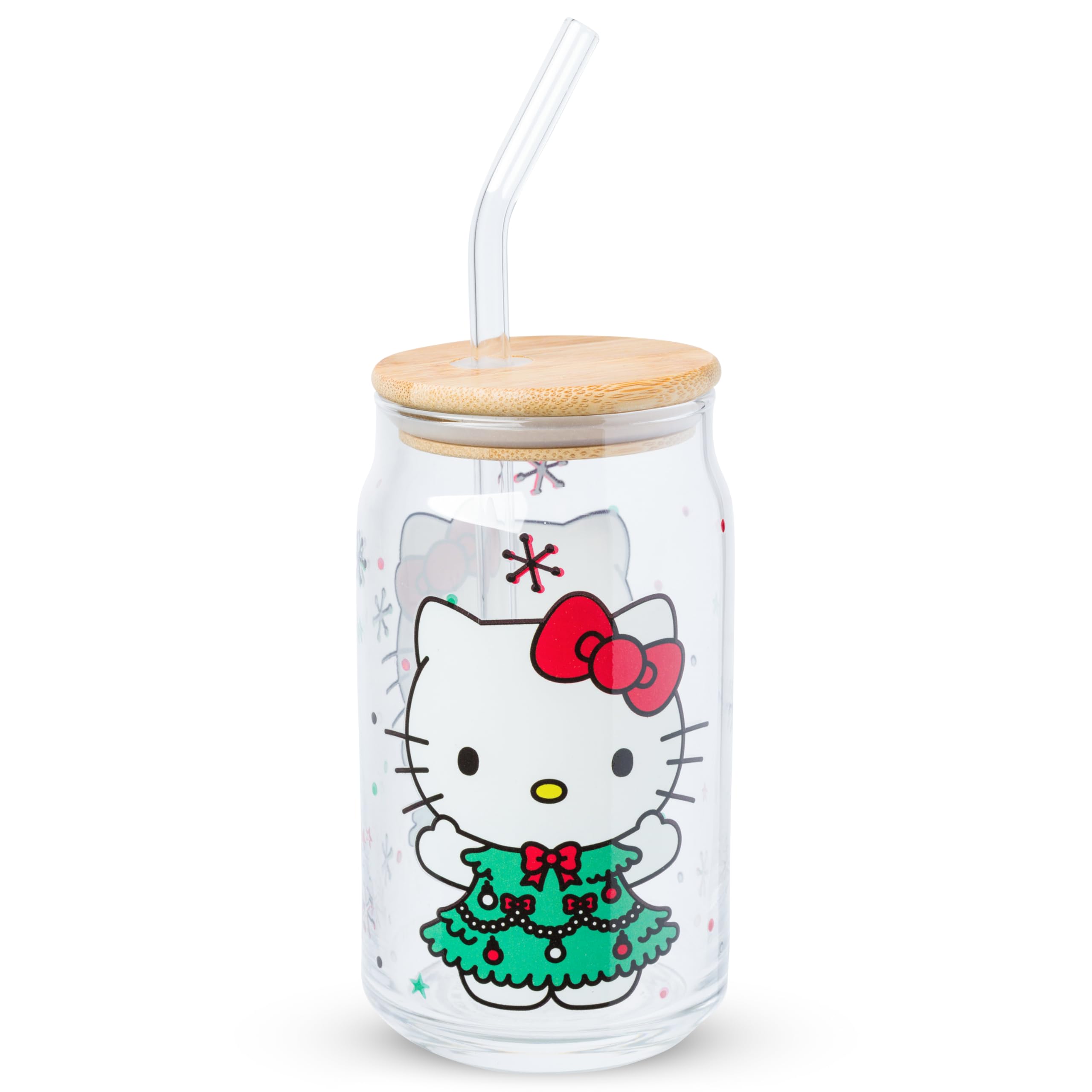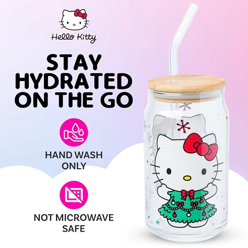 Celebrate the holiday season with this festive tumbler! Themed tumbler features Hello Kitty in an adorable Christmas tree dress. Surrounding the beloved character are colorful snowflakes, polka dots, and stars. Festive design is featured on both sides. Glass tumbler is complete with a bamboo lid and reusable glass straw, promoting eco-conscious living. This 16 ounce tumbler is perfect for enjoying any beverage. With its secure bamboo lid and reusable glass straw, this is the perfect cup to bring along with you on your daily adventures. HAND WASH ONLY. NOT microwave safe. Looking for a gift? Festive tumbler is the perfect gift for your favorite Hello Kitty fan. This kawaii tumbler is ideal for birthdays, holidays, or other gift exchanges. Take a dive into the fictional world with Silver Buffalo! Silver Buffalo provides fans with official merchandise from their favorite characters. Working alongside licensors and brands, we create unique and imaginative products which are designed with great care and detail. Silver Buffalo aims to connect fans to their favorite cartoon characters, superheroes, movies, tv-series, and more. Celebrate your fandom!
