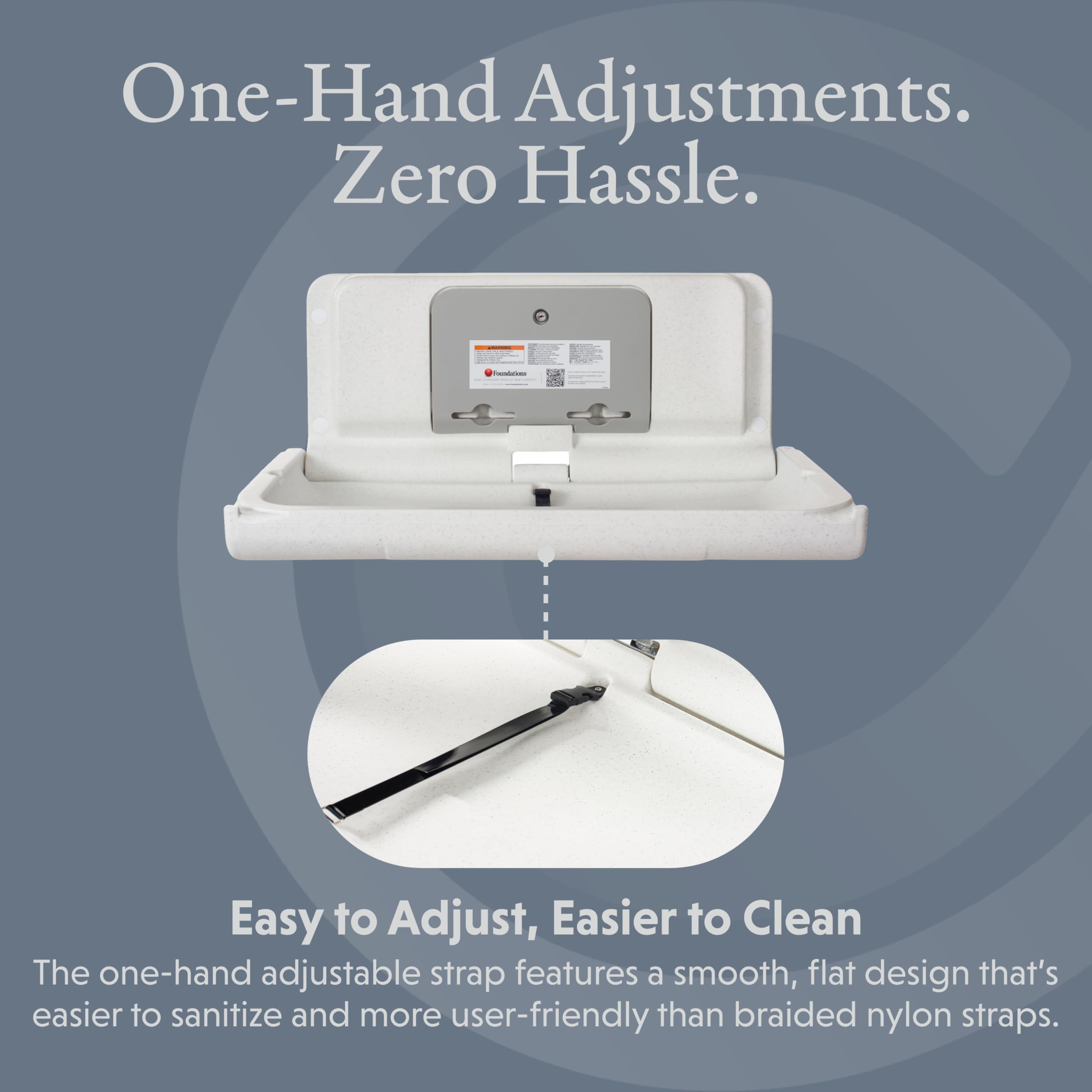 EXTRA-WIDE CHANGING SURFACE: Features a smooth interior and an extra-wide and deep changing surface constructed of hygienic polyethylene, with a semi-permeable vinyl safety belt that can be adjusted with one hand. This diaper changing table meets all global safety standards.