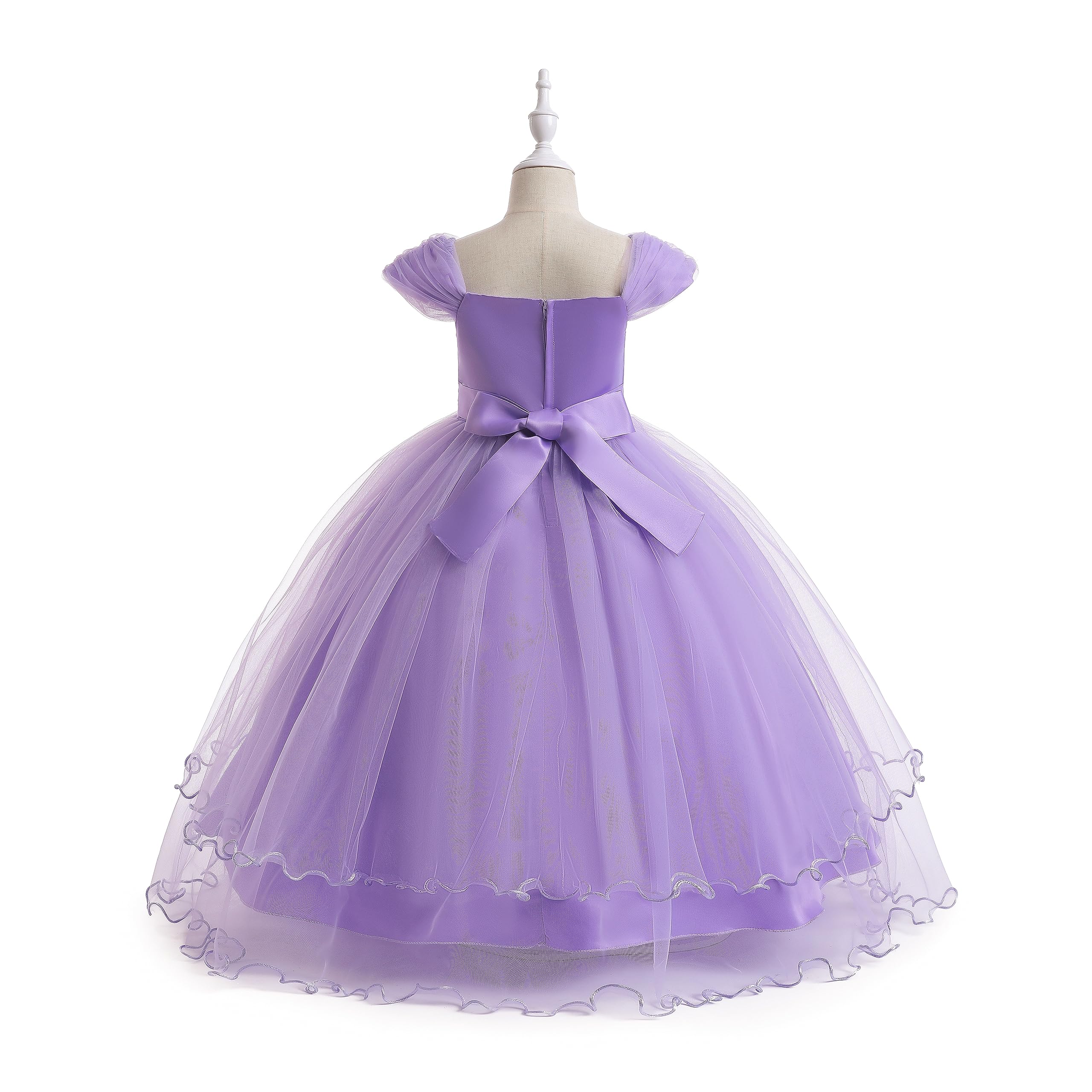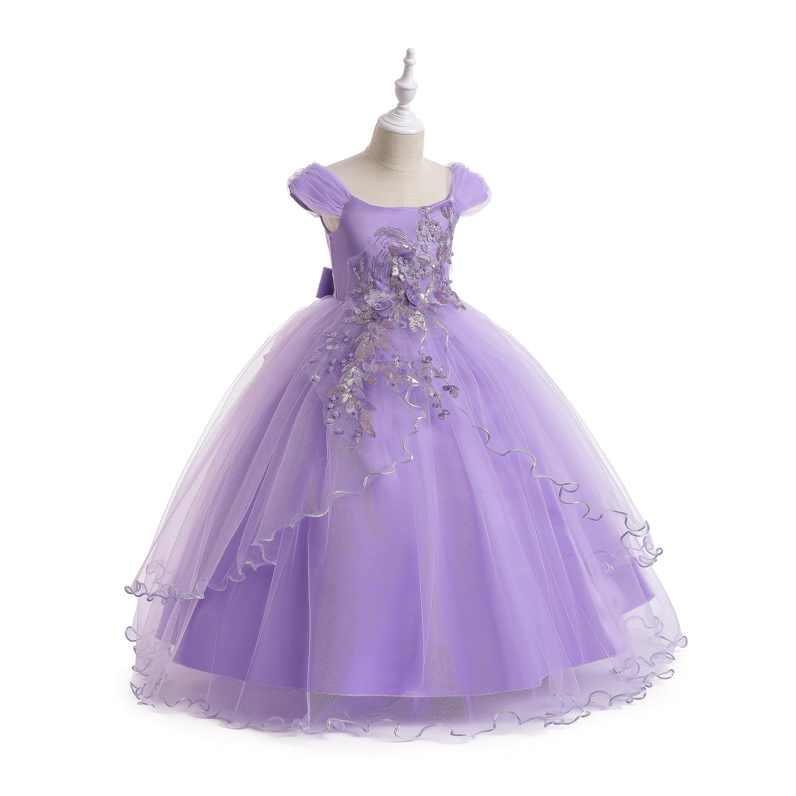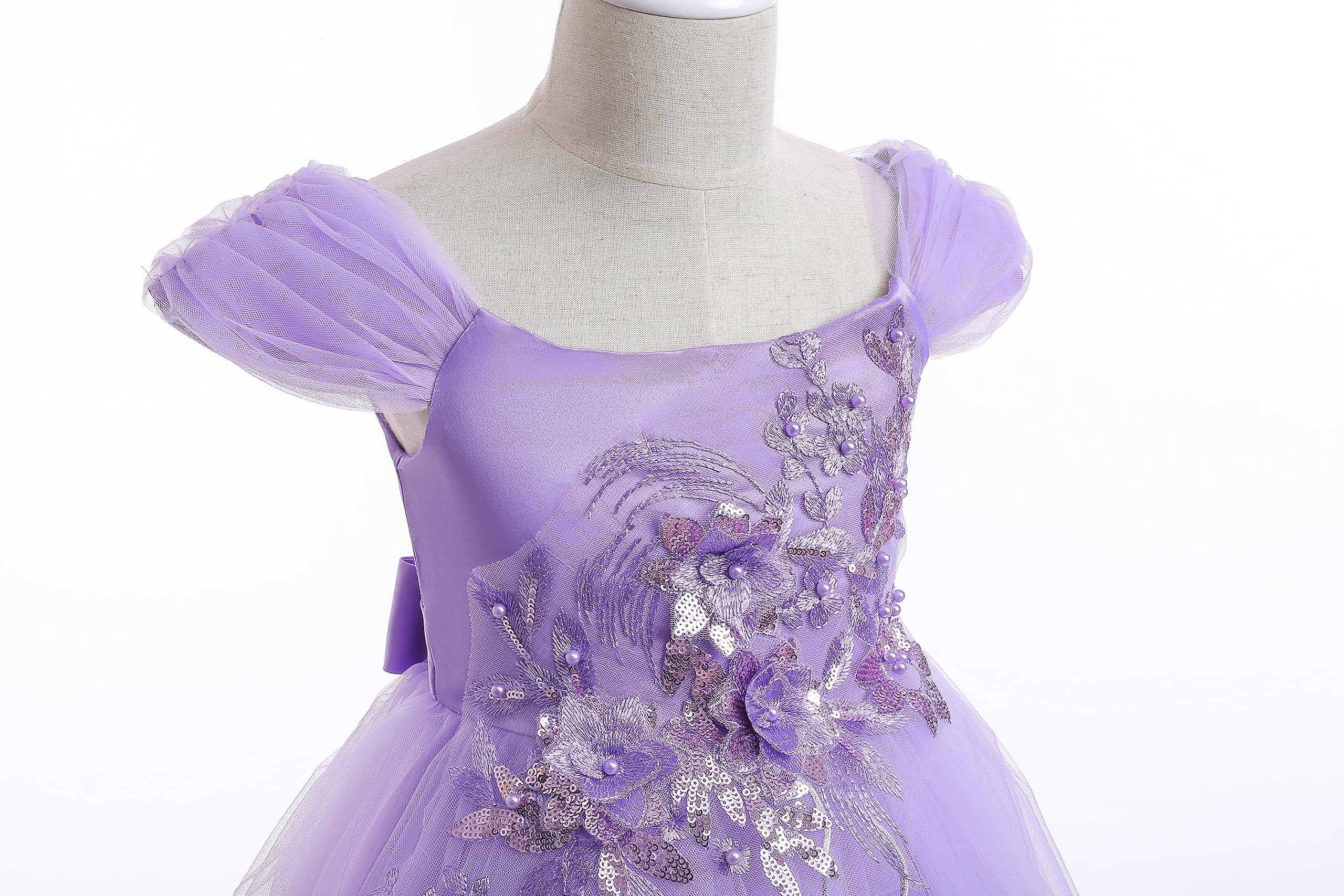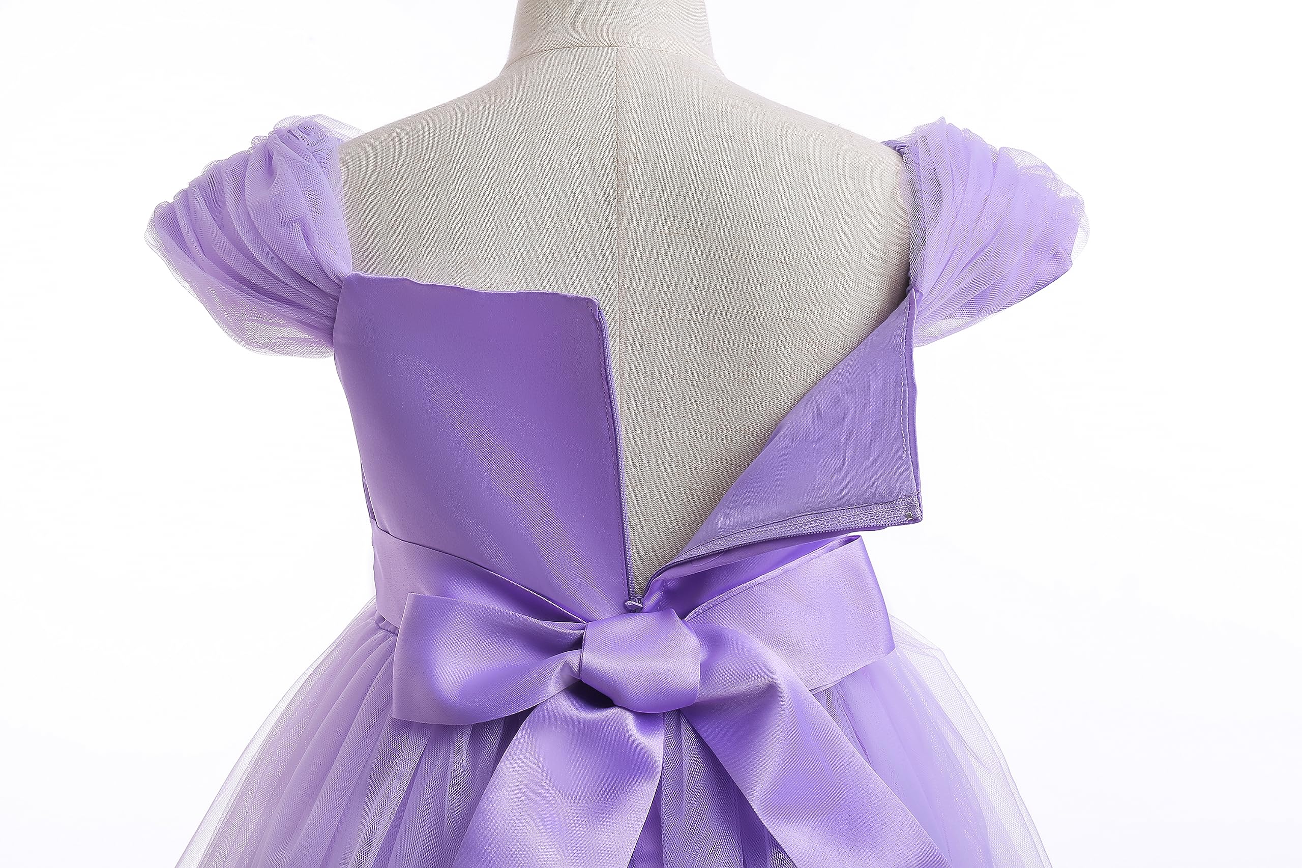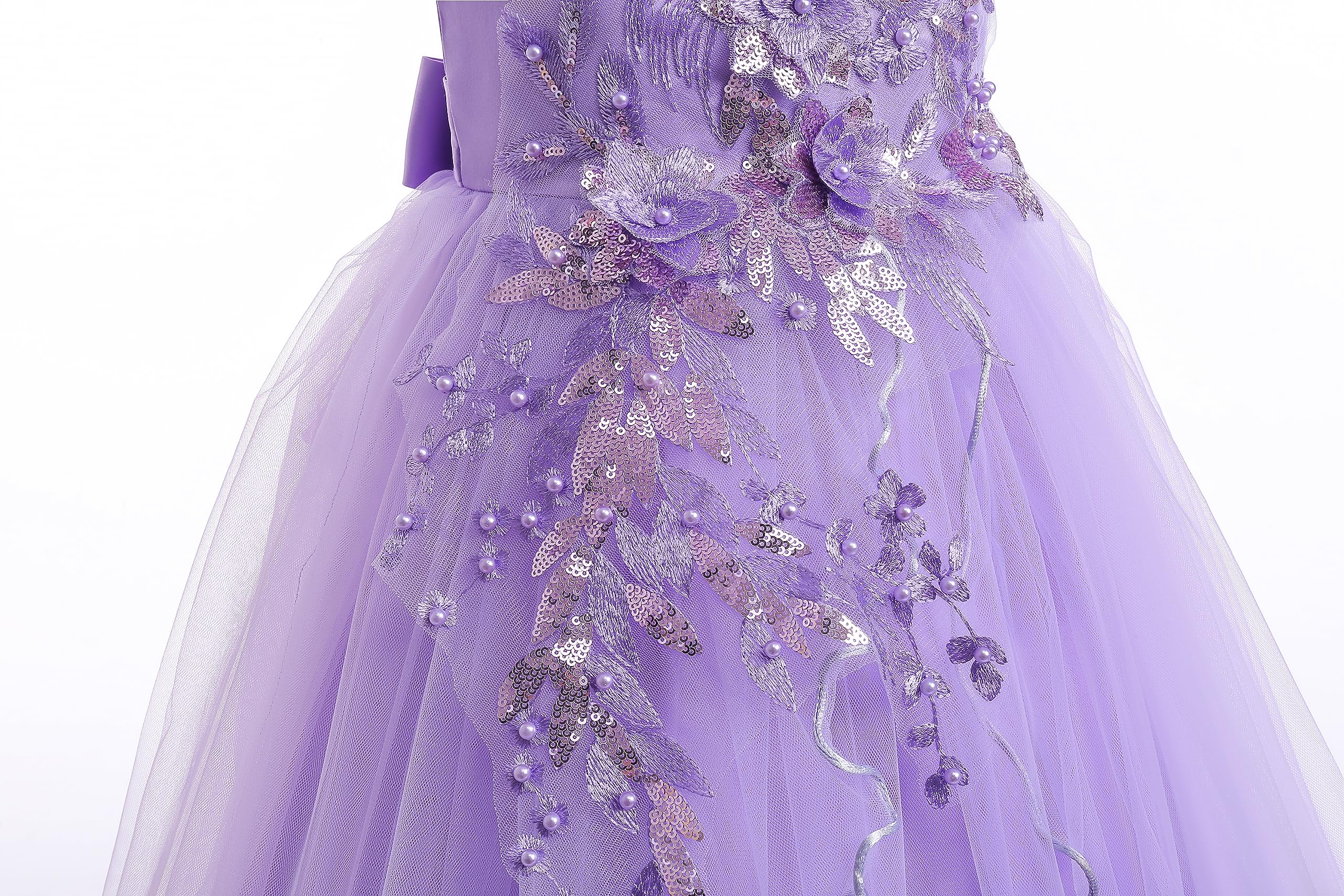 Style: Weileenice light purple flower girl wedding dress, girls ball gown. 3D lace flowers, cold shoulder dress, ankle length, semi-fixed lace pieces, A-line maxi dress, hidden zip on the back, the sashes attached at the side seams can be tied a bowknot at the back. Classical elegant shoulder design, the shoulders have a fluffy tulle with elastic straps inside. Exquisite lace embroidery adorns the chest and waist, with delicate accents, multi-layer tulle making the dress more gorgeous