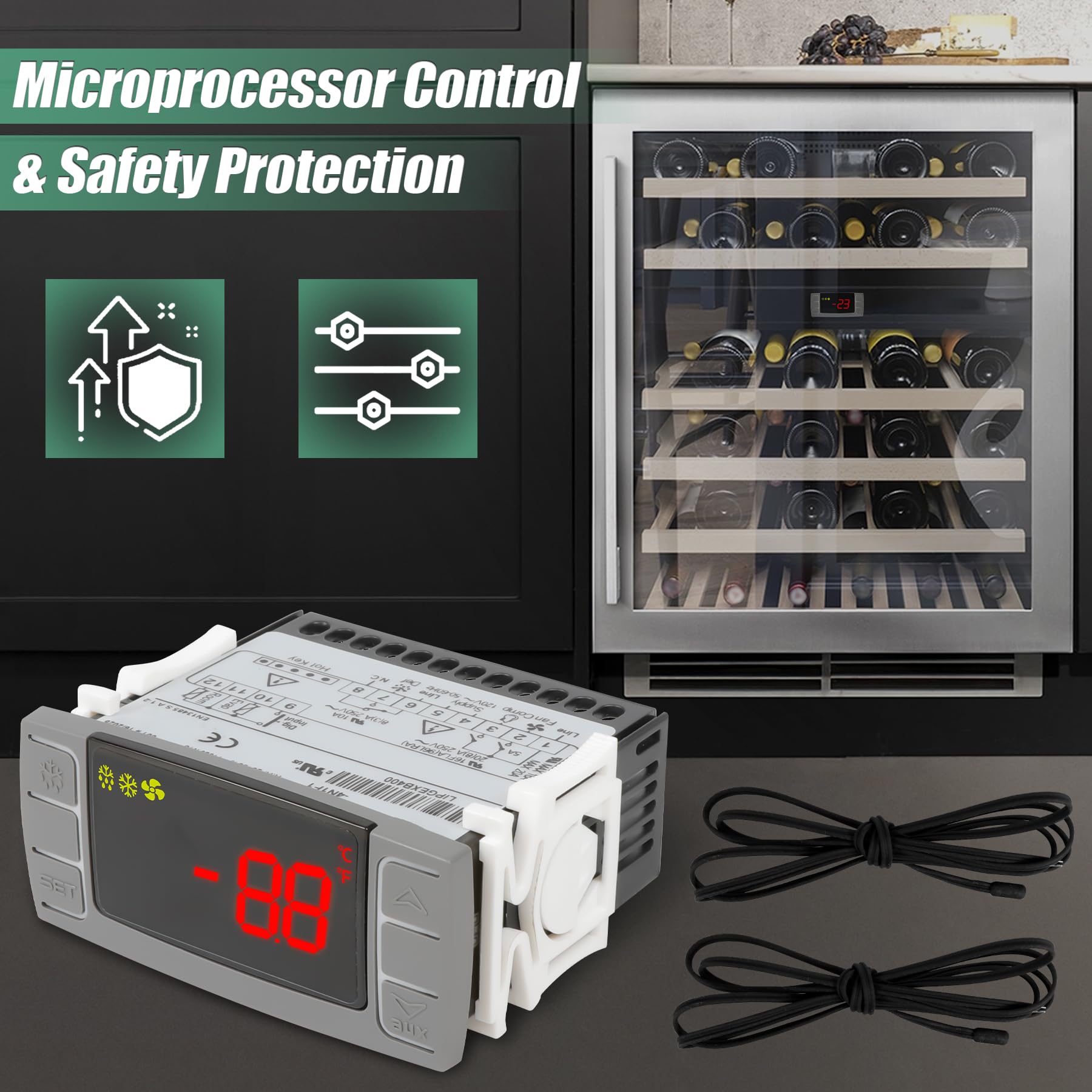 DUAL NTC SENSOR SYSTEM — Equipped with two high-performance NTC temperature probes for real-time monitoring - one for compartment control and a dedicated defrost termination sensor to optimize energy efficiency and prevent frost buildup.