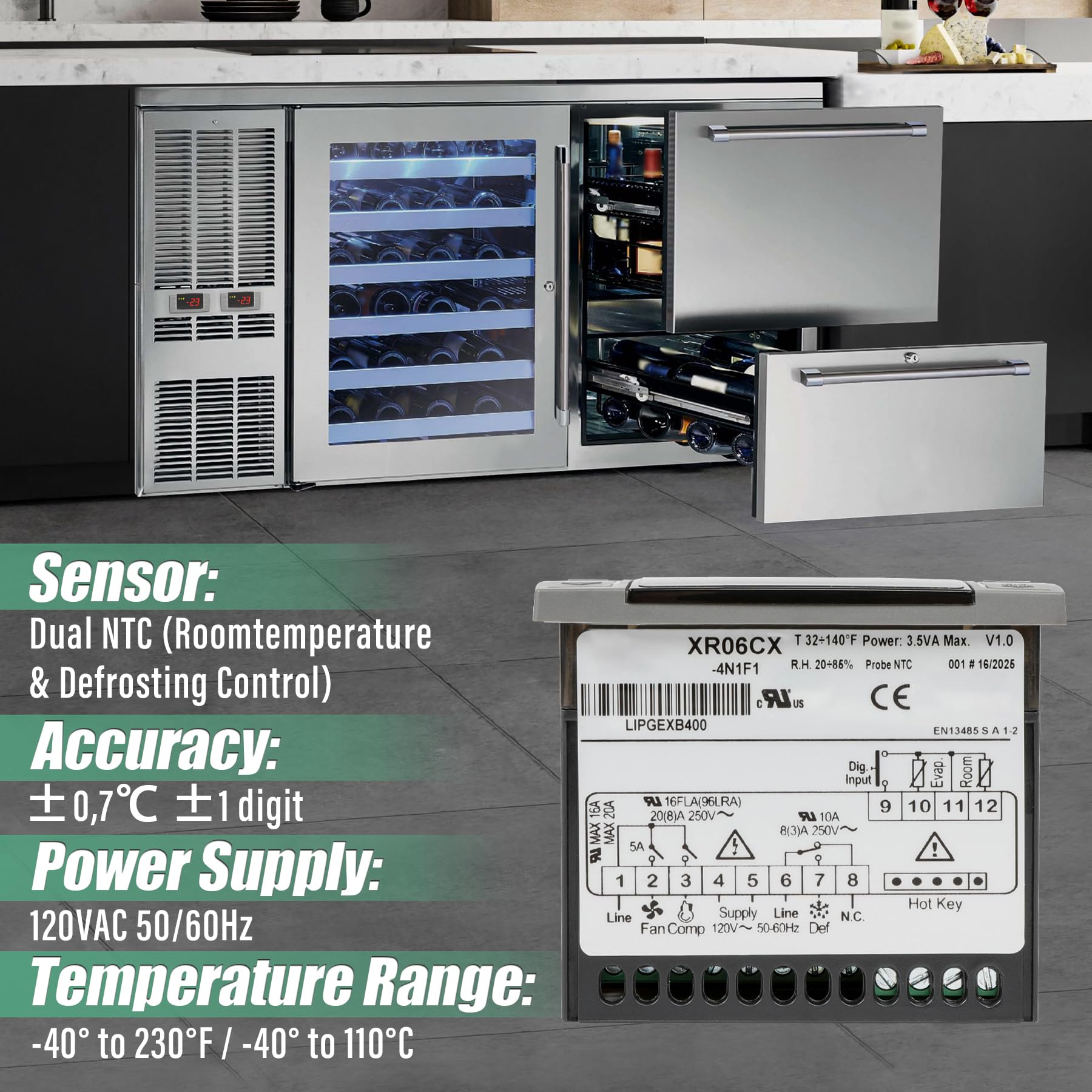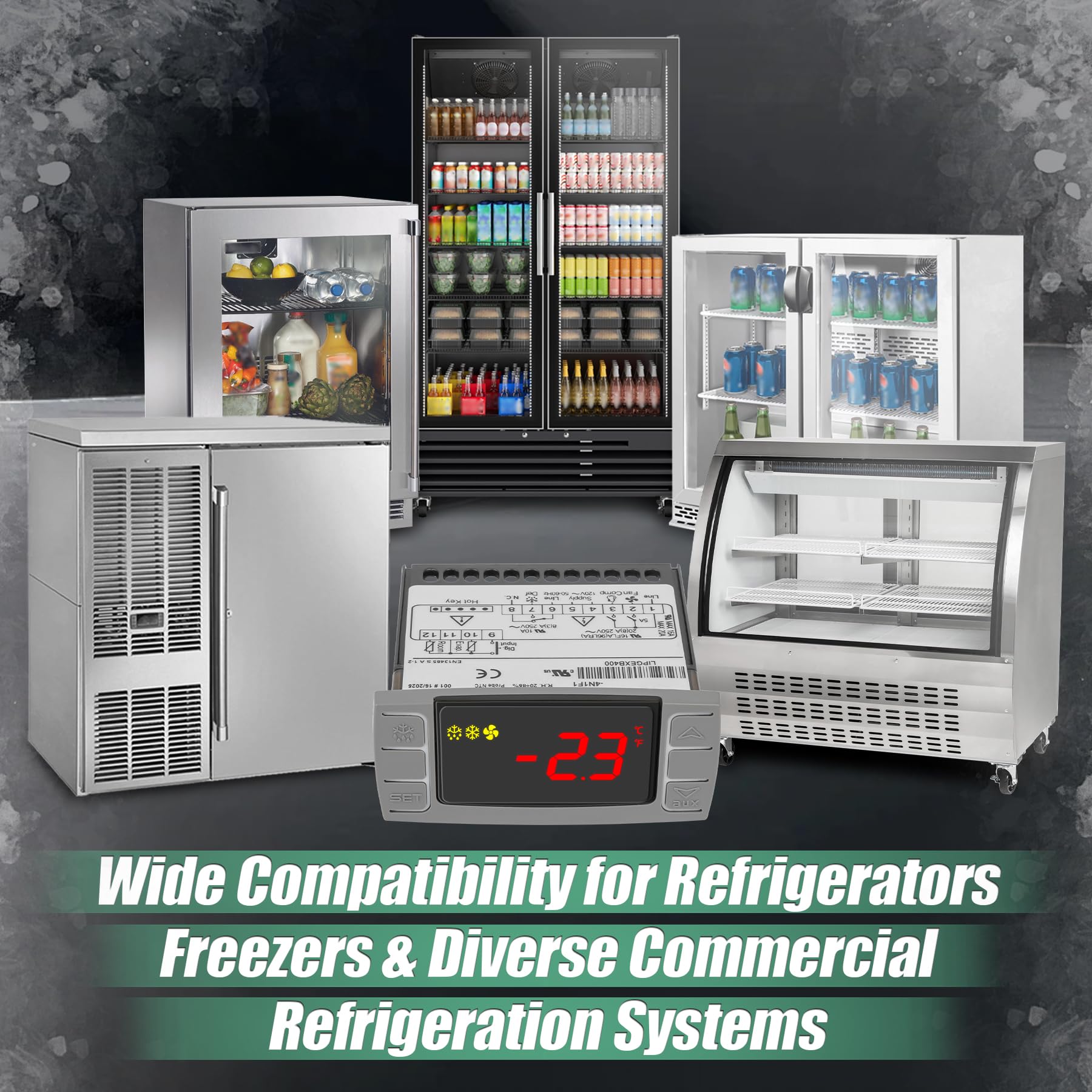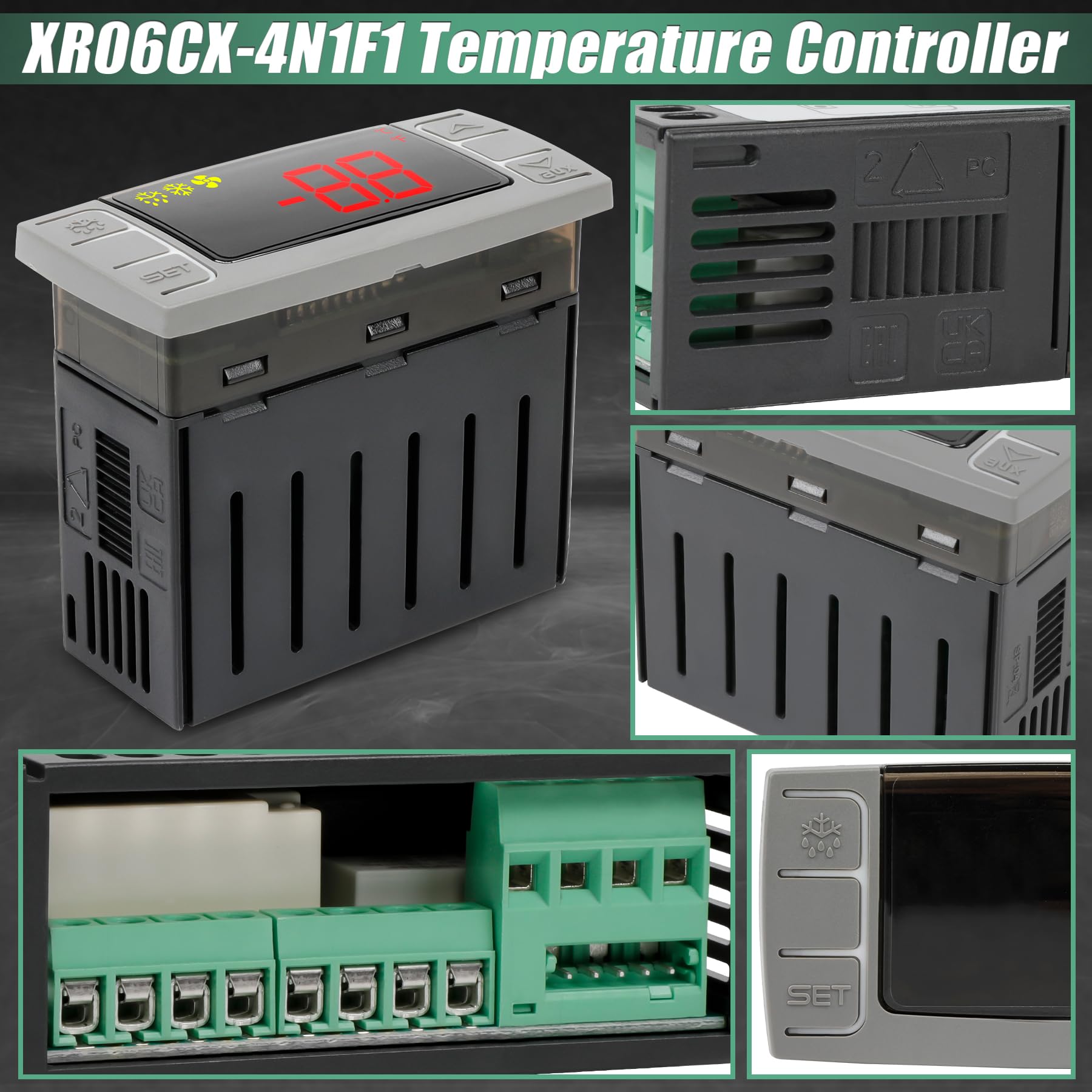 WIDE COMPATIBILITY — The XR06CX-4N1F1 temperature controller is designed for managing freezing equipment, display cases, and refrigerated cabinets. It seamlessly works with refrigerators, freezers, and diverse refrigeration systems including Upright display freezers, Commercial beer machines, Commercial beverage refrigerator display fridge, Small refrigerators, Compressor wine refrigerators, Beer machine cans/carbines, Beer machine taps, Pantry refrigerators, Micro beer machines, Mini freezers, Mini fridges, and beverage tap systems, etc.
