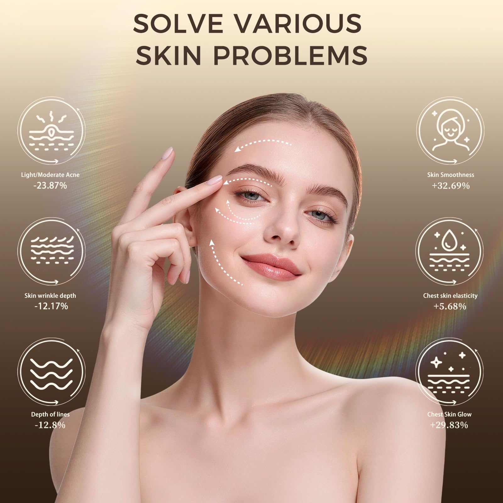 Red Light Therapy for Face: Red light 660 nm are the best combination wavelengths for light therapy. With dedicated LED panels for each zone, the system targets common concerns like uneven skin tone, lack of firmness, and dullness across the face, The light can cover the entire skin layer, penetrate the skin deeper than other lights, solve various skin problems, reduce wrinkles, keeping your skin elastic and youthful.