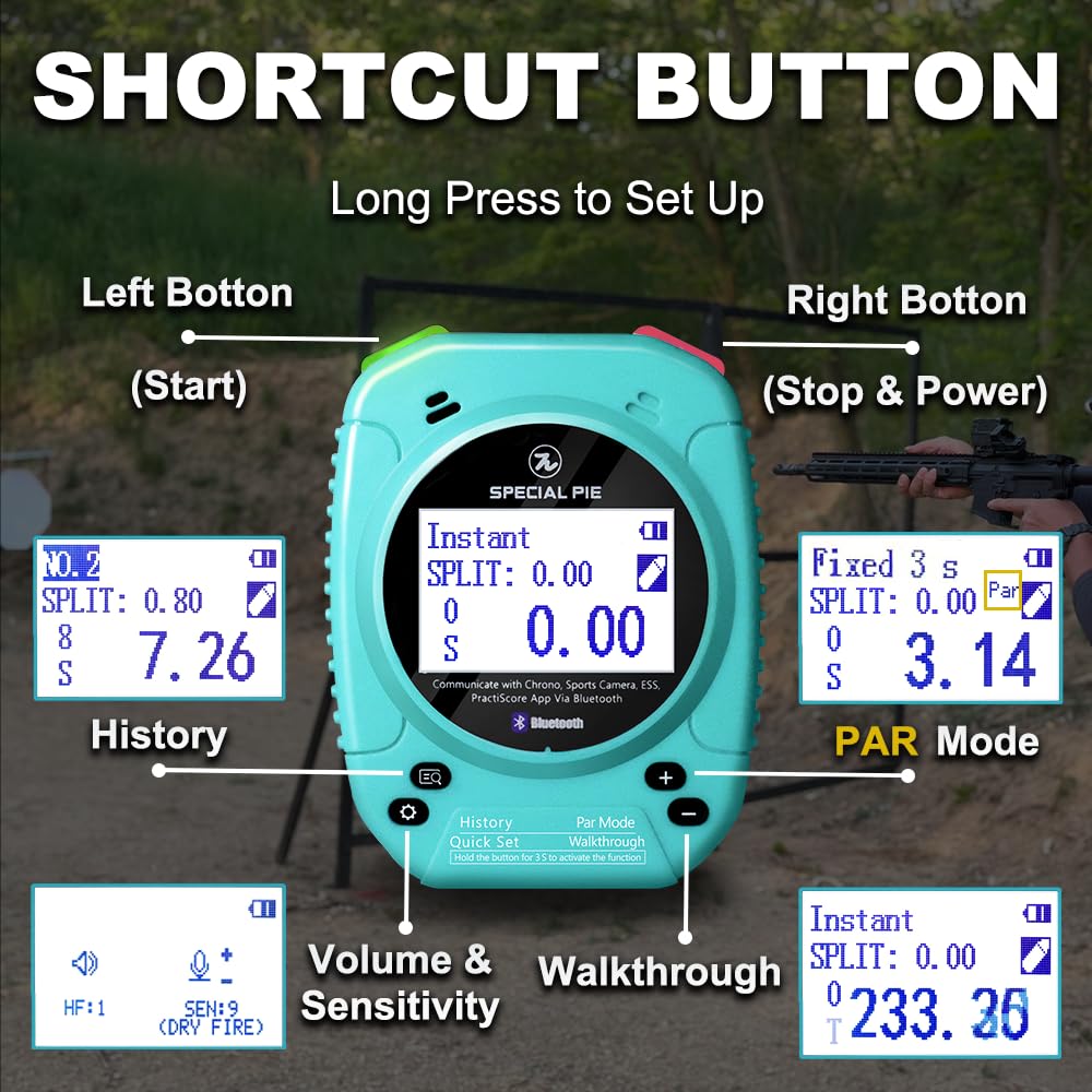Smart Sensor: Advanced sound detection technology accurately tracks shots from Dry fire sound, Co2, lr22 + suppressed, 9mm and any larger firearm caliber. Filters out echoes and allows to train with the shooting timer even in a public enclosed range with other shooters, isolating and capturing only your shot sounds