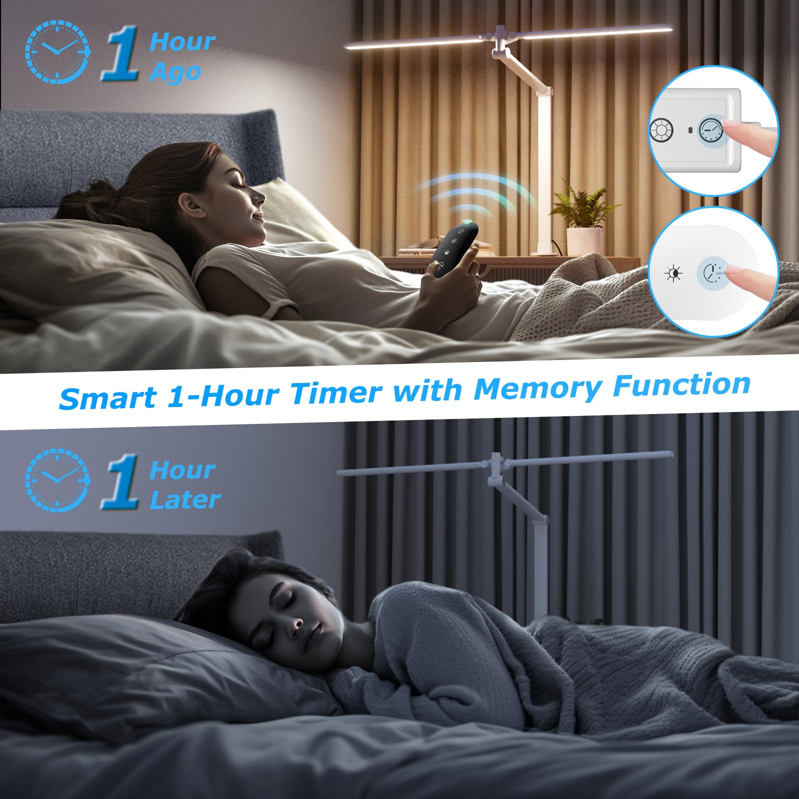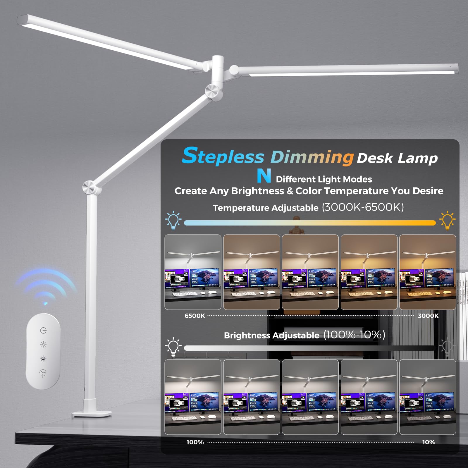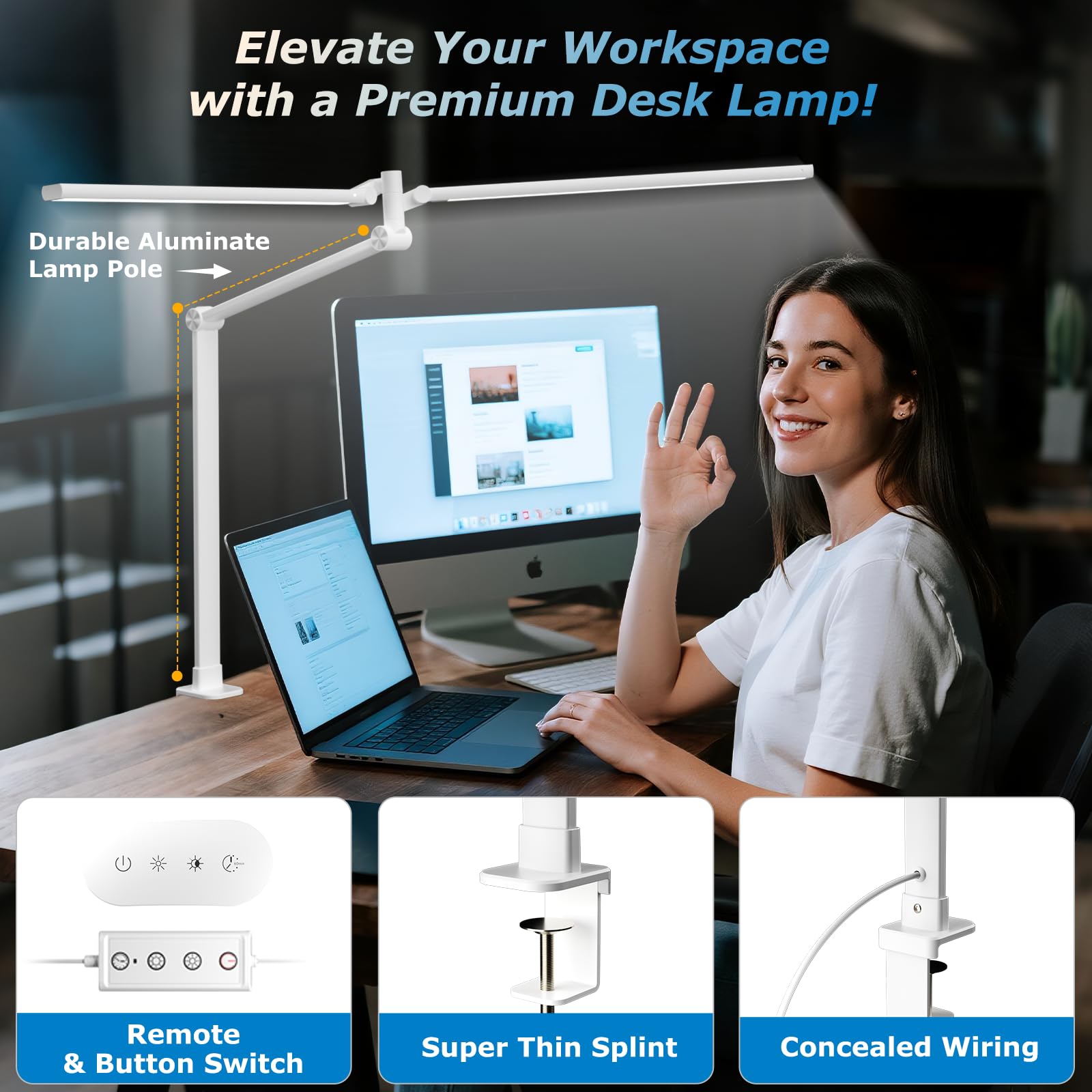 Remote Control & Multifunctional: This dual-head LED desk lights for home office comes with a wireless smart Magnetic remote for quick and convenient lighting selection. It features two special functions: memory and timer. The memory function retains the last used mode and brightness, eliminating the need for resetting. The timer function automatically turns off the lamp after 1 hour, helping prevent overexertion
