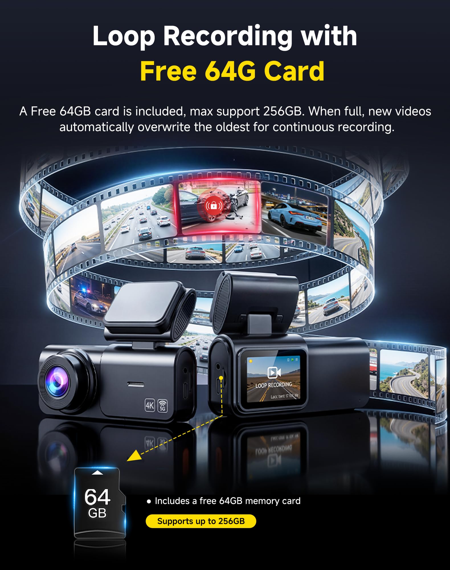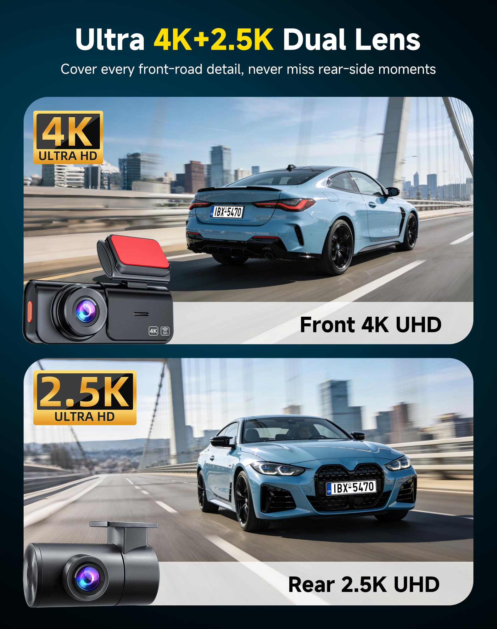 【24/7 Parking Guard & Time-Lapse Mode】 Protect your vehicle day and night! This high-HD dash recorder captures crystal-clear 4K front + 2.5K rear videos. Automatically activates parking mode with motion sensor monitoring—records time-lapse footage while parked to save memory. Energy-efficient time-lapse mode condenses 24 hours into minutes! To achieve this function, an extra car accessory- hardwire kit is required (ASIN: B0F8HJPVZP, sold separately,not included in the package).