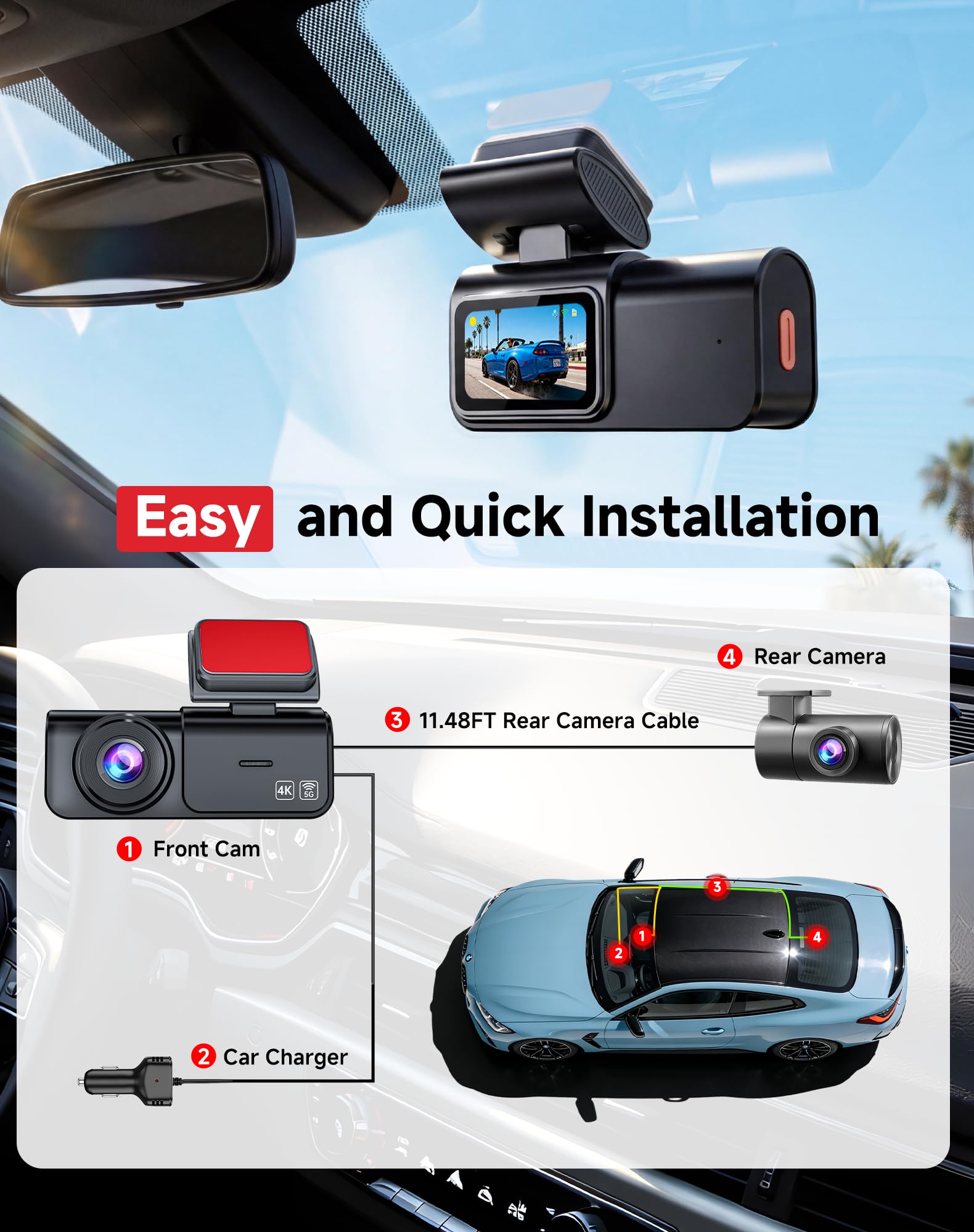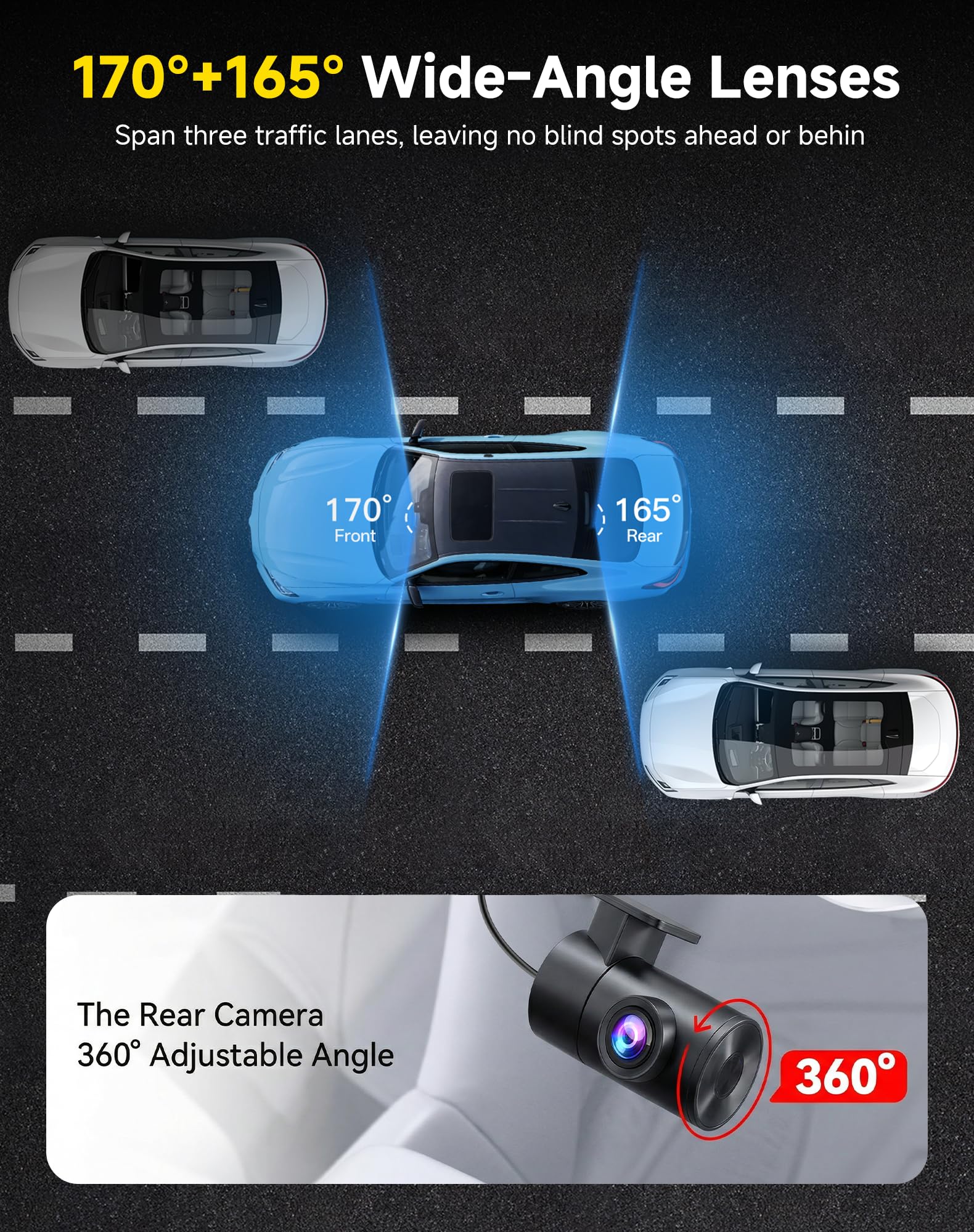 【4K+2.5K Dash Cam Front and Rear】 The front dash cam records stunning 4K videos, while the rear camera delivers crisp 2.5K HD footage. Experience ultimate coverage: 170° ultra-wide front lens and 165° wide rear angle minimize blind spots. This dual dashcam ensures high-definition recording front and back, Download driving videos easily via the free app. Get clear evidence day or night – record your road trips with peace of mind! Fits minivans, buses, cars, trucks & more.