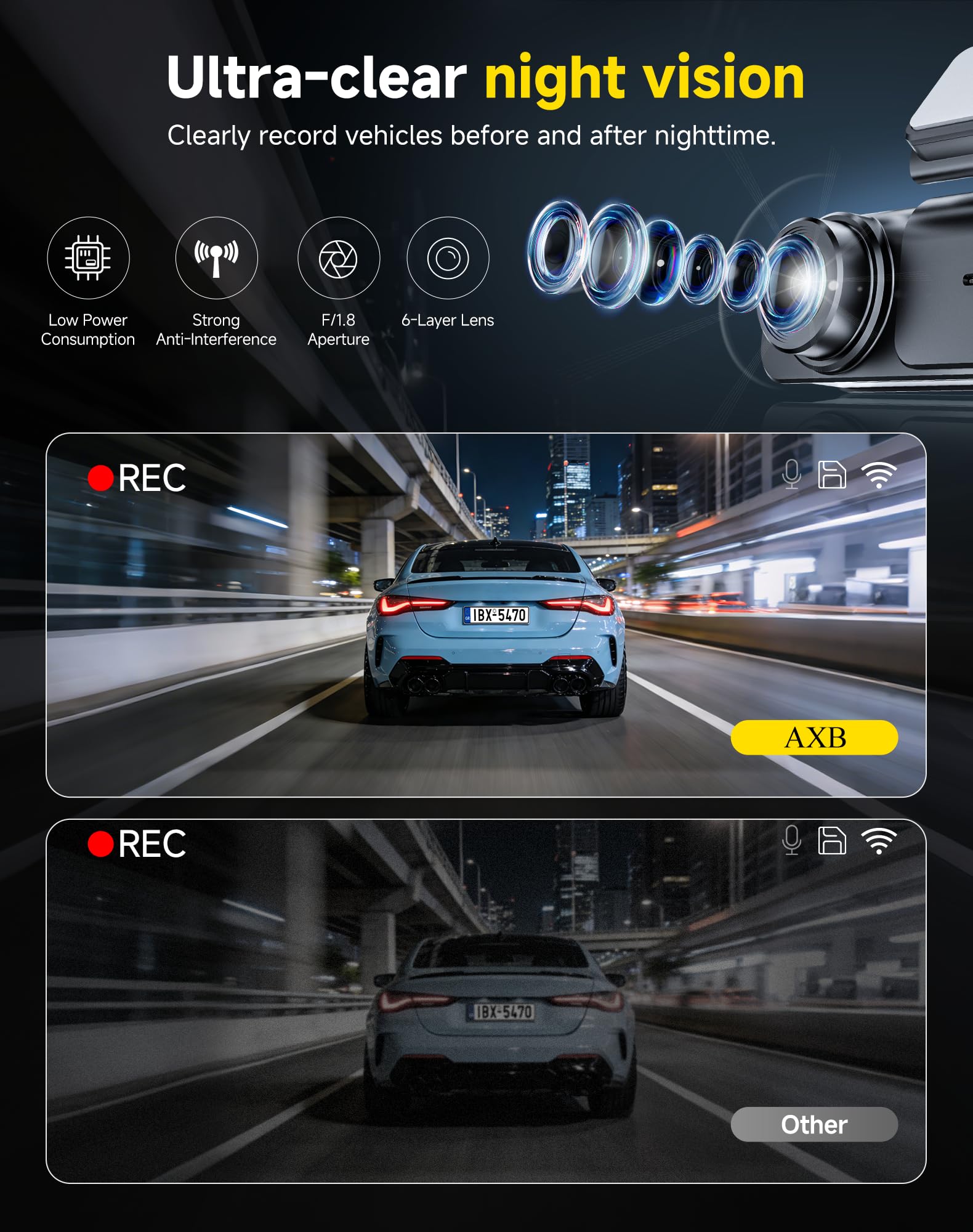 【Car Camera Front and Rear with Night Vision】 Crystal-Clear Front/Rear Videos with 323HA Sensor & WDR Tech! See clearly when others can't! The F1.8 aperture + 6-layer lens system maximizes light intake for razor-sharp driving videos. No more blurry night recordings—every license plate and road detail stays high-HD visible. Automatically adapts to low-light conditions, ensuring critical evidence is always recorded.