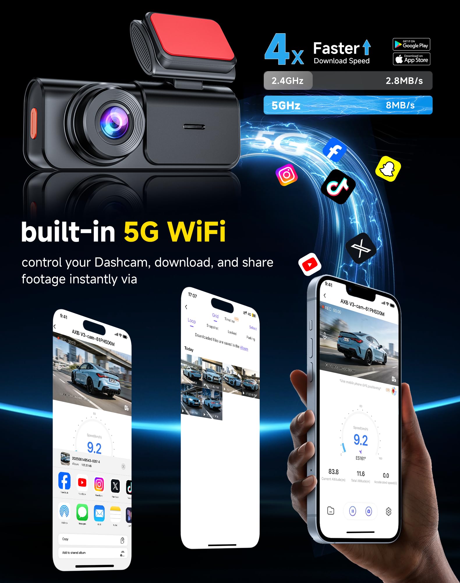 【5G WiFi & App Control dashcam】Equiped with cutting edge 5G WiFi module, allow 4x download speed(up to 8 MB/s) compared to other 2.4G. Easily connect to our V3 dual dash camera for cars, you can instantly view the live time video from the front and rear side of your car, and adjust the settings of the v3 car camera. With a few simple taps, you can download the albums from the app, edit them, and share them on social media.