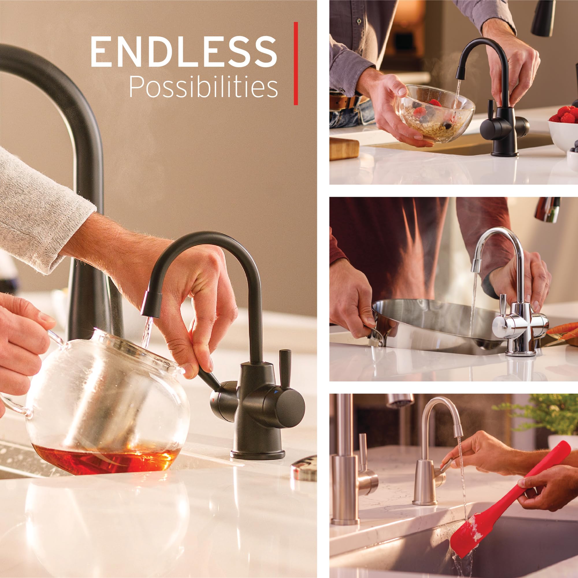 ON-DEMAND, NEAR-BOILING WATER: Instant hot water (approximately 200 degrees F) right next to the main kitchen faucet when you need it, for cooking, cleaning, and more; a time, space, and energy saver that lets you get on with more important things in life