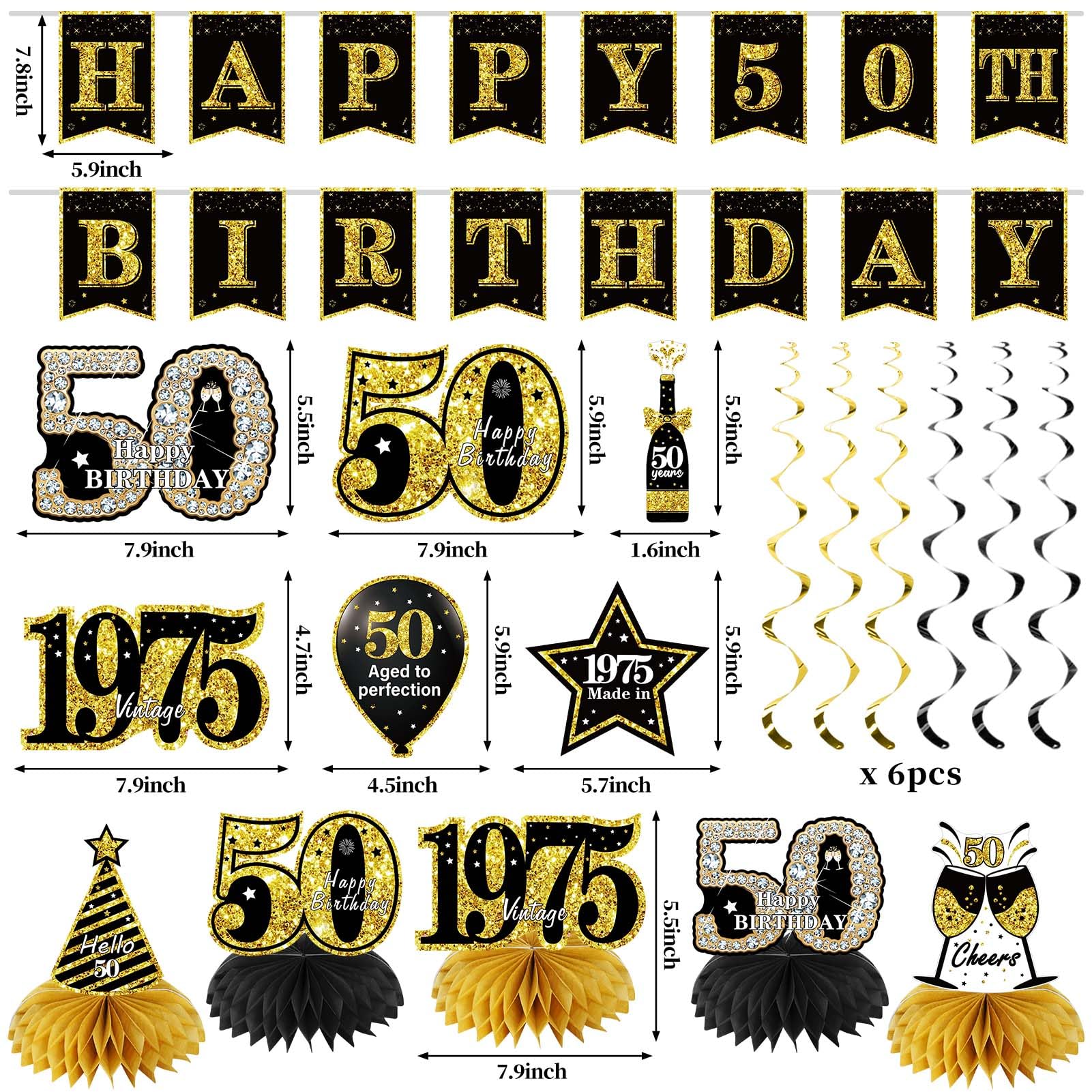 [You Will Get] - 21pcs 50th Birthday decorations kits, 1pcs backdrop, 1pcs "HAPPY 50th BIRTHDAY"banner, 1pcs "50"balloon, 5pcs honeycomb centerpiece, 6pcs hanging swirls, 6pcs pompoms, 1pcs sash with a pin.