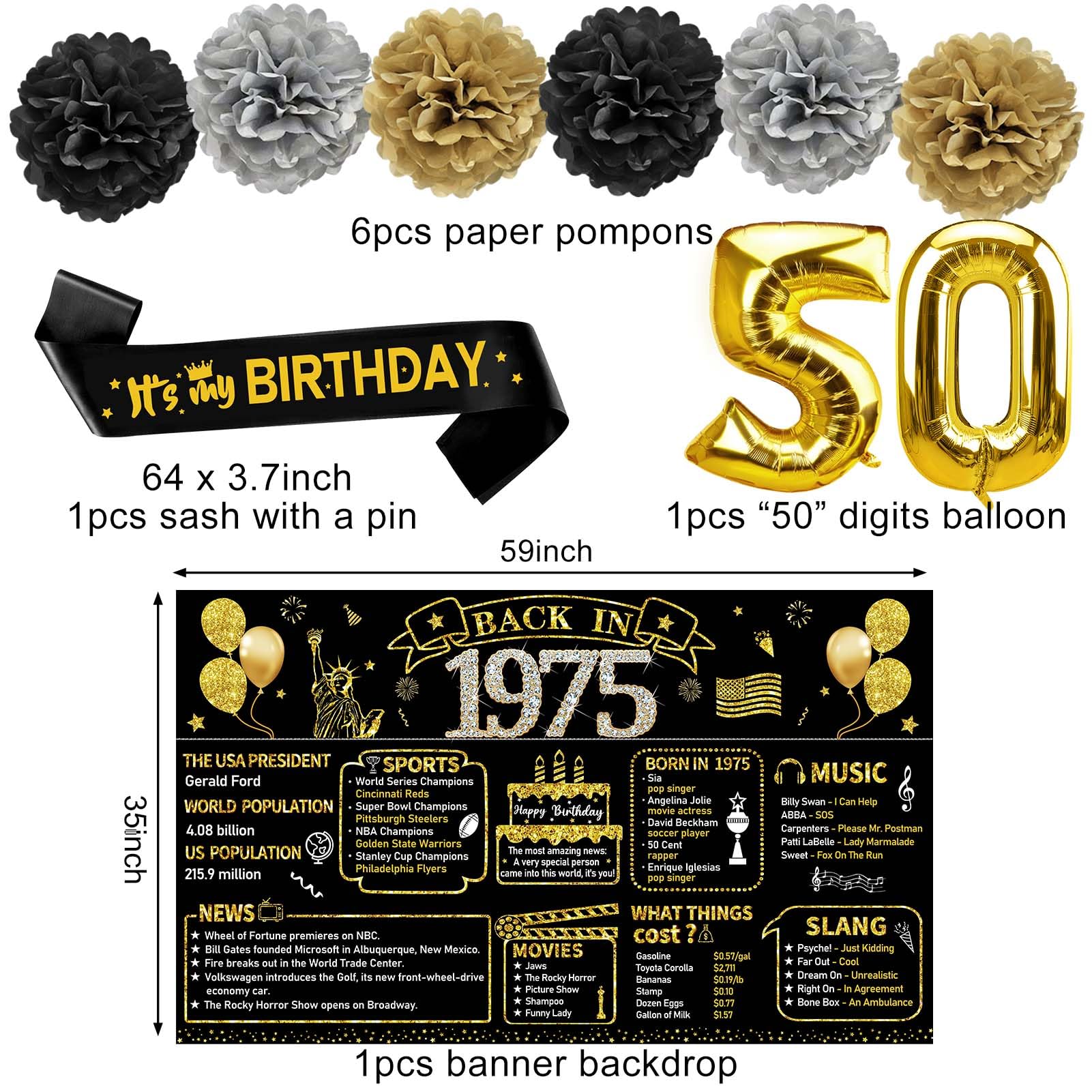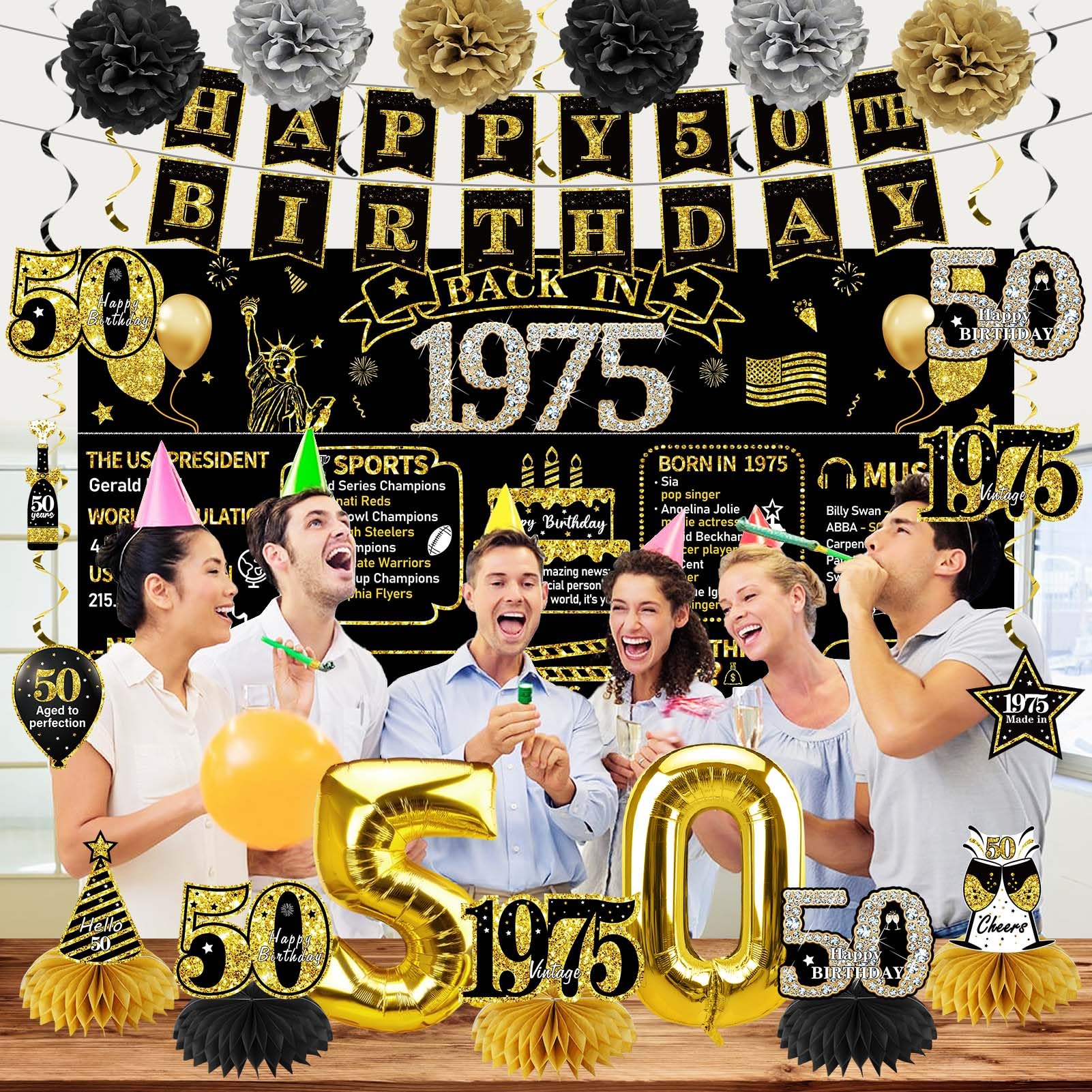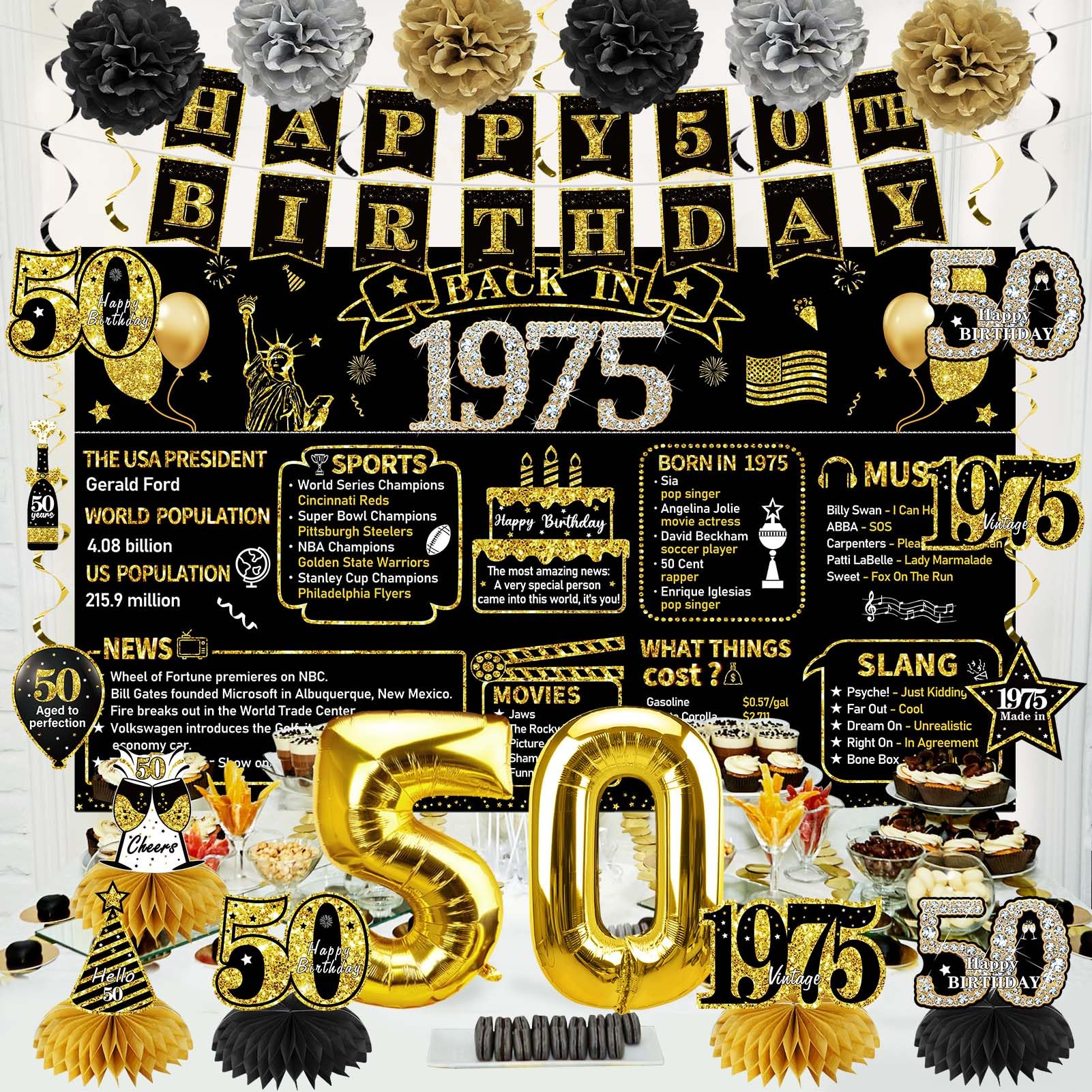 [Vintage 1975 Theme] - Designed specifically for the 50th birthday party. Among them, the banner is mainly in black and gold color, with clear retro historical text printed on it; The set is also paired with a variety of honeycomb and swirls patterns, a large golden balloon "50", etc.