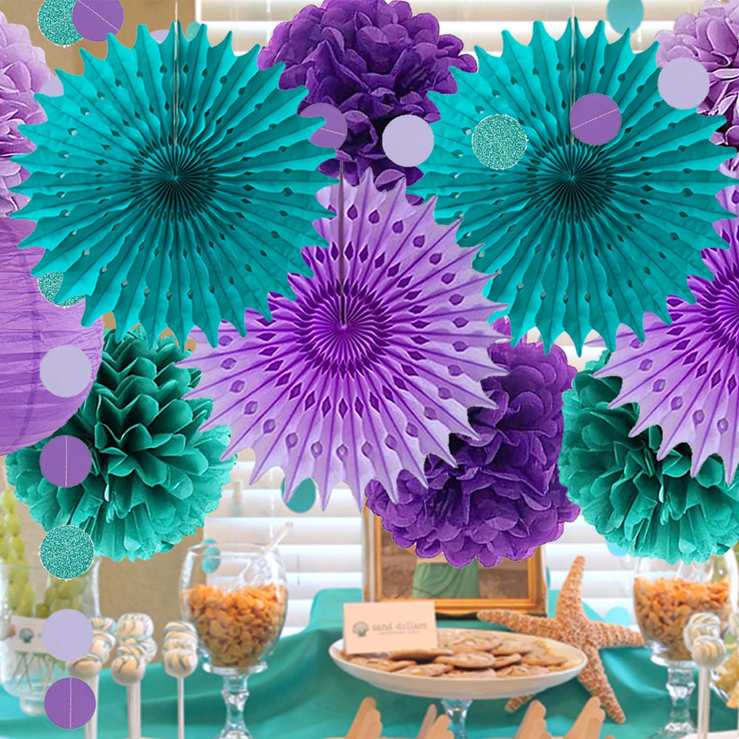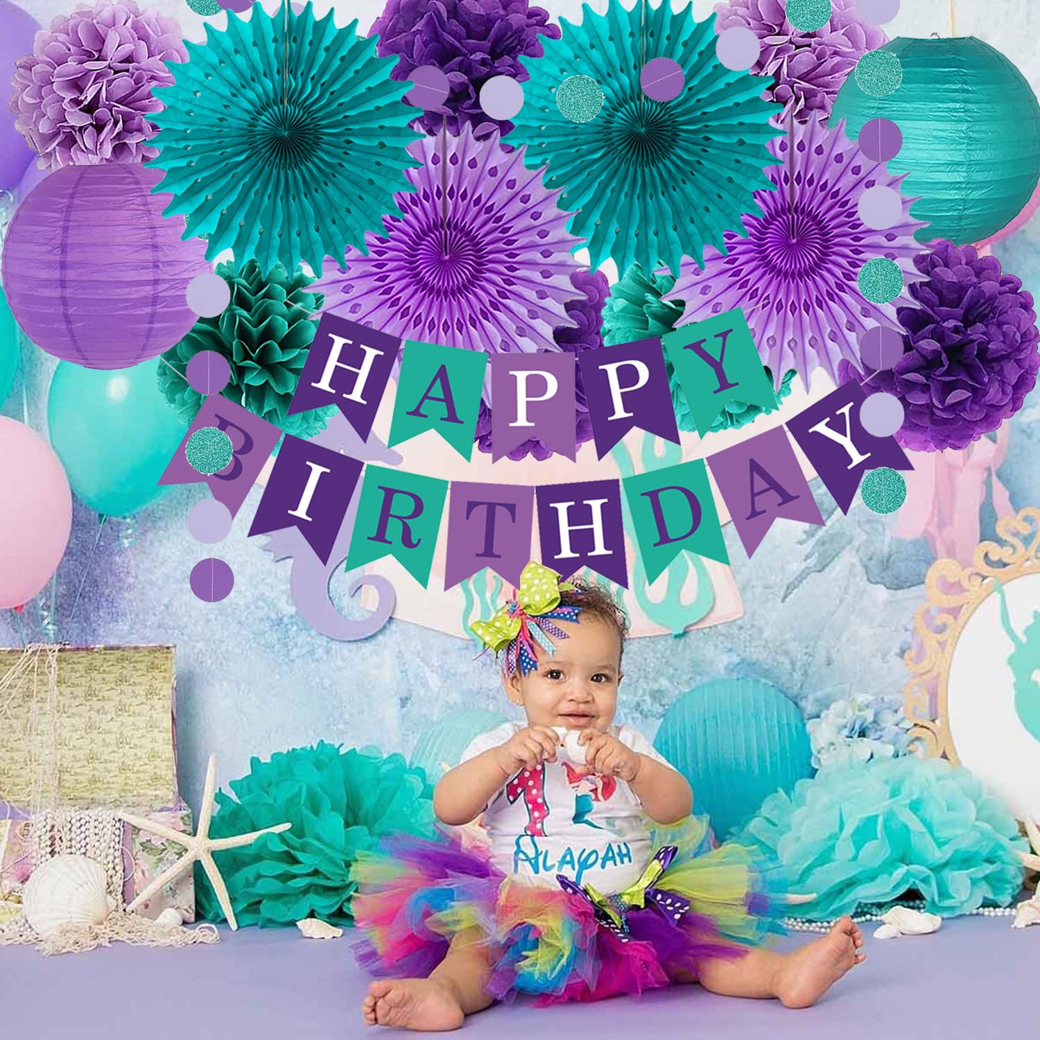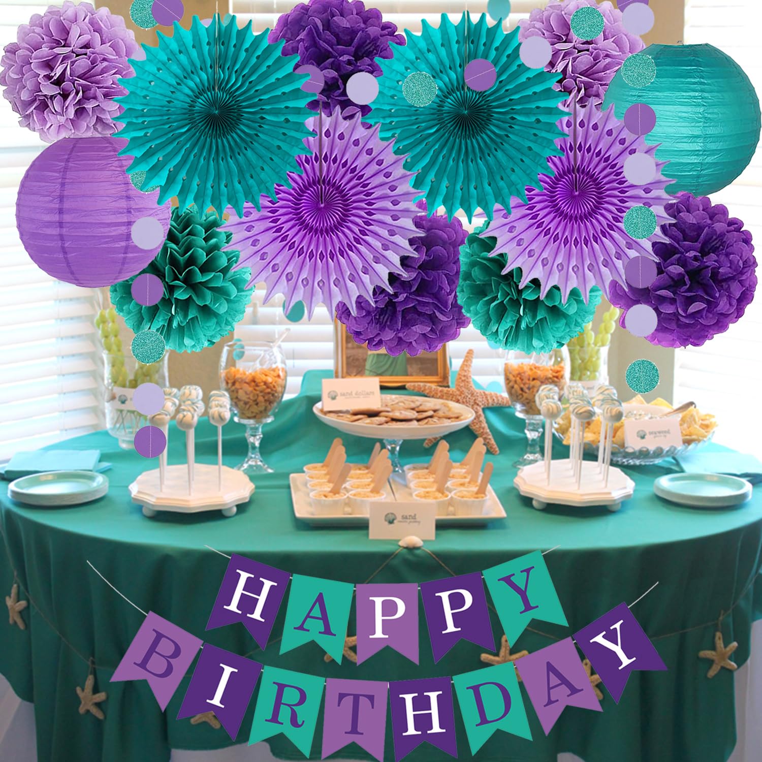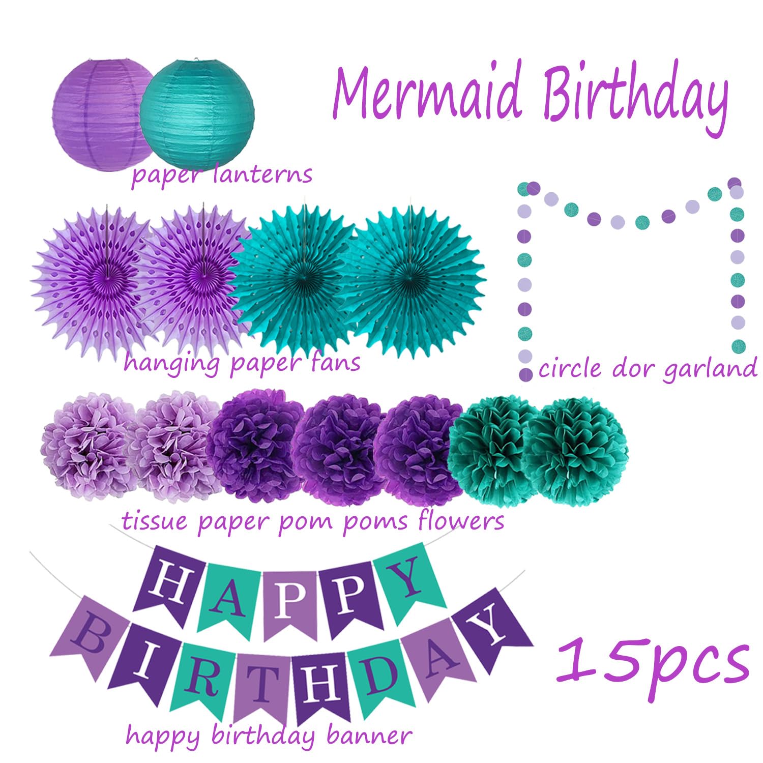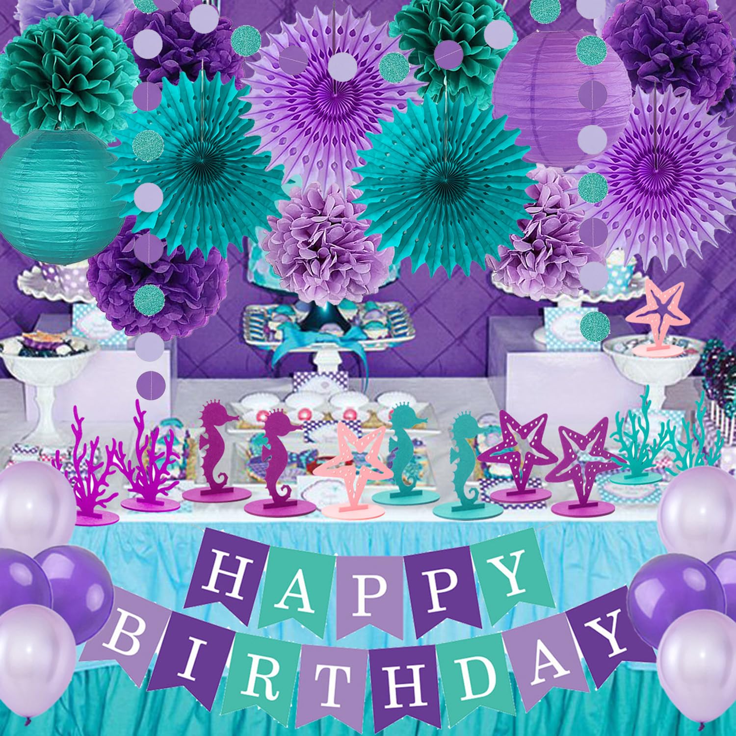 Teal Purple Lavender Party Decoration: include 1pc happy birthday banner, 1pc circle dots paper garlands, 2pcs 10inch paper lanterns, 4pcs 14inch hanging paper fans, 7pcs 10inch tissue paper pom poms flowers.