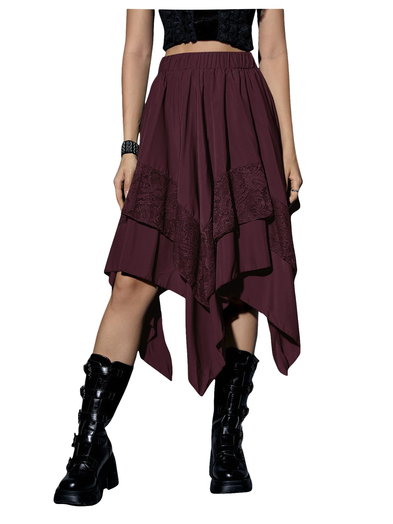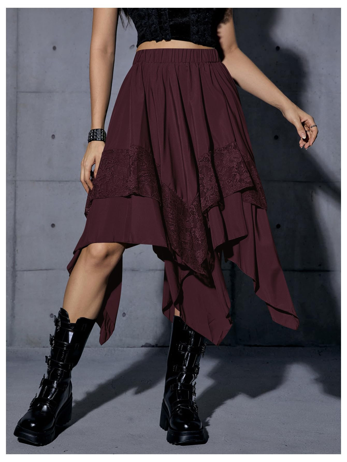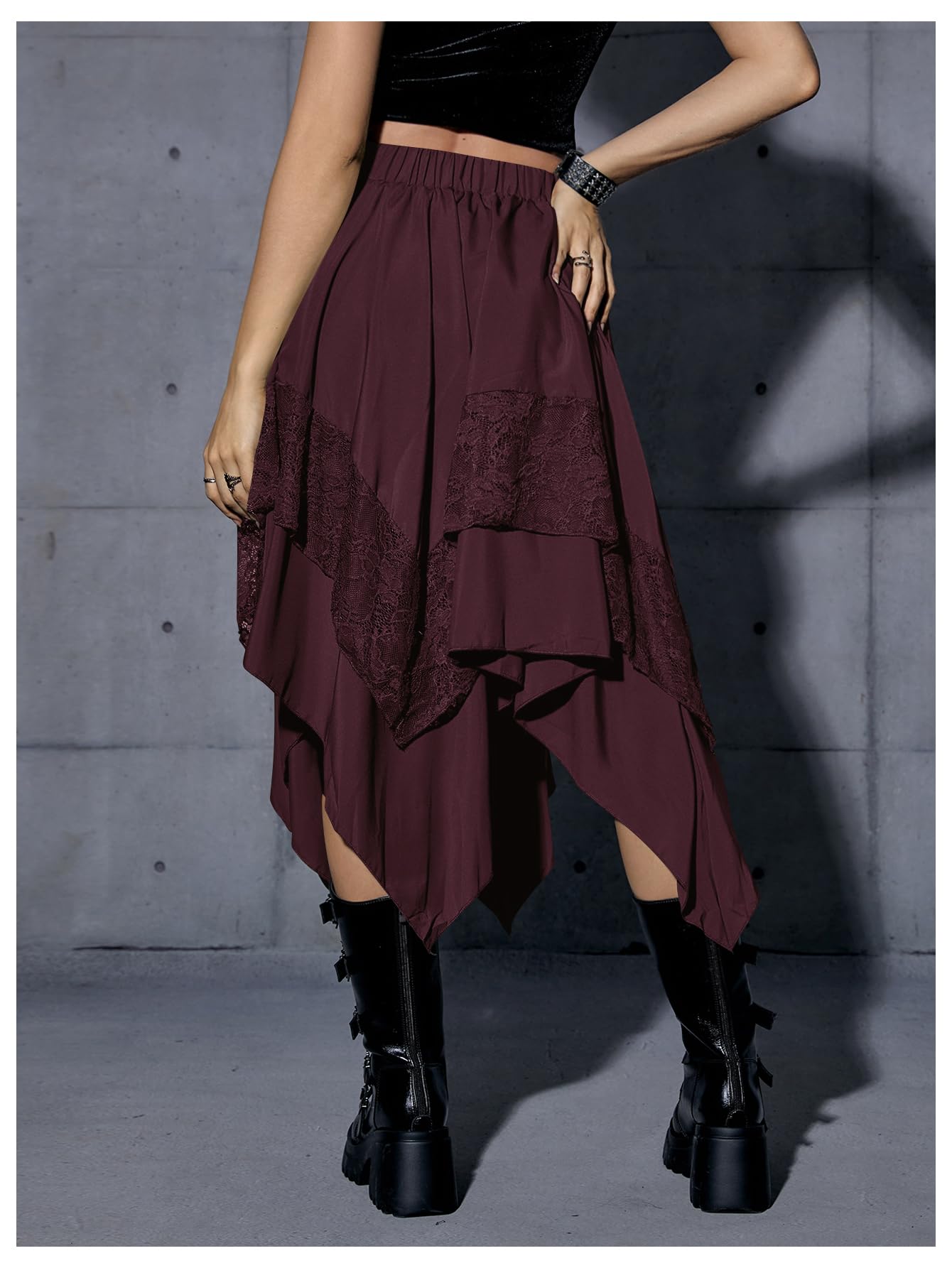 Elastic Waist, Lace Trim, Asymmetrical High Low Hem, A Line, Flowy, Gothic Steampunk Skirt, Casual Midi Skirt