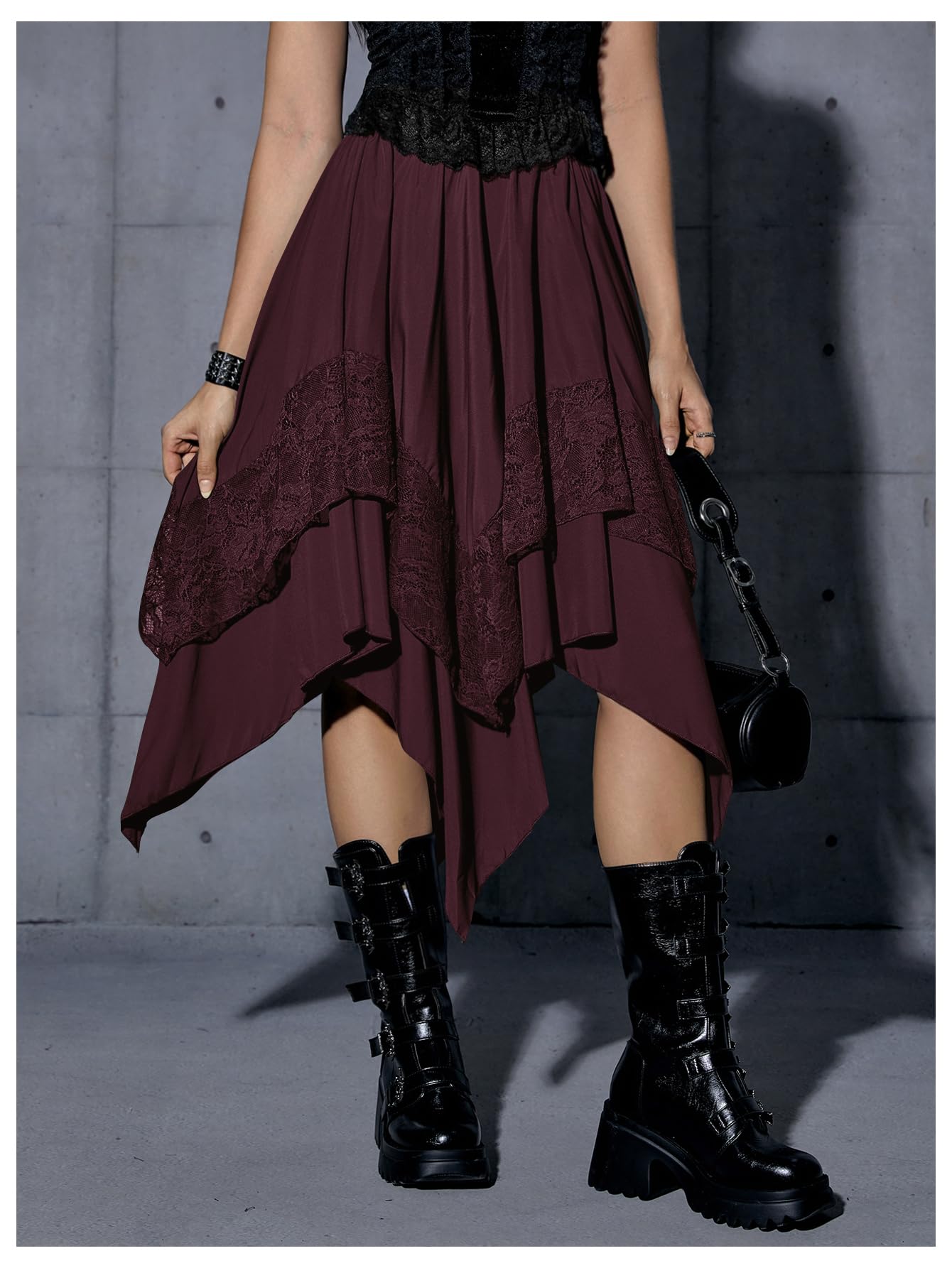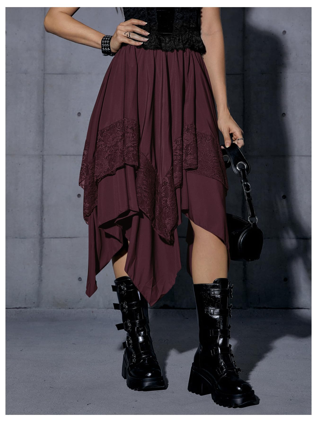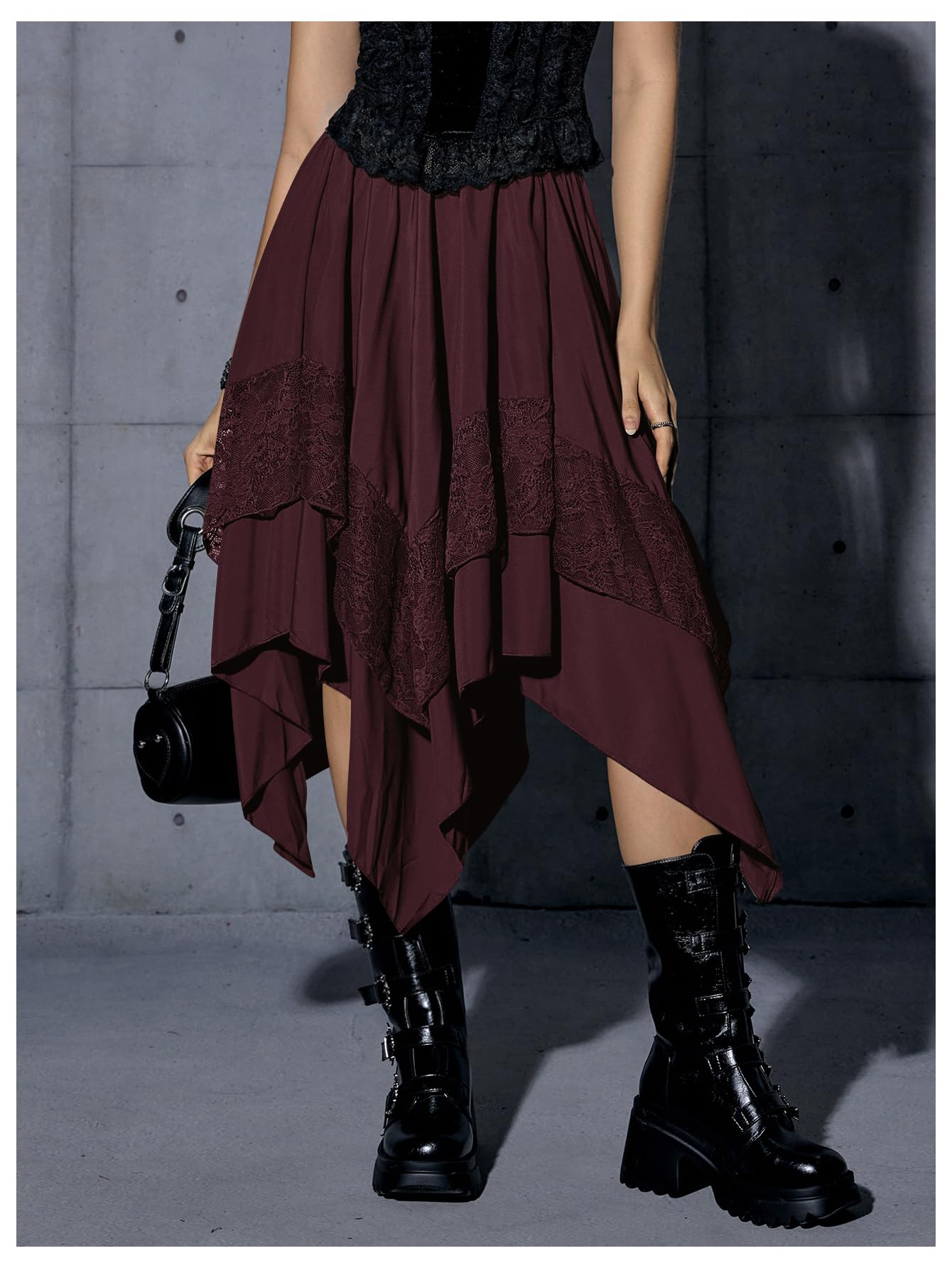Elastic Waist, Lace Trim, Asymmetrical High Low Hem, A Line, Flowy, Gothic Steampunk Skirt, Casual Midi Skirt