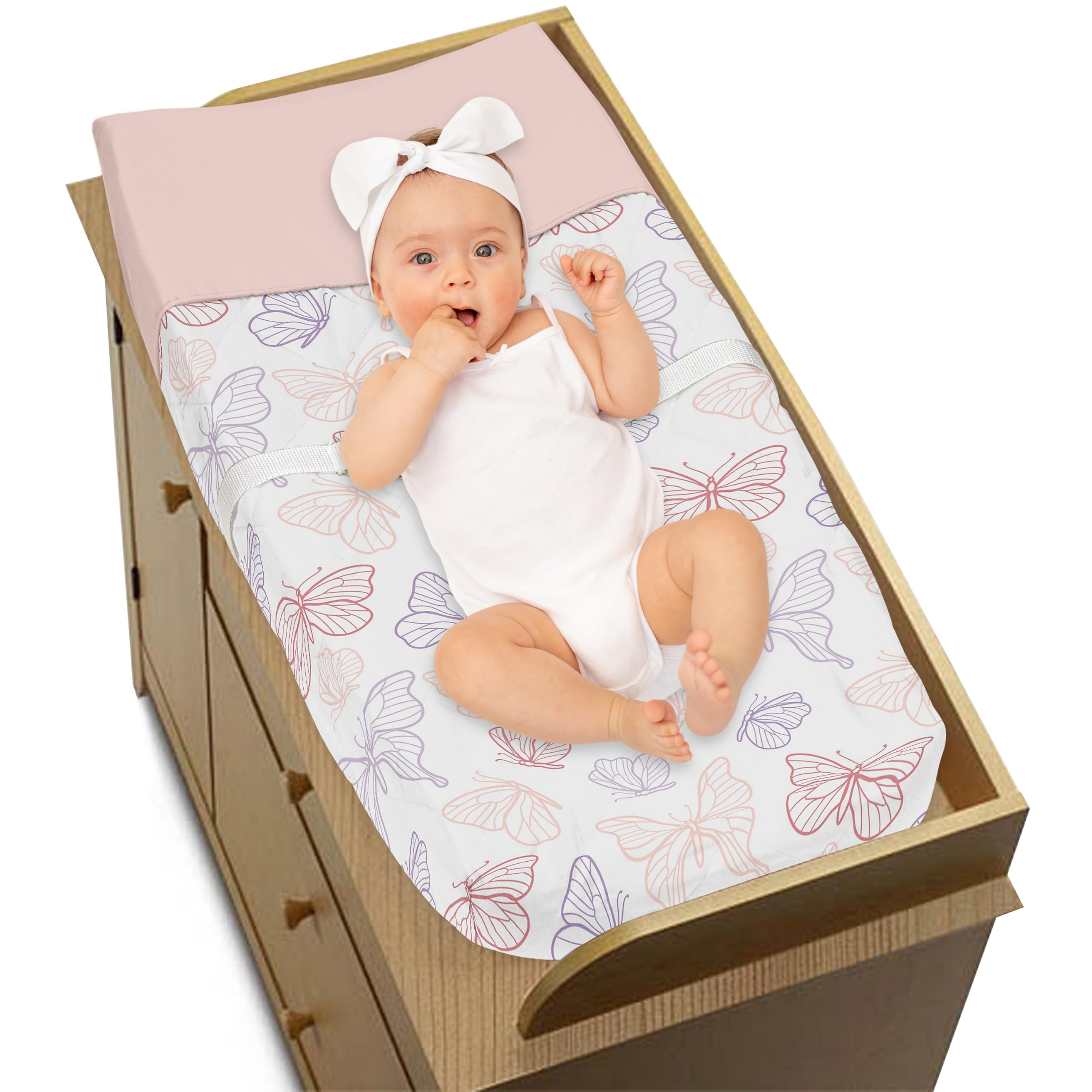 This brushed microfiber diaper pad cover features an exclusive design of a blush pink, light rose, dark lavender purple and white shabby chic butterfly print.