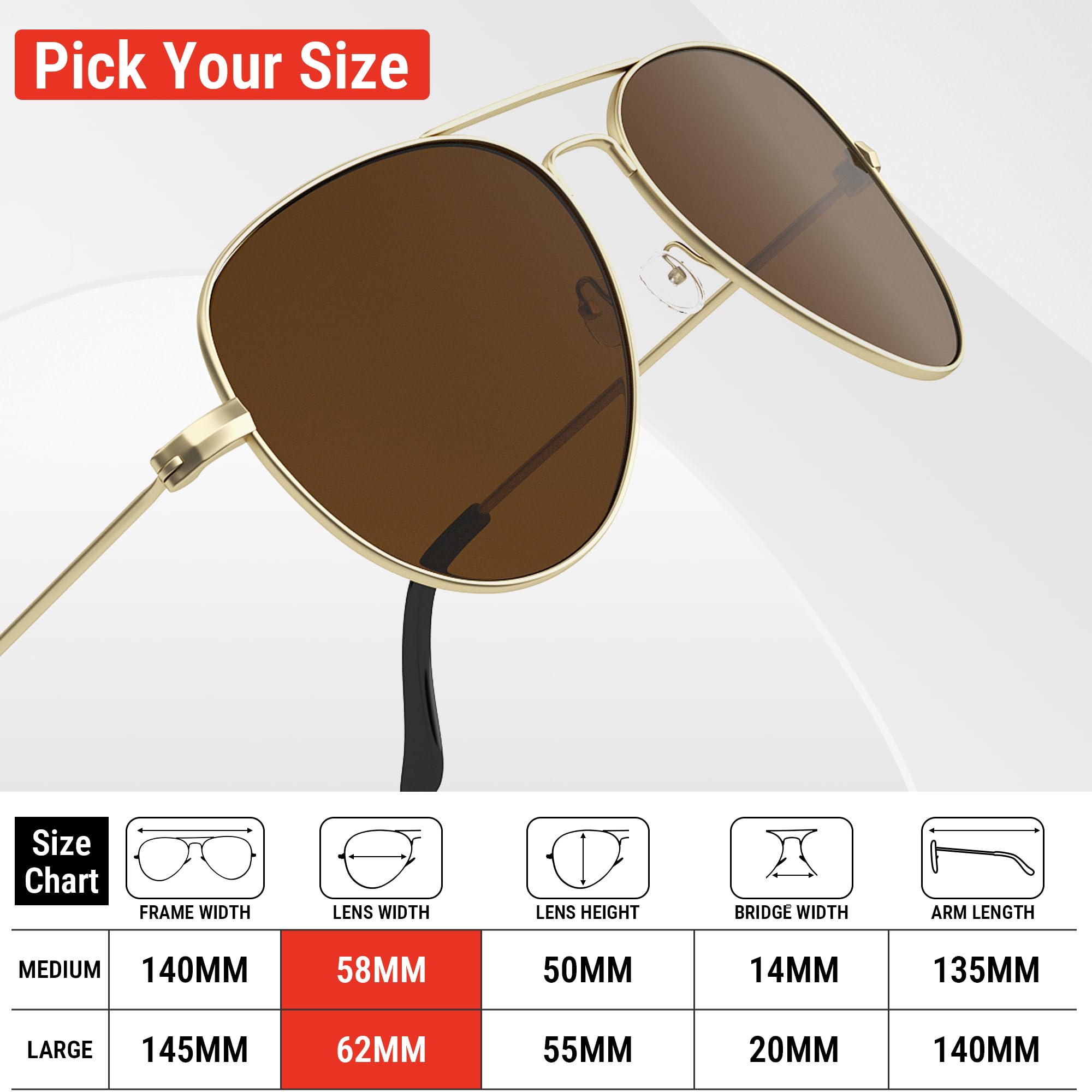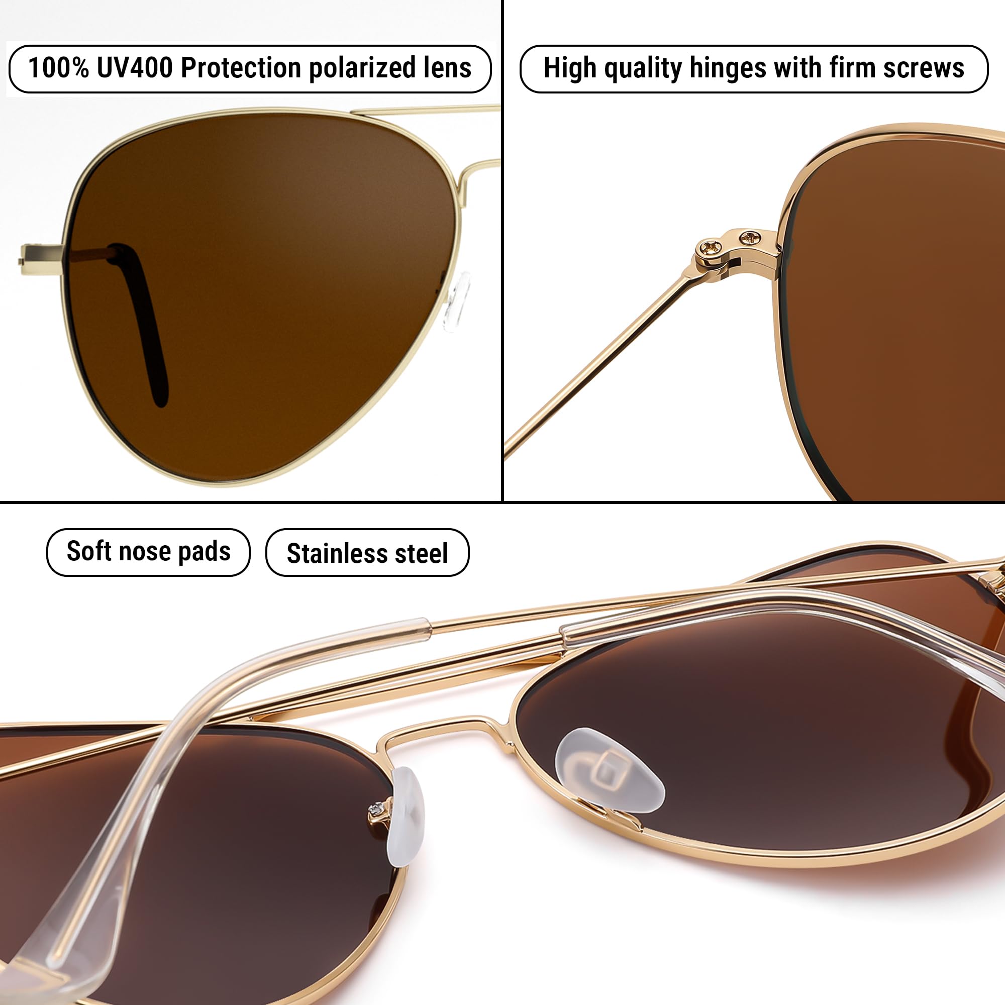 Polarized Protection: During outdoor activities, high-quality polarized glasses provide 99.9% UV400 protection and efficiently decrease glare. The classic aviator sunglasses are suitable for driving, cycling, fishing, and outdoor activities