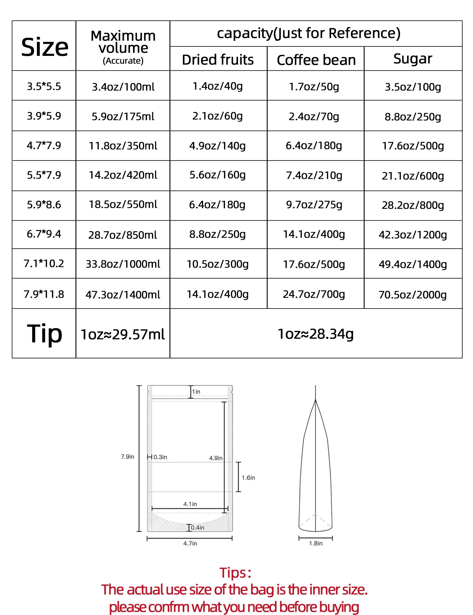 【Quantity & Material】Package include 100 pieces white kraft stand up pouches. Outer dimension:4.7*7.9 inch,Inner dimension:4.1*4.9inch; Made from food grade kraft paper and plastic, which is odorless, reusable and moisture proof, keeps your products freshness.Practical bags for packing product.