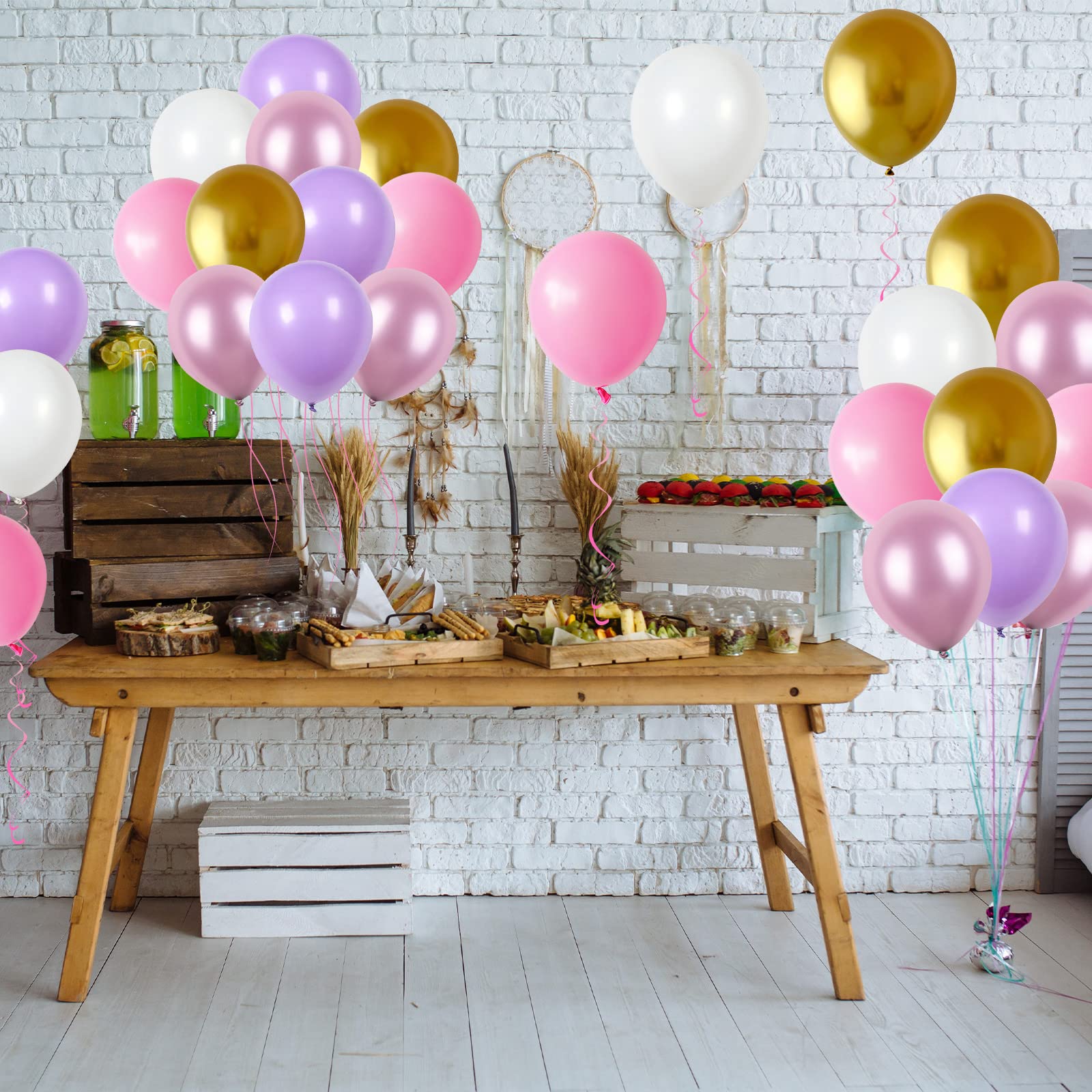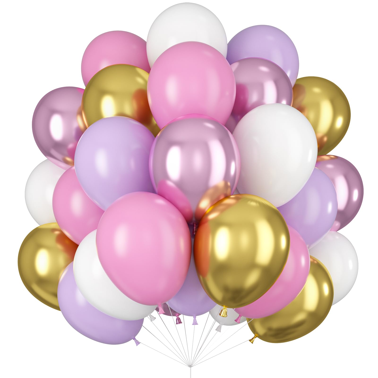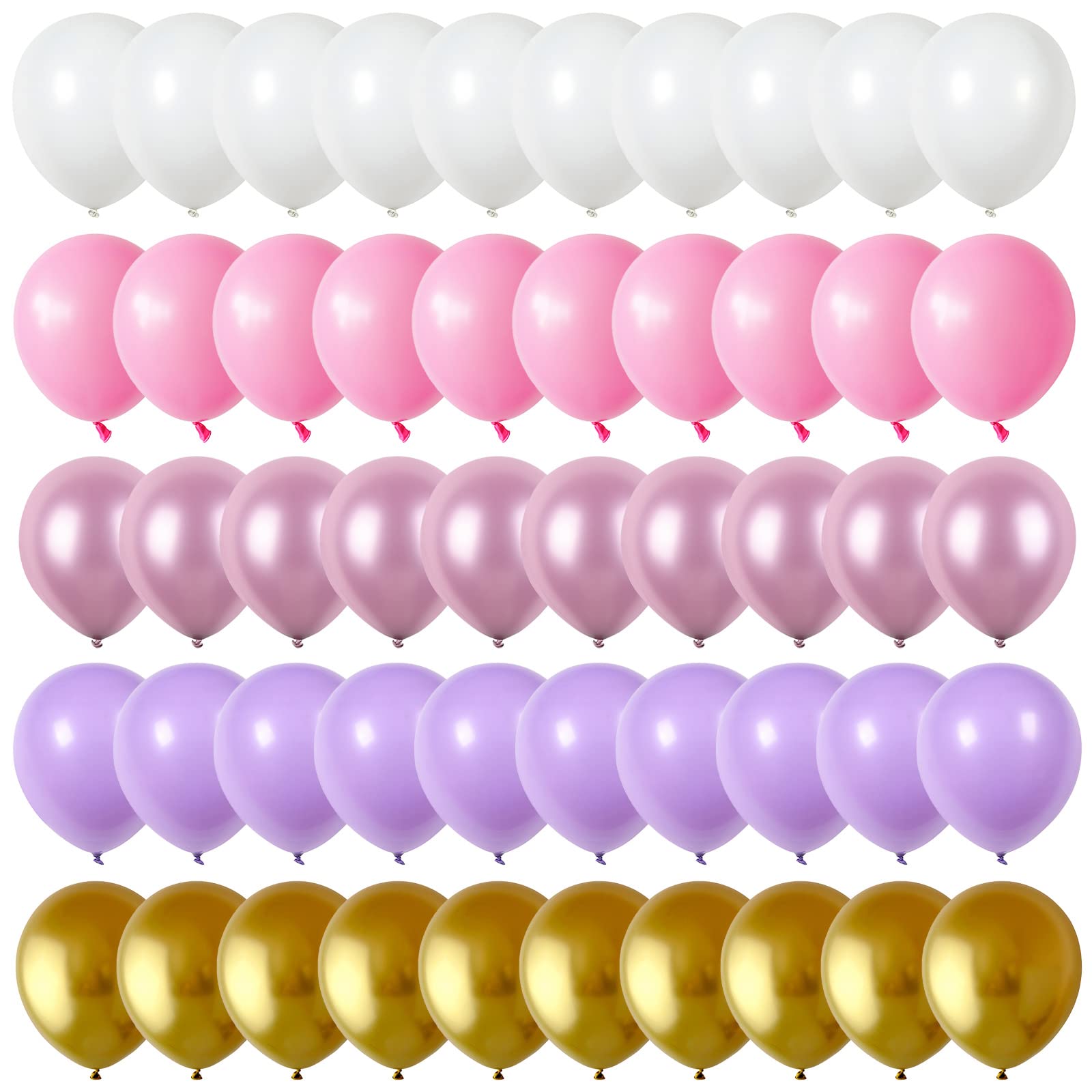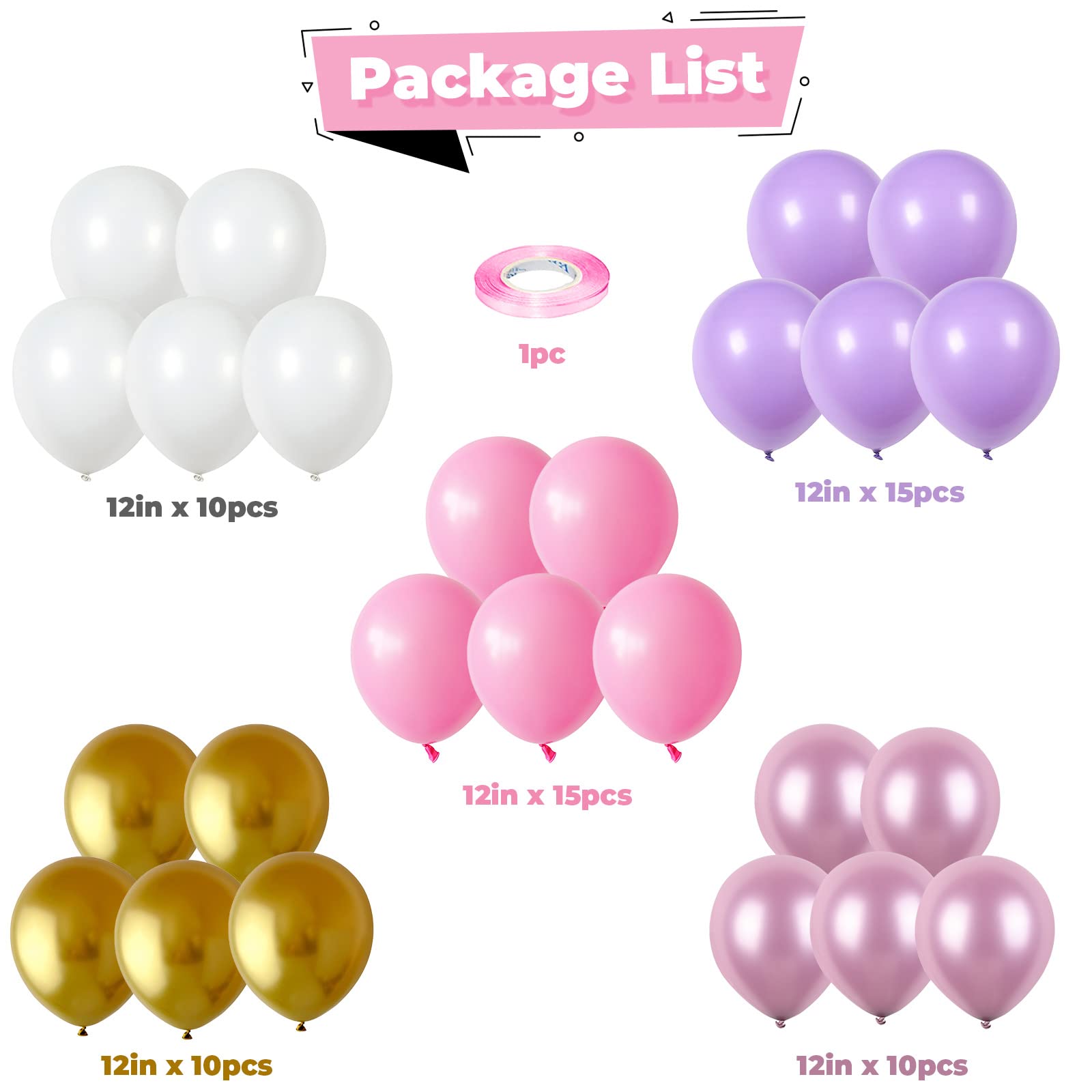 WHAT YOU GET: Purple pink white gold balloons set includes 60pcs latex balloons: 15pcs 12inch pastel purple balloons, 15pcs 12inch matte pink balloons, 10pcs 12inch matte white balloons, 10pcs 12inch chrome light purple balloons, 10pcs 12inch metallic gold balloons, 1 roll of ribbon, ideal for making balloon garland, balloon arch