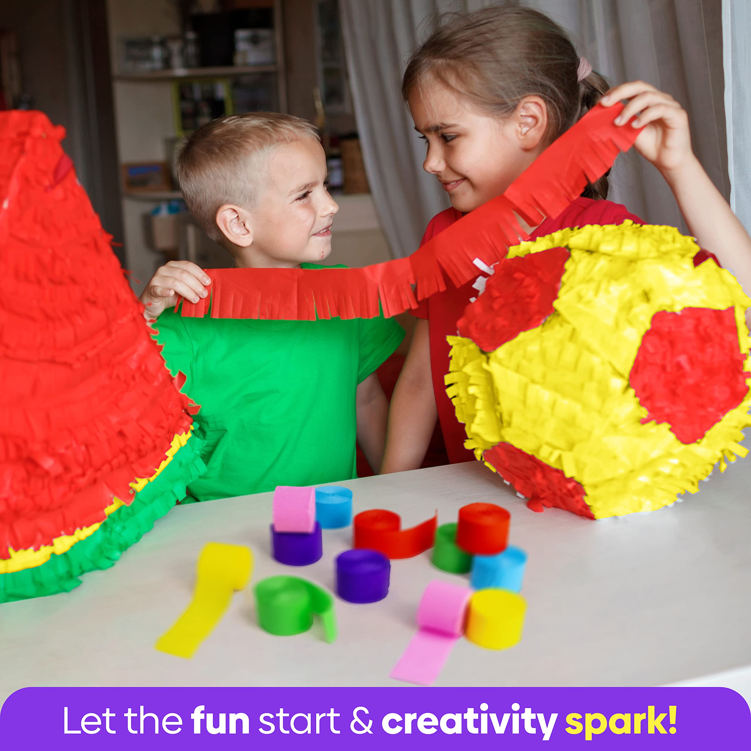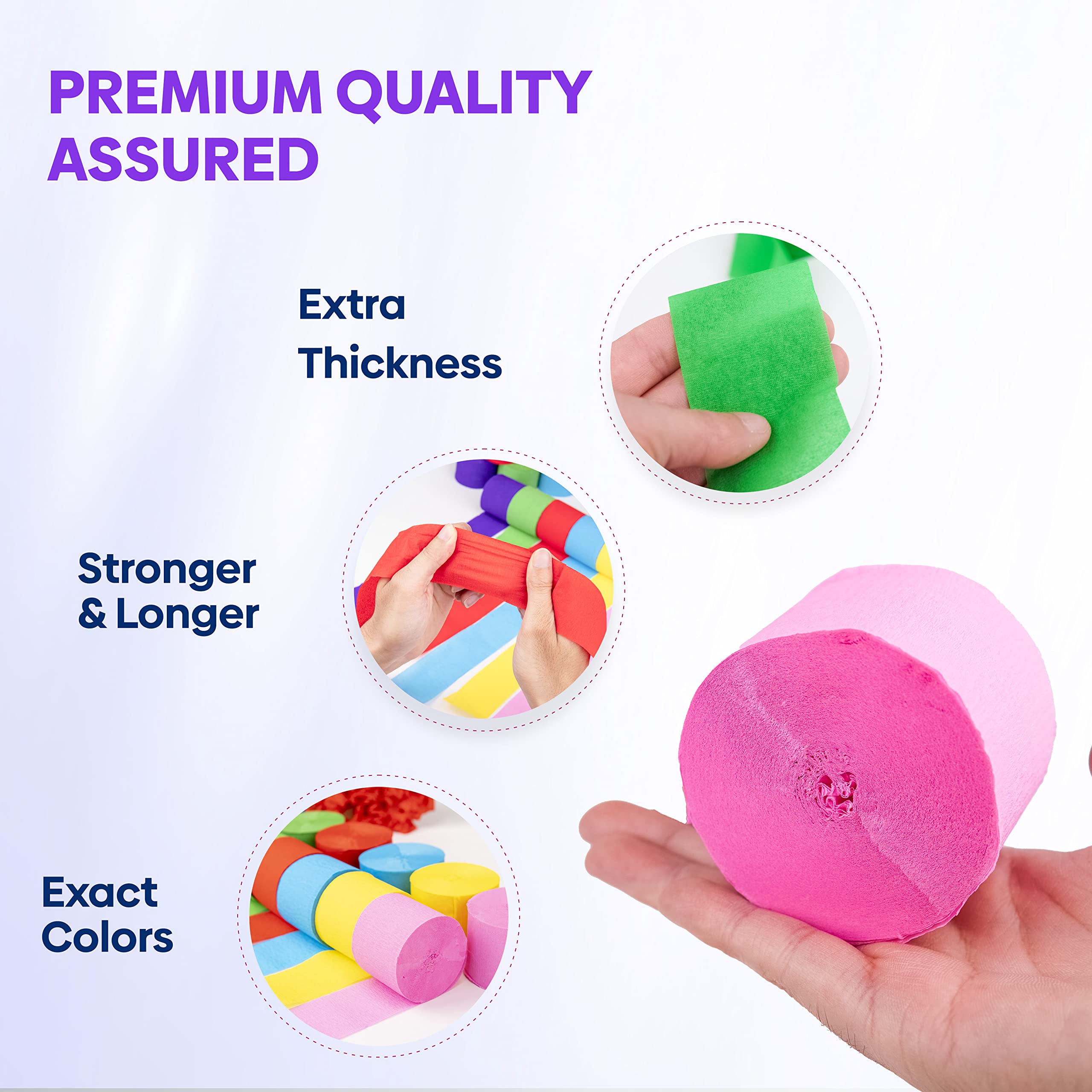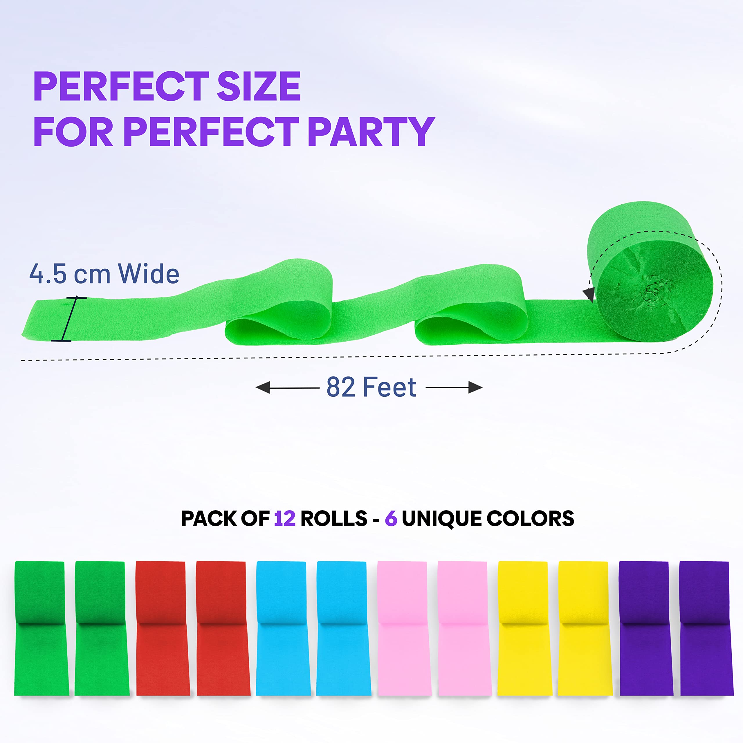 Vibrant Streamers Multipack: Our vibrant set of 12 crepe paper streamers, perfect for any festive decorations. Includes Soft Pink, Vibrant Yellow, Bright Green, Deep Sky Blue, Bright Red, and Rich Purple. Each roll measures a generous 1.8 inches by 82 feet, ensuring ample coverage for large party decorations.