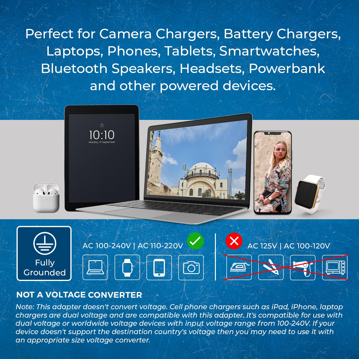 Important: This is just a travel adapter, it will not work with devices that require a voltage converter. It will only work with dual voltage products such as cell phones, chargers, & laptops etc.