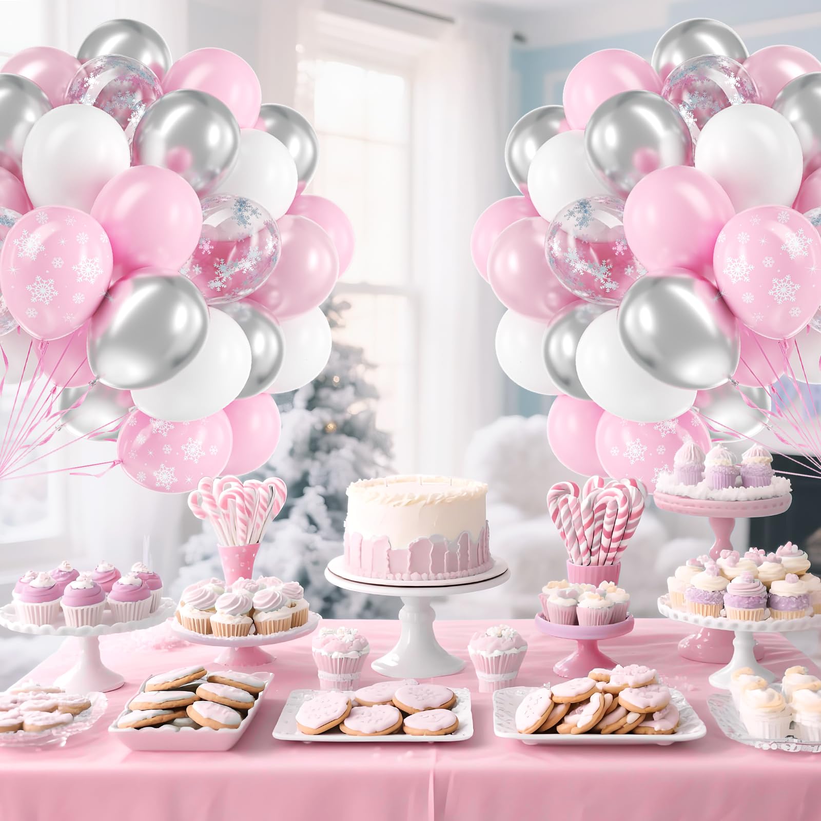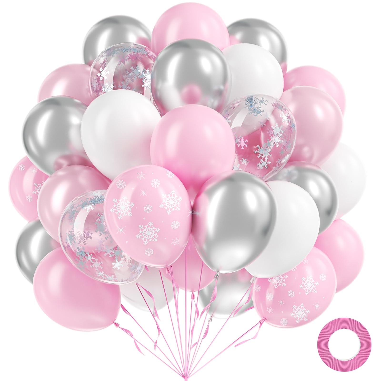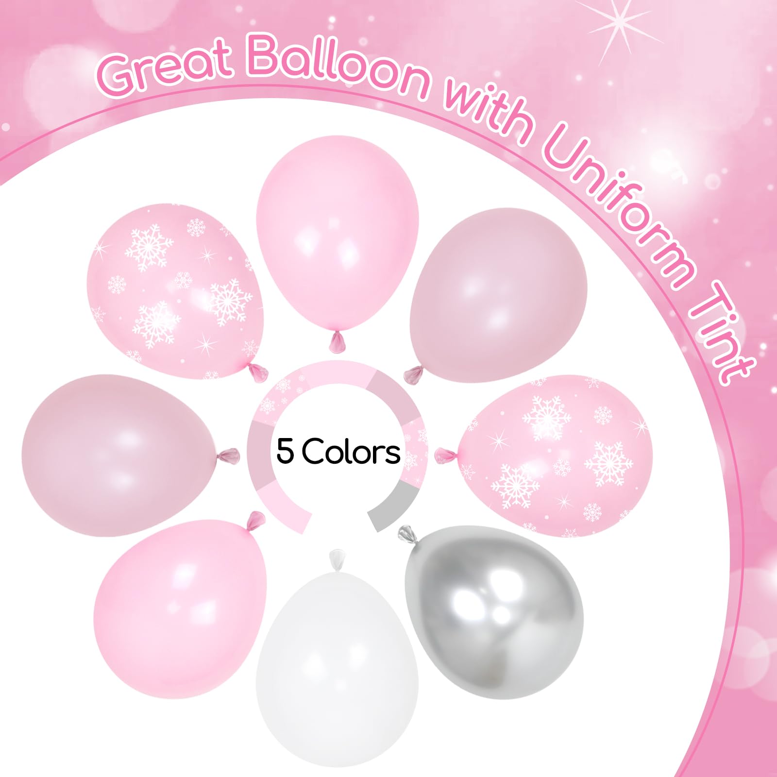 What You Get: The package includes 12inch pink balloonsx10, 12inch white balloonsx10, 10inch metallic silver balloonsx10, 12inch pearl pink balloonsx10, 12inch pink snowflake print balloonsx10, 12inch snowflake confetti balloonsx10, pink ribbonx1, glue dotsx20