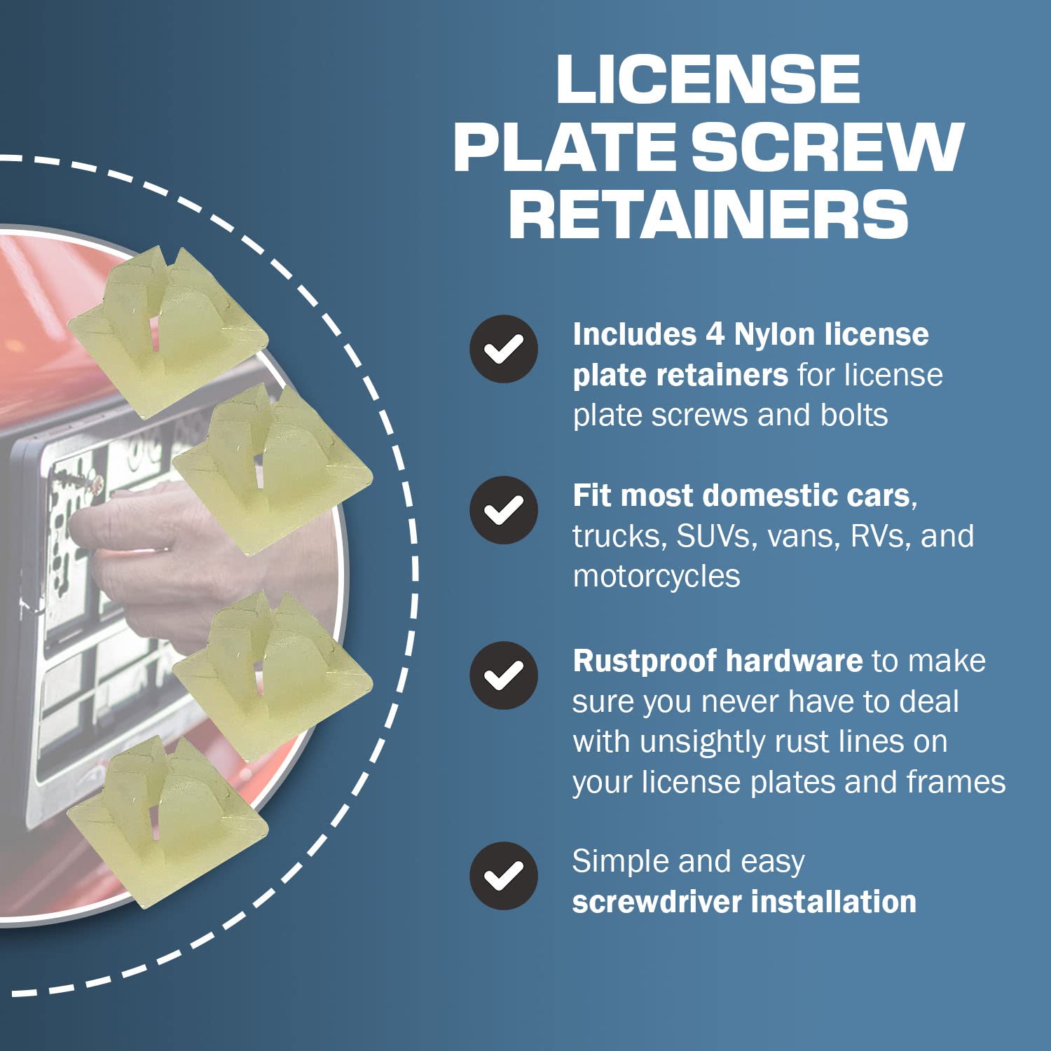 OEM Style License Plate Screw Retainers: This set includes 4 nylon license plate nut bracket clip fastener retainers for license plate screws and bolts. They fit vehicles that use 1/4" diameter x 3/4" long self-tapping screws.