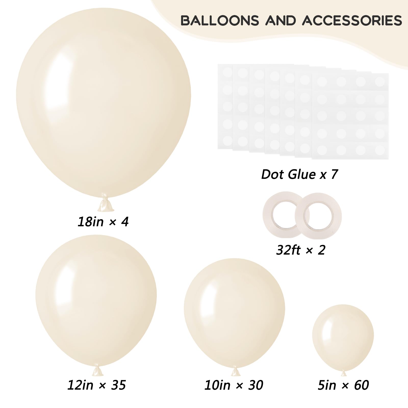 IVORY WHITE PARTY BALLOONS KIT: Includes 129 ivory white balloons - 18inch 4pcs, 12inch 35pcs, 10inch 30pcs, 5inch 60pcs and 7 pieces of glue, 2 rolls of ribbon of the same color. These ivory white balloons with different sizes can meet your needs.