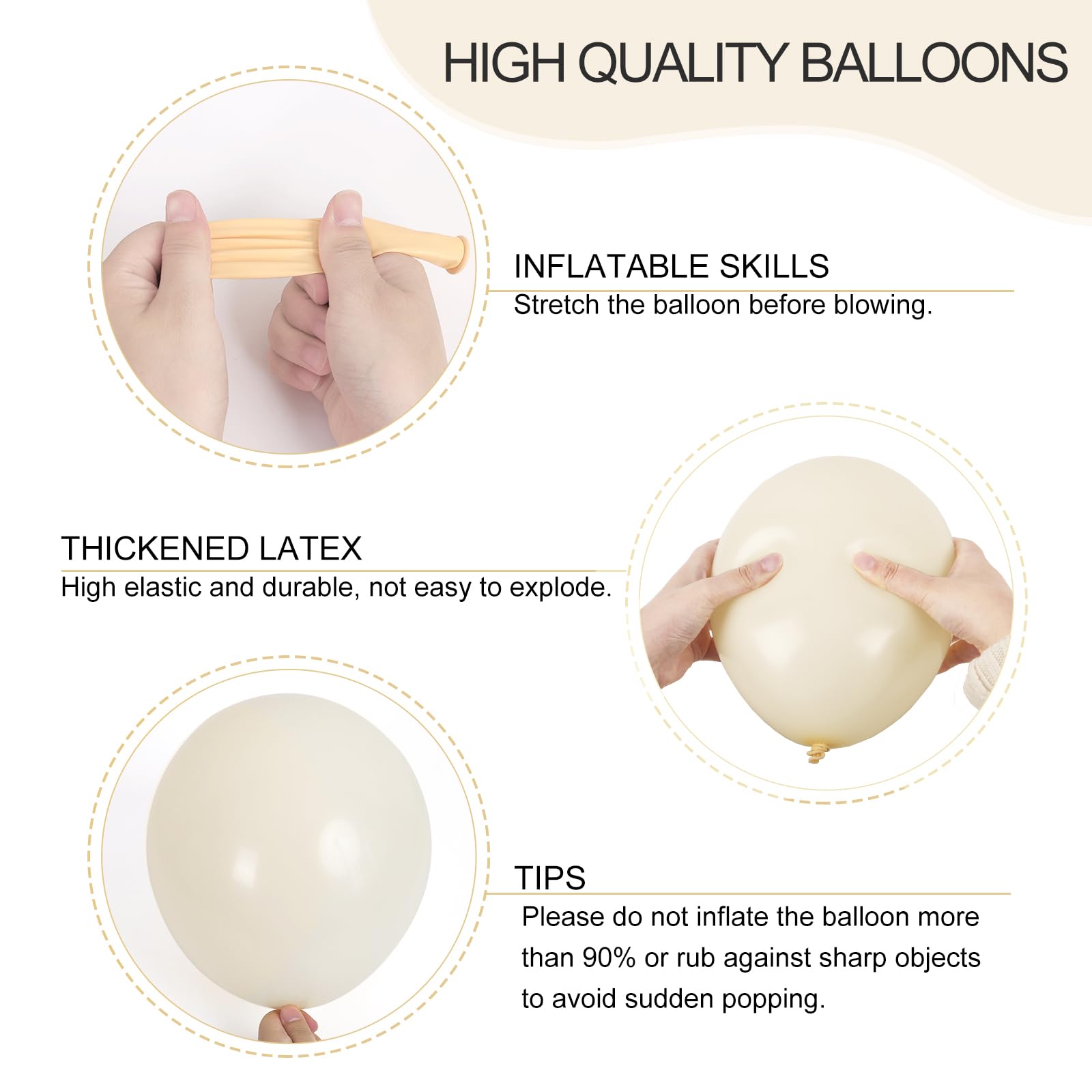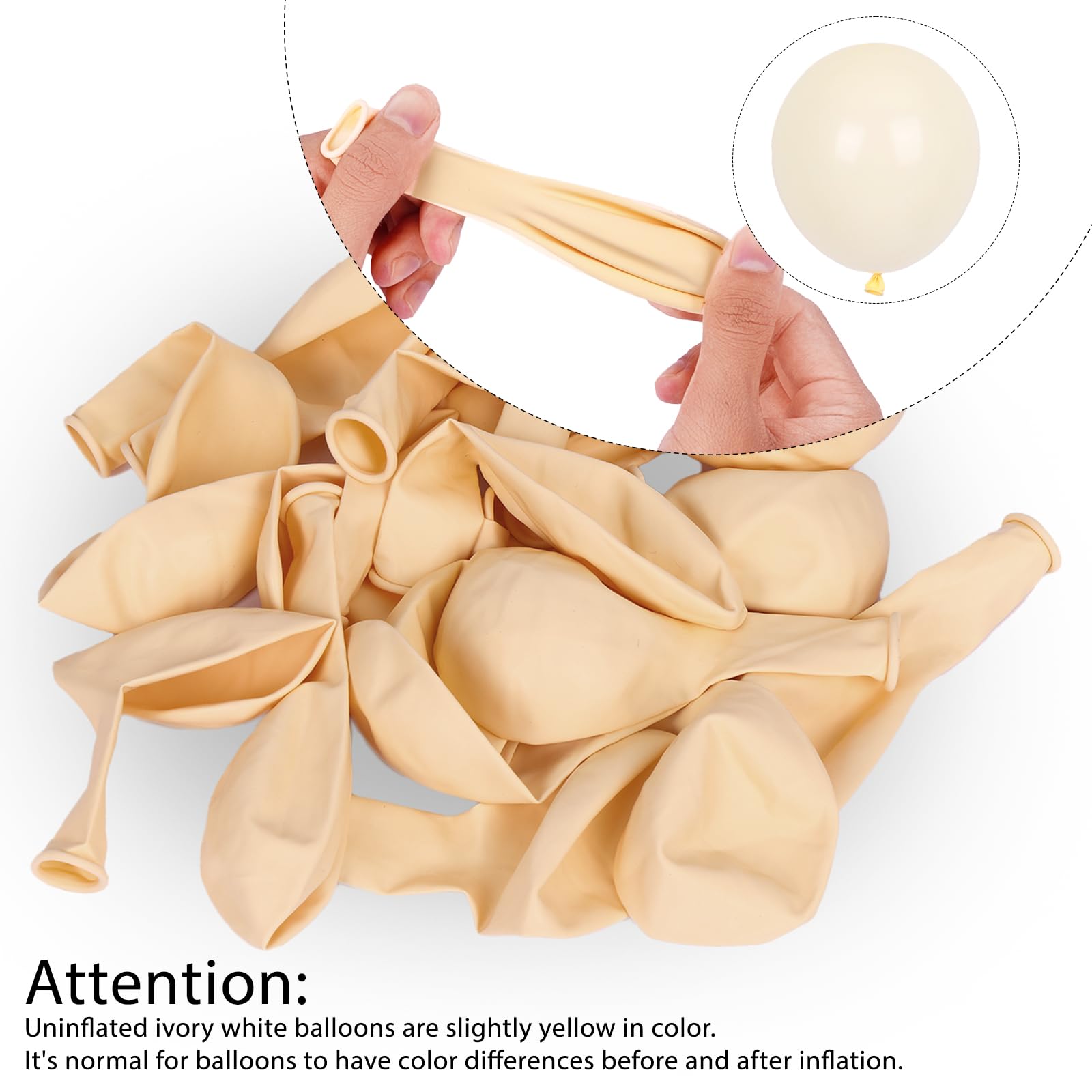 PREMIUM QUALITY: The ivory white balloons are made of premium quality latex, which are sustained. Latex balloons can be filled with air and helium. Please do not rub against overheated and sharp objects to avoid sudden popping.
