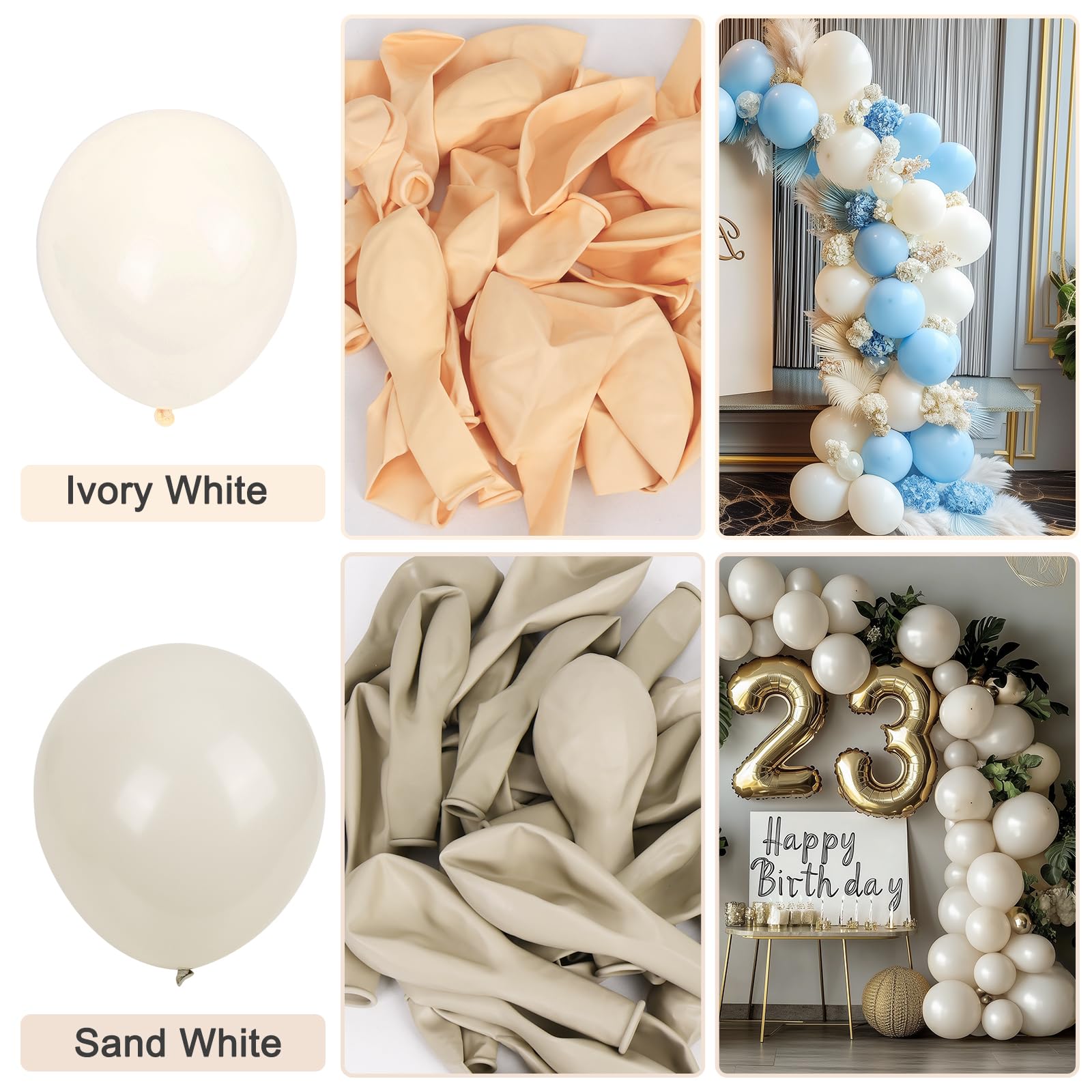 WIDE APPLICATION: Different sizes ivory white balloons are not only suitable for celebratory, anniversary activity, indoor and outdoor themed party decorations, but also for birthday party, wedding, baby shower, gender reveal, bridal shower, engagement party, Valentine's Day, and other events. You can use it alone or mix with other balloons to make balloon garland and create good memories.