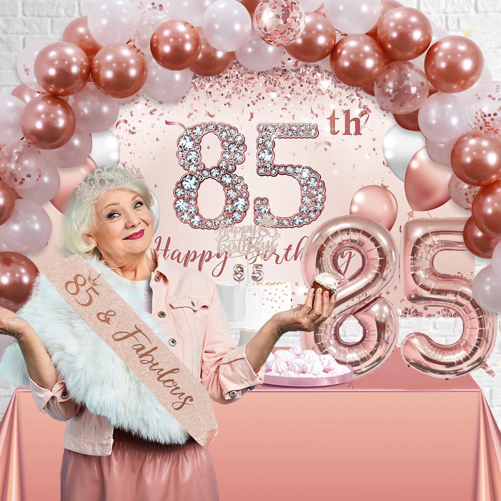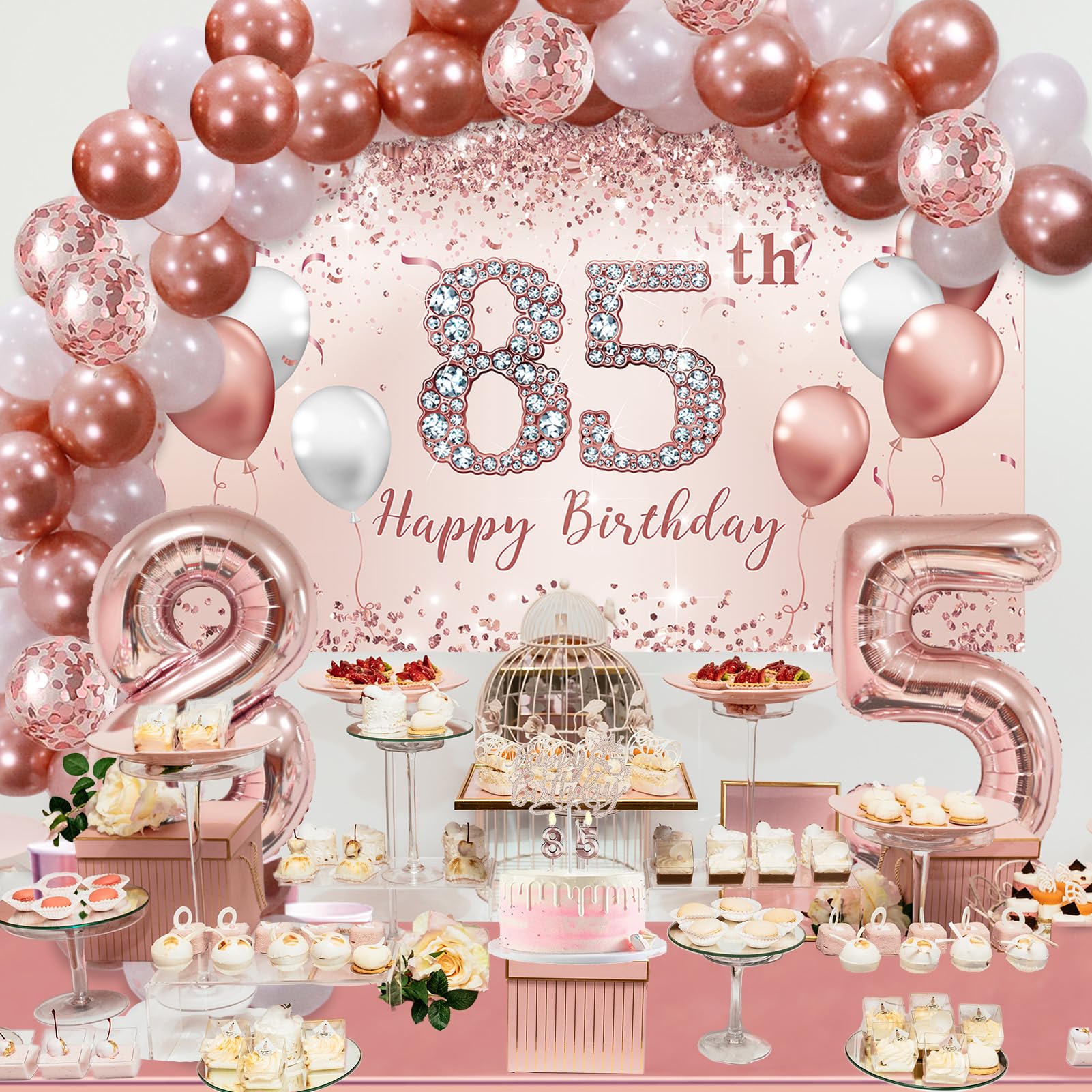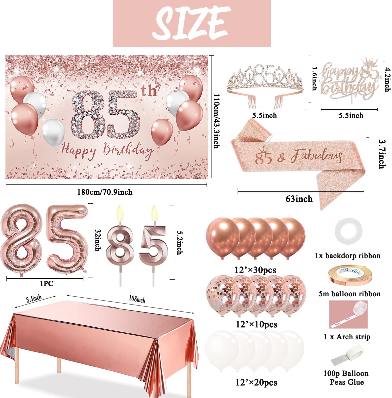 [85th Birthday] Package Included:1pc 85th party banner, 1pc pink 85 birthday crown, 1pc sash and a pearl pin, 1pc happy 85th birthday cake topper, number 85 balloons 32inches, 1pc rose gold tablecloth.and 60 latex balloons The 85th birthday decoration set will heighten the excitement of the women 85th birthday party