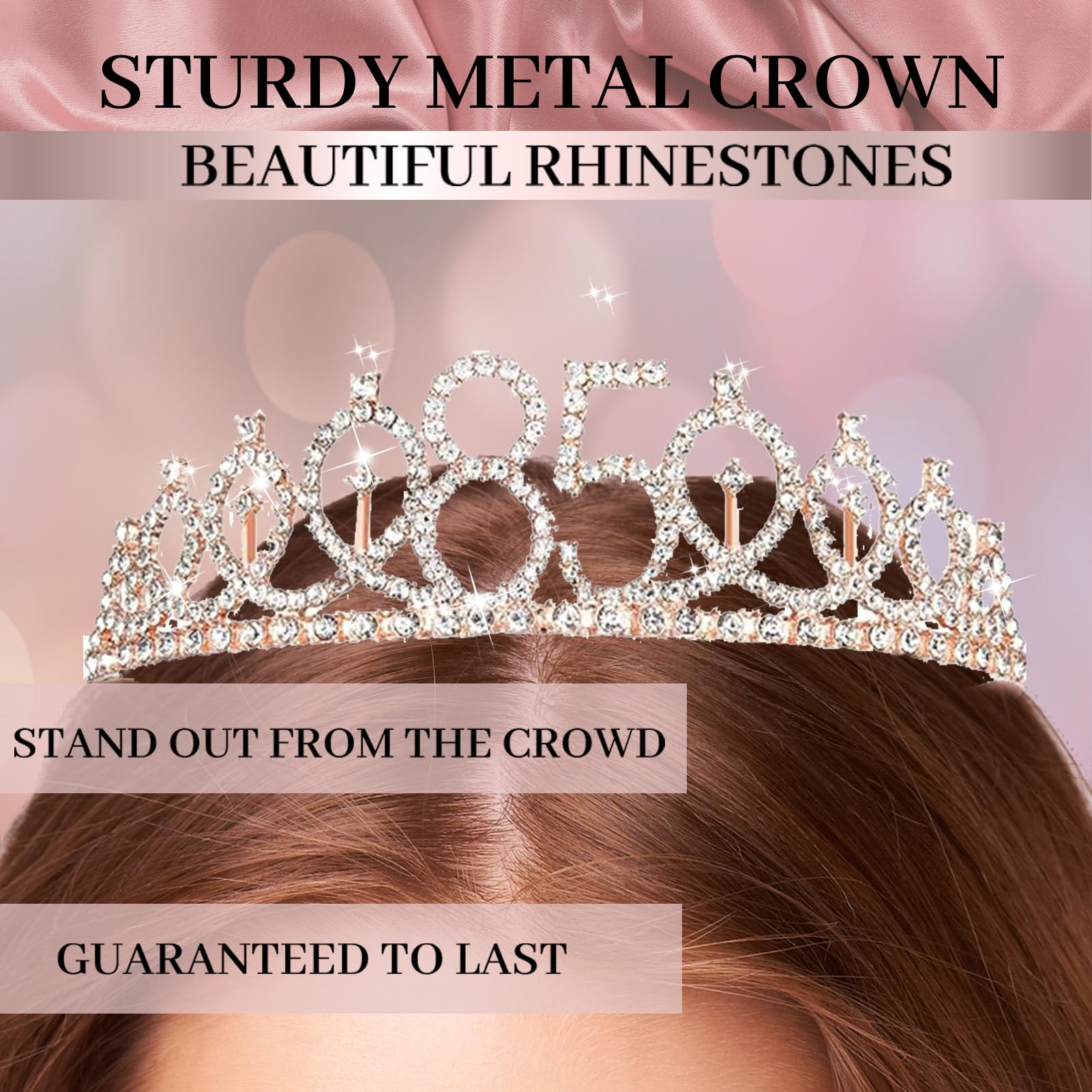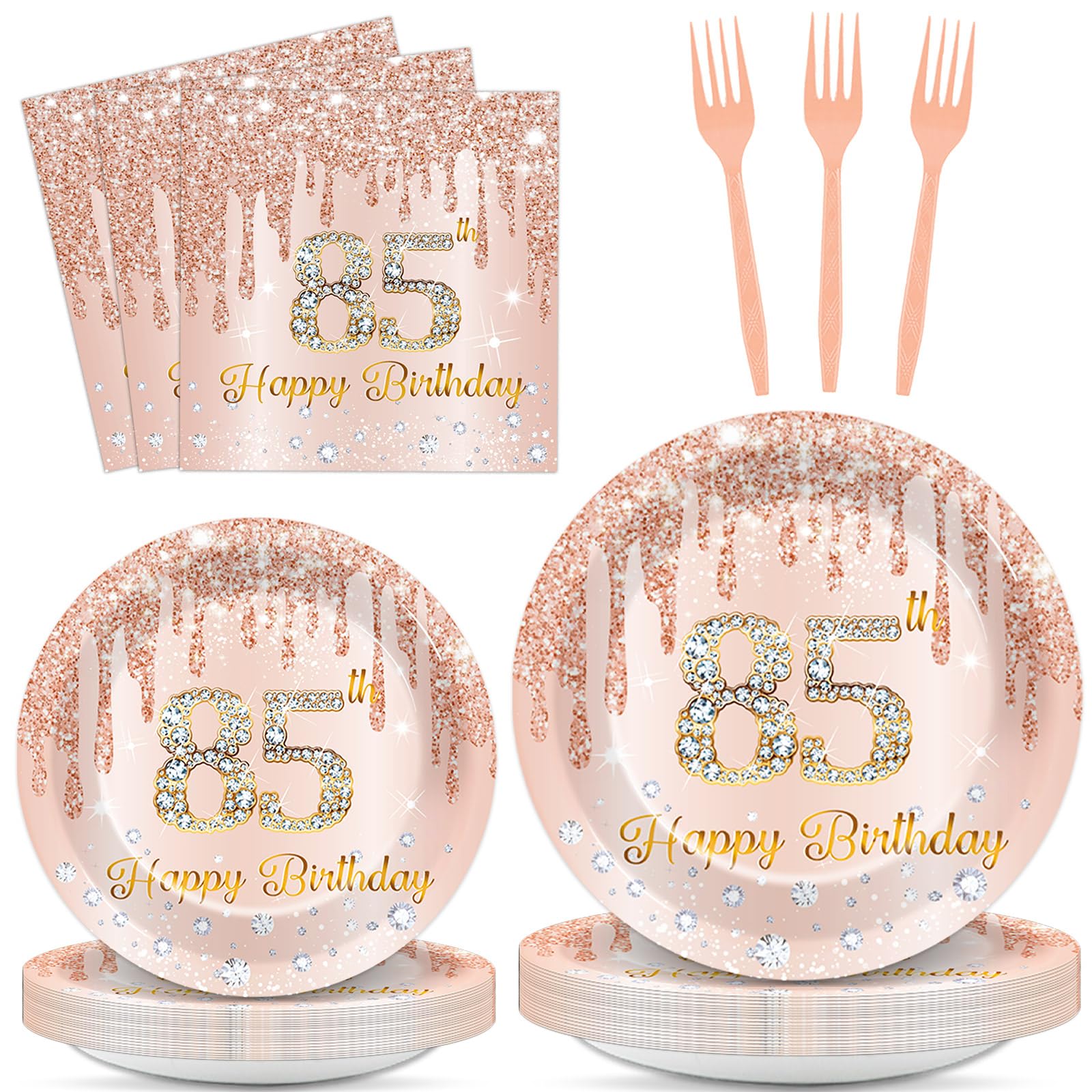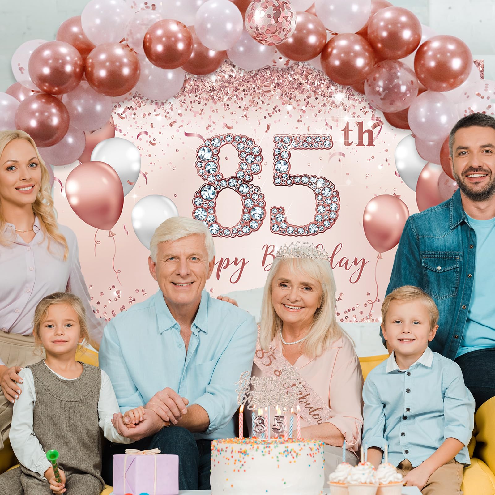 [85th Birthday] Package Included:1pc 85th party banner, 1pc pink 85 birthday crown, 1pc sash and a pearl pin, 1pc happy 85th birthday cake topper, number 85 balloons 32inches, 1pc rose gold tablecloth.and 60 latex balloons The 85th birthday decoration set will heighten the excitement of the women 85th birthday party