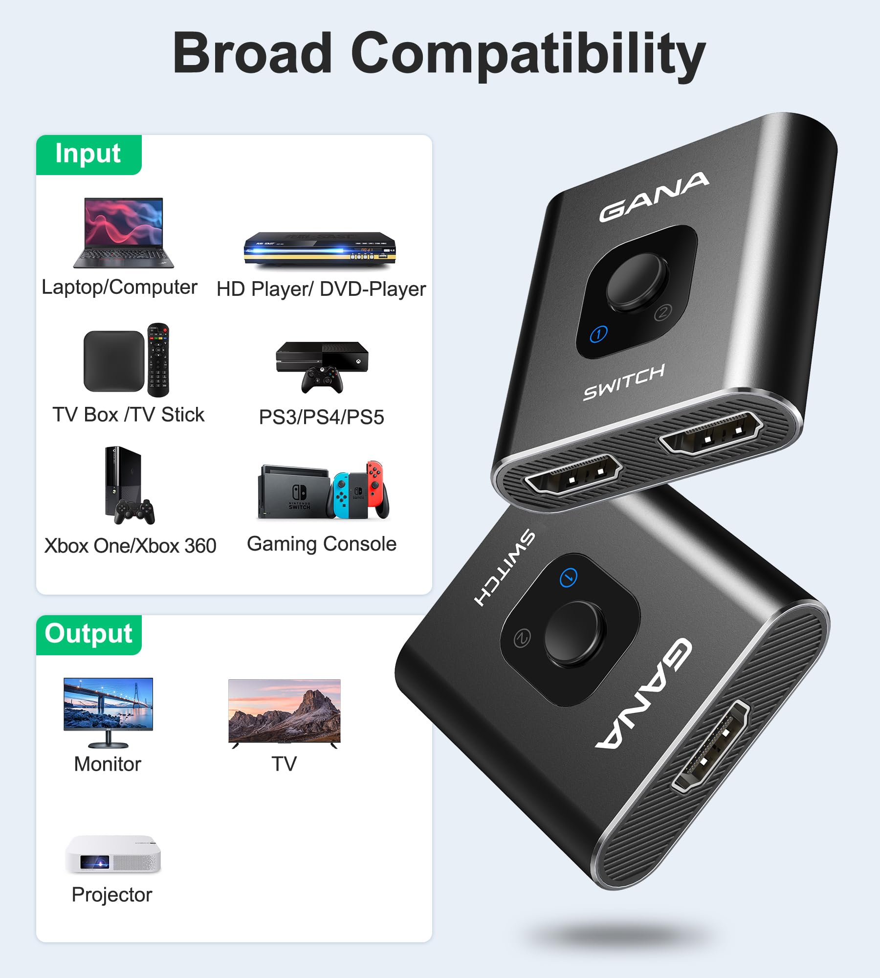 【Broad Compatibility】 HDMI Splitter Switcher compatible for most standard HDMI port devices. Support Input: Laptops, computer, XBox 360, XBox One, PS4/ PS5 ,Blu-Ray DVD player etc. Output: HD-Ready or Full HD TVs, monitors, projectors etc.