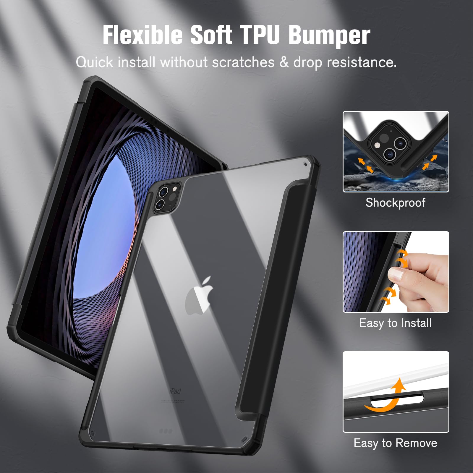 Hardshell back cover with flexible TPU bumper protects your iPad from shocks, drops and impacts. Soft microfiber interior front prevents your tablet from scratched. And the crystal clear back cover will proudly show off the Apple icon.