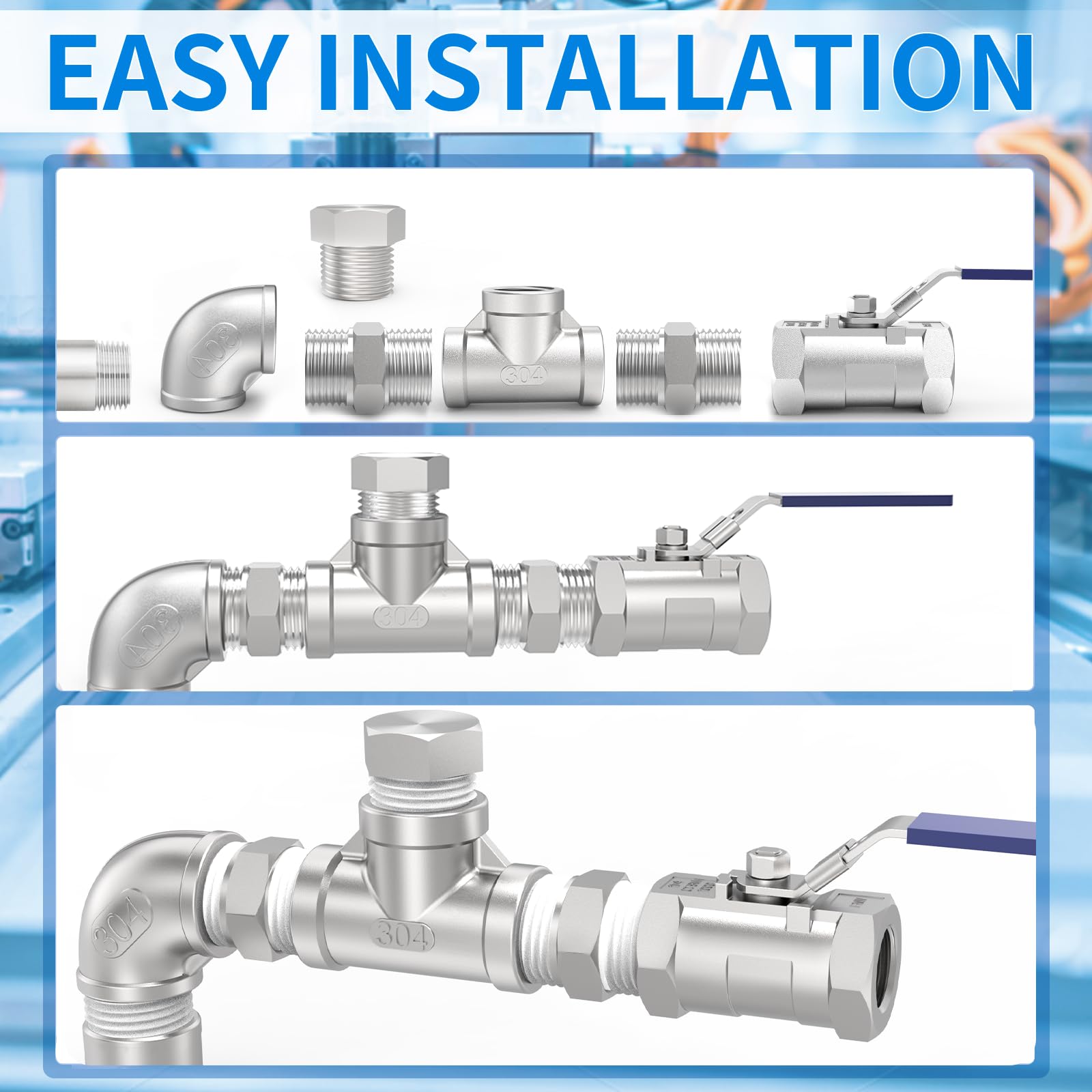 Pipe fittings are the components in the pipeline system that play the roles of connection, control, reversal, diversion, sealing, and support. Note that the 304 Stainless Steel Tee fittings are US NPT standard threads with a 60 degree taper. Product introduction: 1. It is used to connect male threaded pipe fittings of the same diameter. NPT female and male threads are hard connected and do not require sealing in most cases. 2. It is suitable for most gases, water, oils and corrosive liquids. Widely used in grease, fuel, refrigeration, water, instrumentation, oil and gas and hydraulic systems. 3. Thicker wall design for longer service life, three openings for connecting with branch fittings, and can be connected to a pressure gauge to measure the pressure of the fluid passing through. 4. The threads are smooth and clear, easy to install, and a sufficient number of threads are designed to ensure that the joint is stronger after tightening and prevent loosening. To ensure a seal, Teflon tape can be used, just wrap a few turns around the threads. 5. When purchasing pipe fittings, consider the application as this will affect the material type, shape, size and desired durability. Fittings are threaded or unthreaded and come in many shapes, styles, sizes and schedules (wall thickness) PACKAGE INCLUDED: 2 x 1" x 1" x 1" NPT Female Tee Fitting 1 x Teflon tape