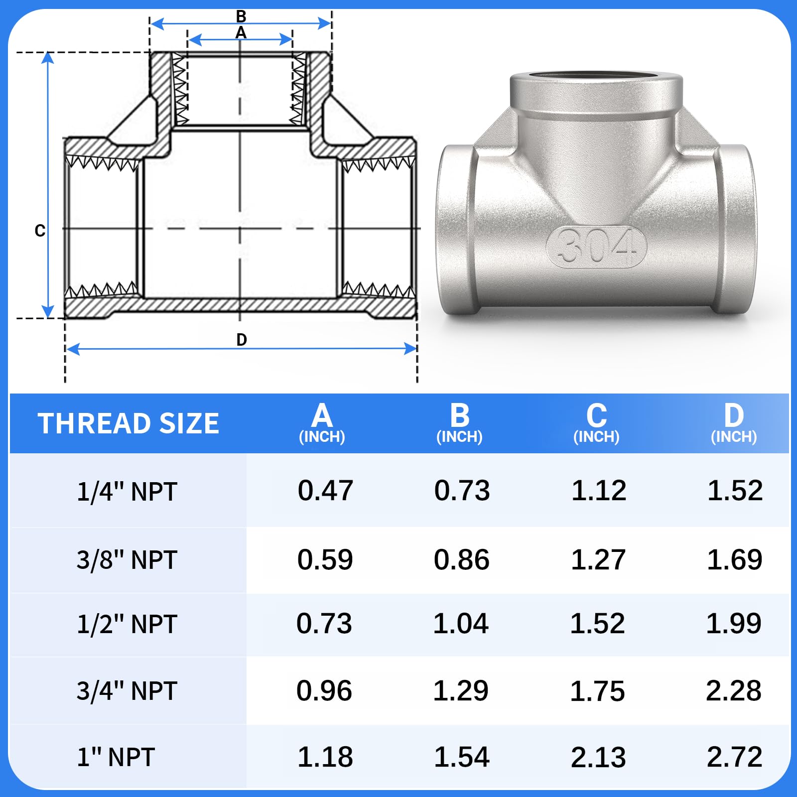 SIZE - 1" x 1" x 1" NPT Female Tee Fitting. Note, NPT thread is the nominal pipe size and does not represent the actual diameter, please refer to the dimension drawing for specific diameter.