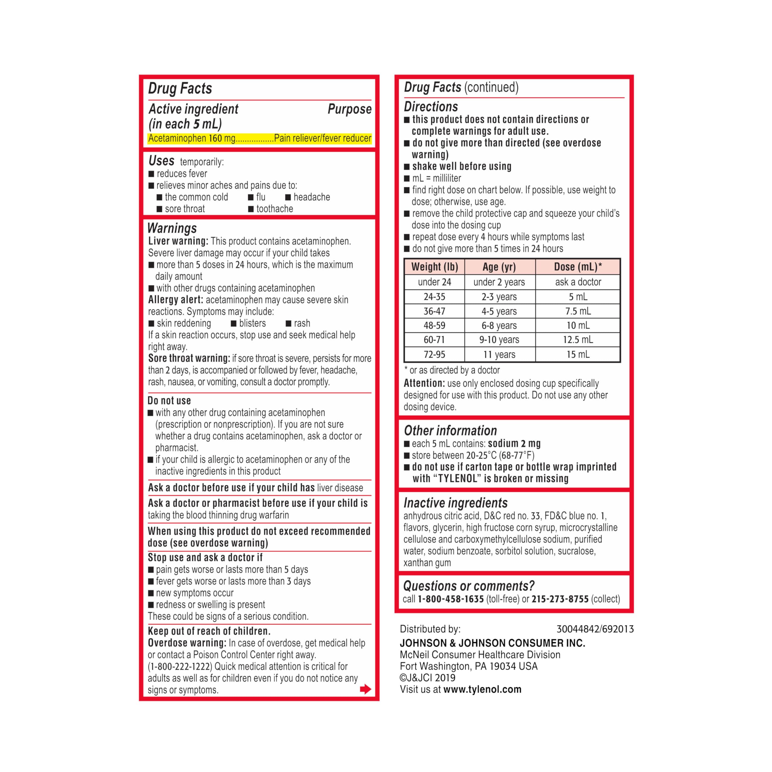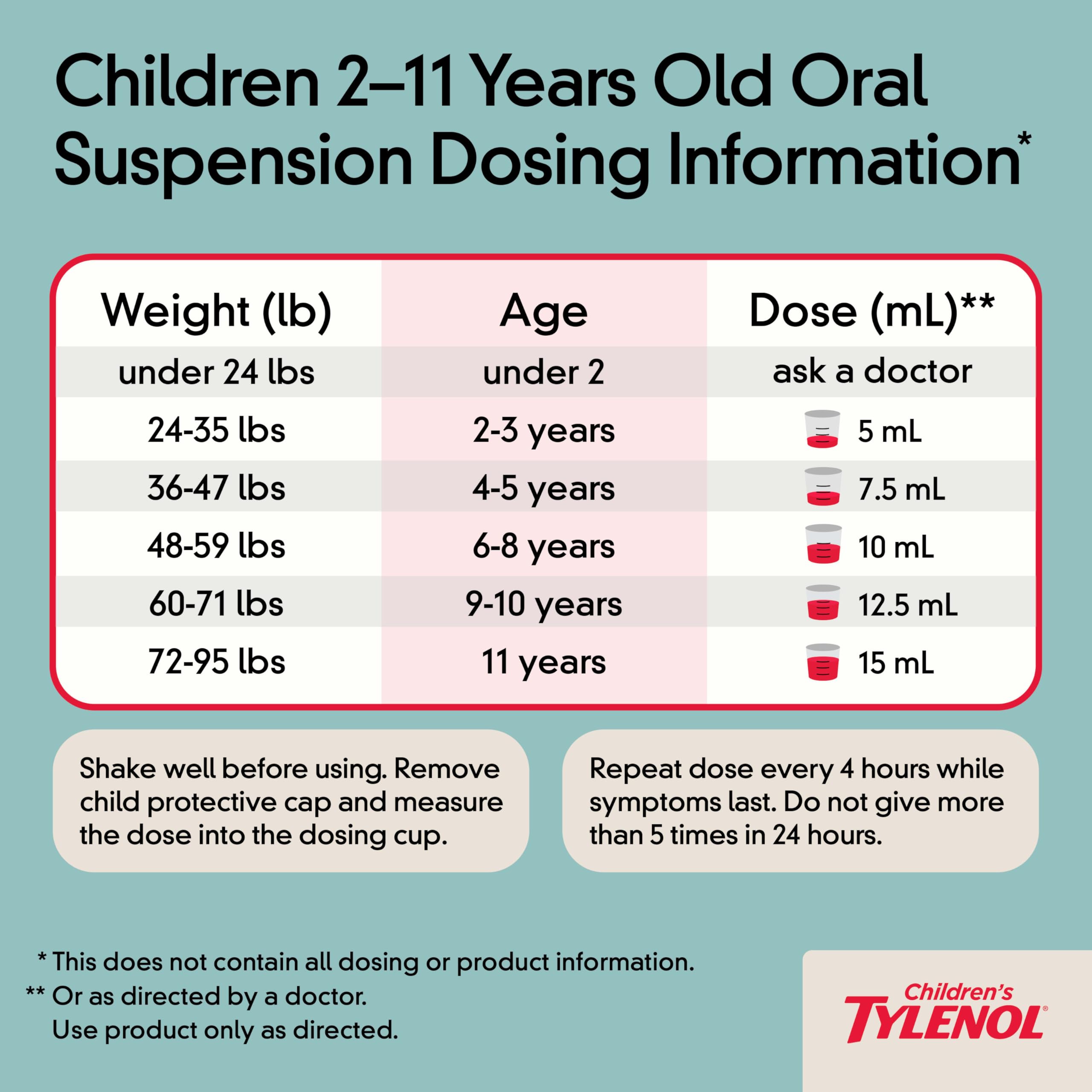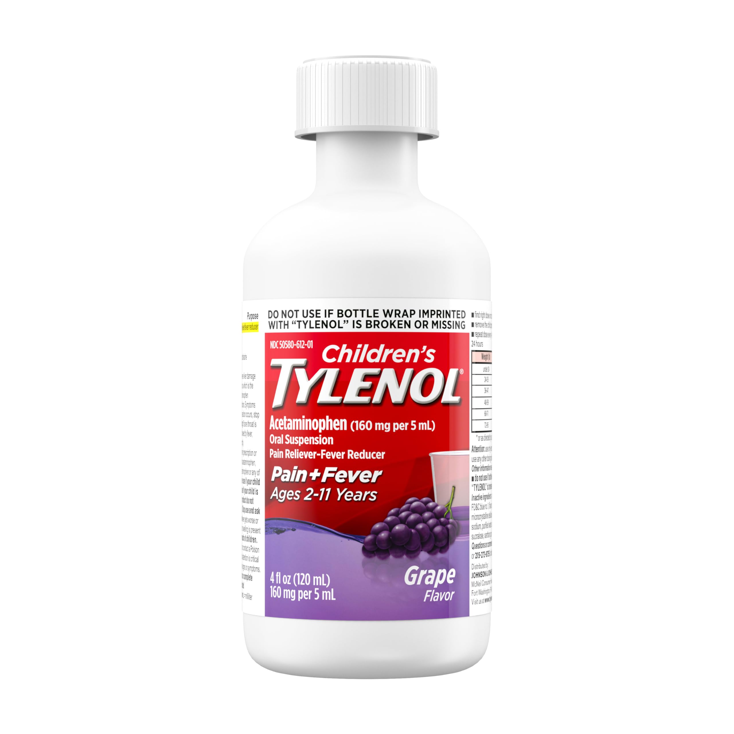 Intended for kids ages 2 to 11 years, Children's Tylenol Liquid Oral Suspension Medicine provides temporary relief from a range of cold and flu symptoms, including fever, minor aches and pains, headache and sore throat. Each 5 milliliter dose of this kids' liquid medicine contains 160 milligrams of the pain reliever and fever reducer acetaminophen to temporarily reduce fever and help relieve minor aches and pains due to the common cold, flu, sore throat, headache, and toothache. This children's cold & flu symptom medicine also comes in a kid-friendly grape flavor and is ibuprofen-, aspirin- and alcohol- free, and gentle on the tummy. From the #1 pediatrician recommended brand for pain & fever relief, Tylenol has been used by parents decade after decade for effective symptom relief.