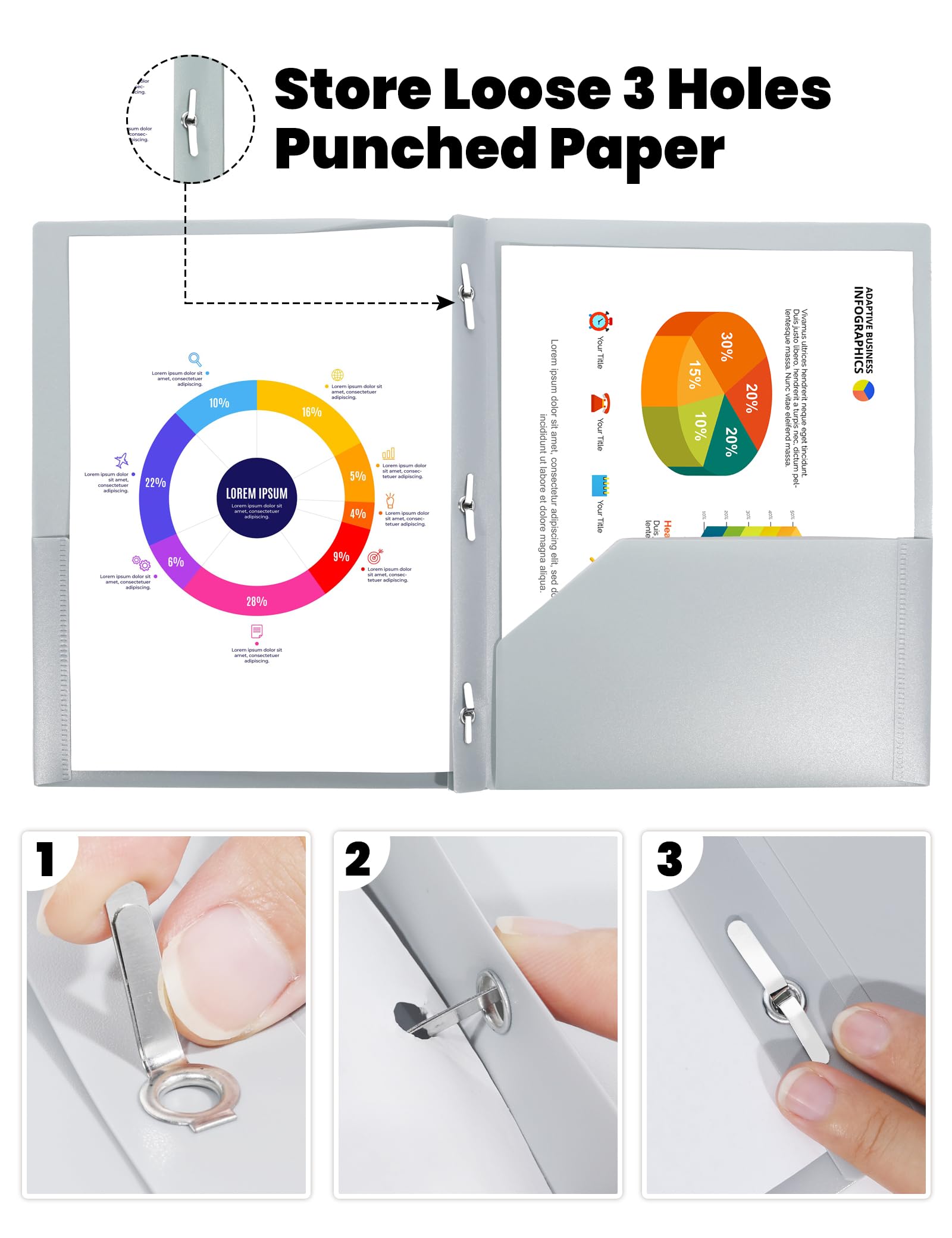 CONVENIENT TO USE: 2 pocket folders with fasteners for 3-hole punched paper. Quickly add 3-hole punched paper in our easy-to-use 3-prong design. The outer edges of the pockets are heat sealed so that you can easily insert/remove paper from the PP 2 pocket folder.