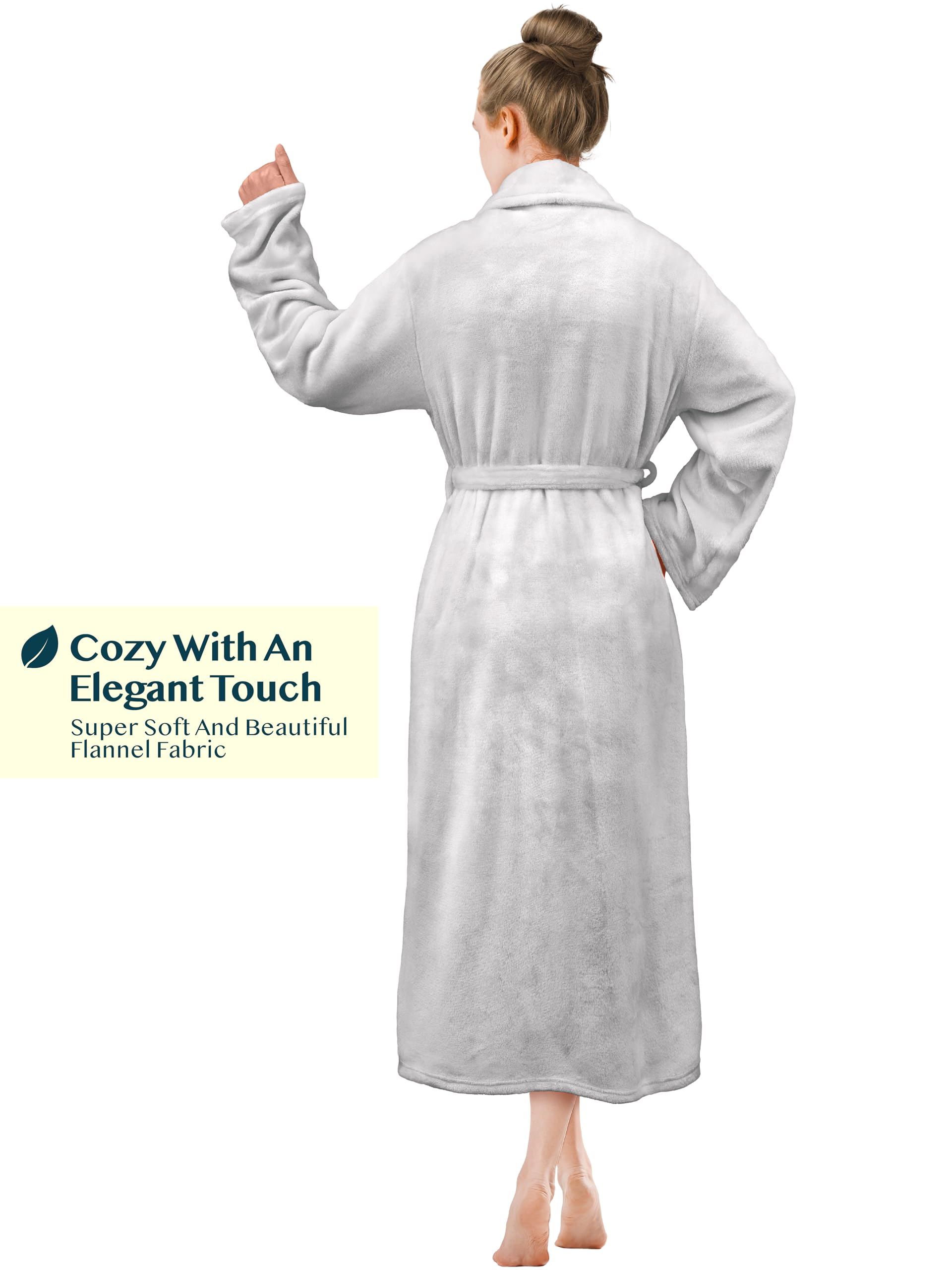 WOMENS LIGHT GREY FLEECE ROBES: PAVILIA luxurious fleece robe for women is super soft, plush, fluffy and lightweight and you will never want to take it off. Its delicate microfiber construction ensures a velvety touch that will caress your skin with every wear. Features 2 large side pockets for keeping hands warm and storing remotes, glasses, keys, the long robe boasts the perfect fit and comes with a waist strap for easily adjusting to find your ideal comfort level.