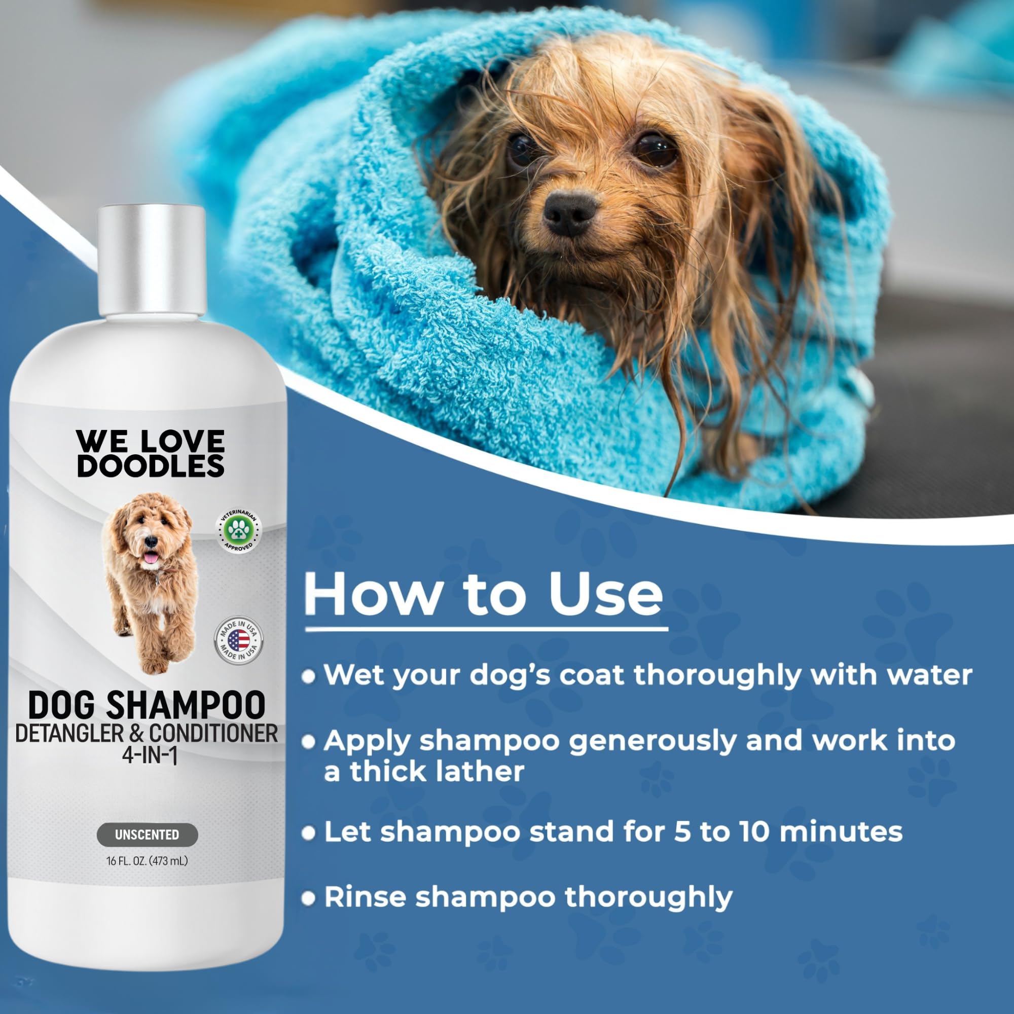 CLEANS, CONDITIONS, DETANGLES AND MOISTURIZES – This 4-in-1 dog shampoo, conditioner and detangler gently cleans your dog’s coat while providing deep conditioning, detangling knots and adding moisture for a softer, more manageable finish.