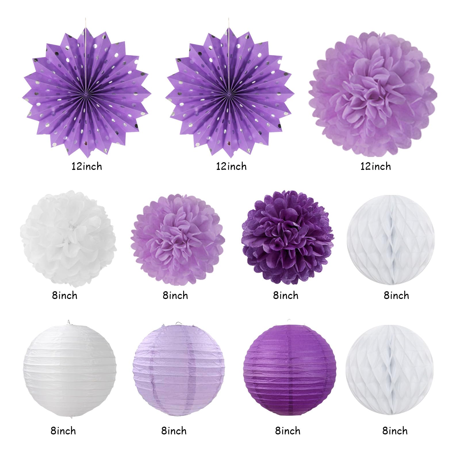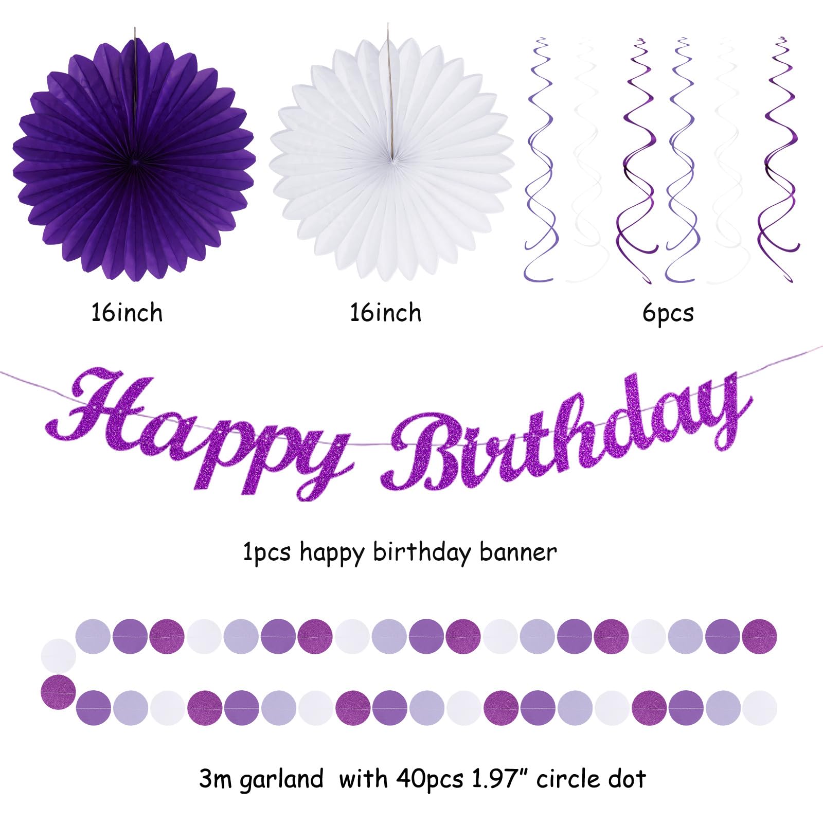 【White Purple Lavender Party Kits】This kits include 1pcs happy birthday banner, 1pcs circle dots paper banner, 4pcs tissue pom poms: 3pcs 10" and 1pcs 12" , 3pcs 8inch paper honeycom ball, 2pcs 8inch paper lantern, 4pcs 12inch paper flower fan, 6pcs Paper swirls hanging streamers (more packing details show in the package picture).
