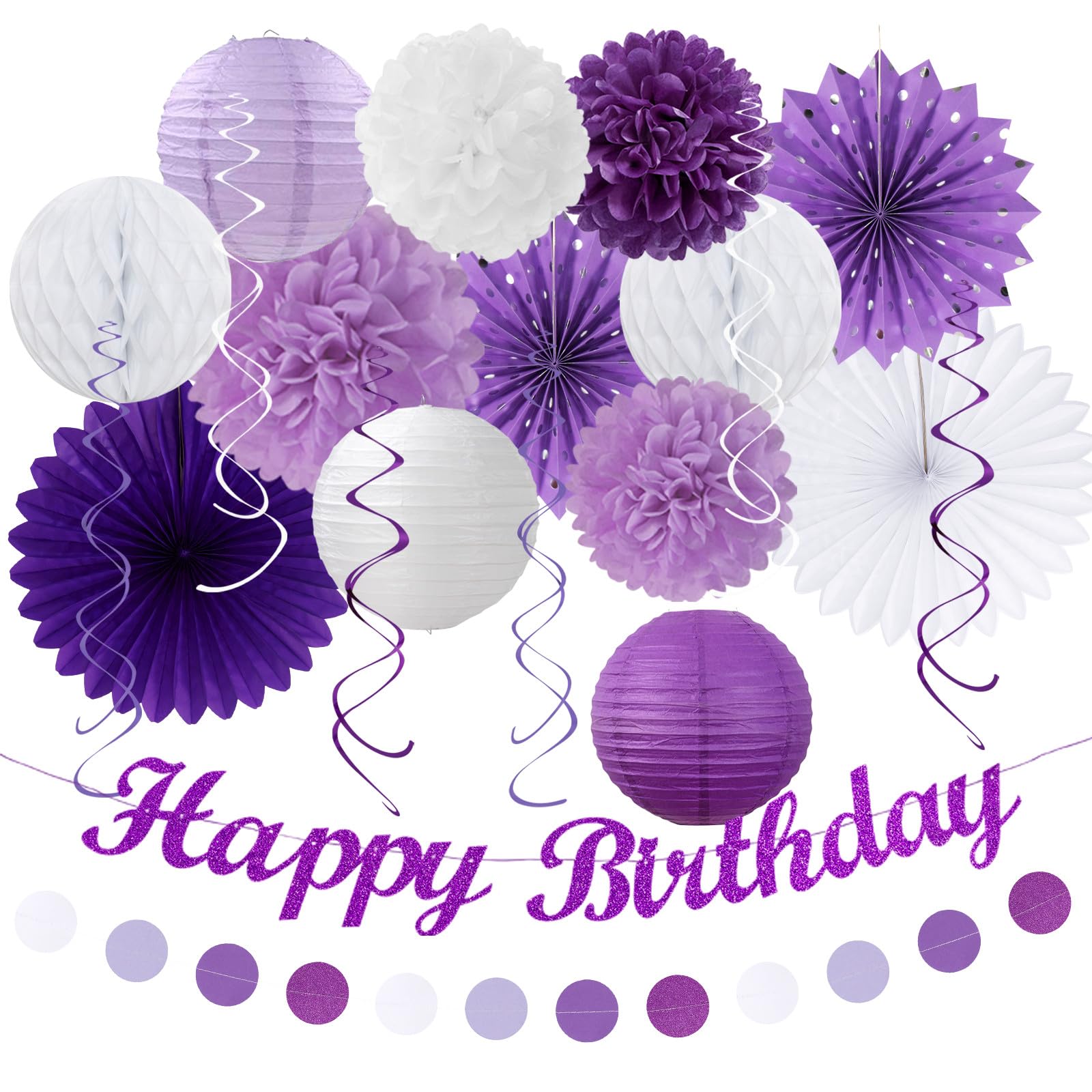 【White Purple Lavender Party Kits】This kits include 1pcs happy birthday banner, 1pcs circle dots paper banner, 4pcs tissue pom poms: 3pcs 10" and 1pcs 12" , 3pcs 8inch paper honeycom ball, 2pcs 8inch paper lantern, 4pcs 12inch paper flower fan, 6pcs Paper swirls hanging streamers (more packing details show in the package picture). 【Unique Birthday Party Decoration design】Light Purple lavender color, use our high-quality birthday decorations at your party table and give your guests the details they deserve. It will be a great addition to your birthday theme party. 【Wide Application】This purple birthday party decorations kit have been used for all kinds of parties and special occasions Perfect for 13th 21st 50th 60th 80th birthday decorations,Party decorations for women and girls. 【Easy to Assemble】The paper fan and paper lanterns are easy assemble, the birthday banners can be diy, the circle dots paper banner has been assembled but tissue paper pompoms take more time to put together, please diy with the instructions. It will take about 20 minutes in total. 【Quality Guarantee】If you are not satisfied with the color, quality or other aspects,please contact us for a refund or replacement. We have a 30 day refund guarantee for every order.