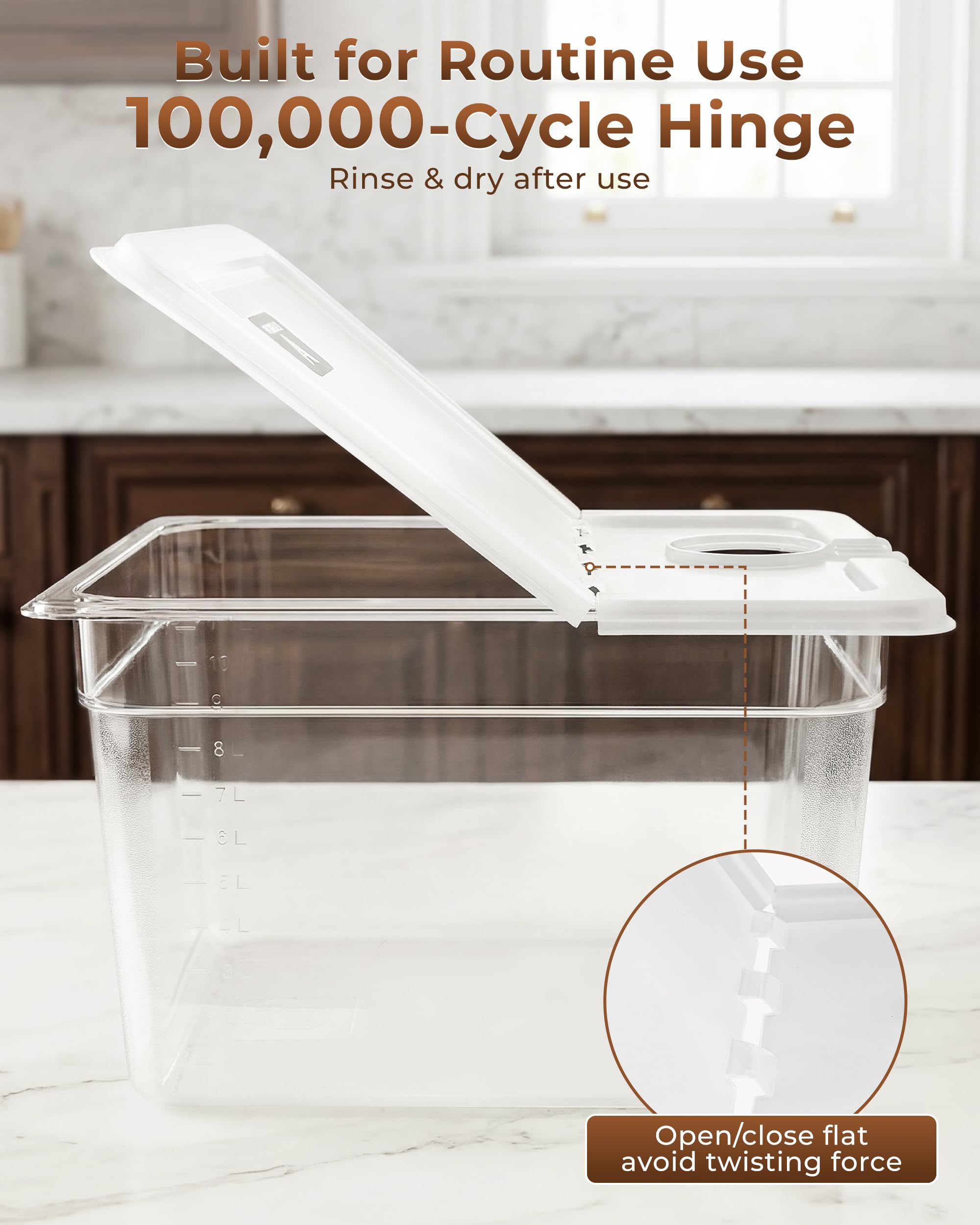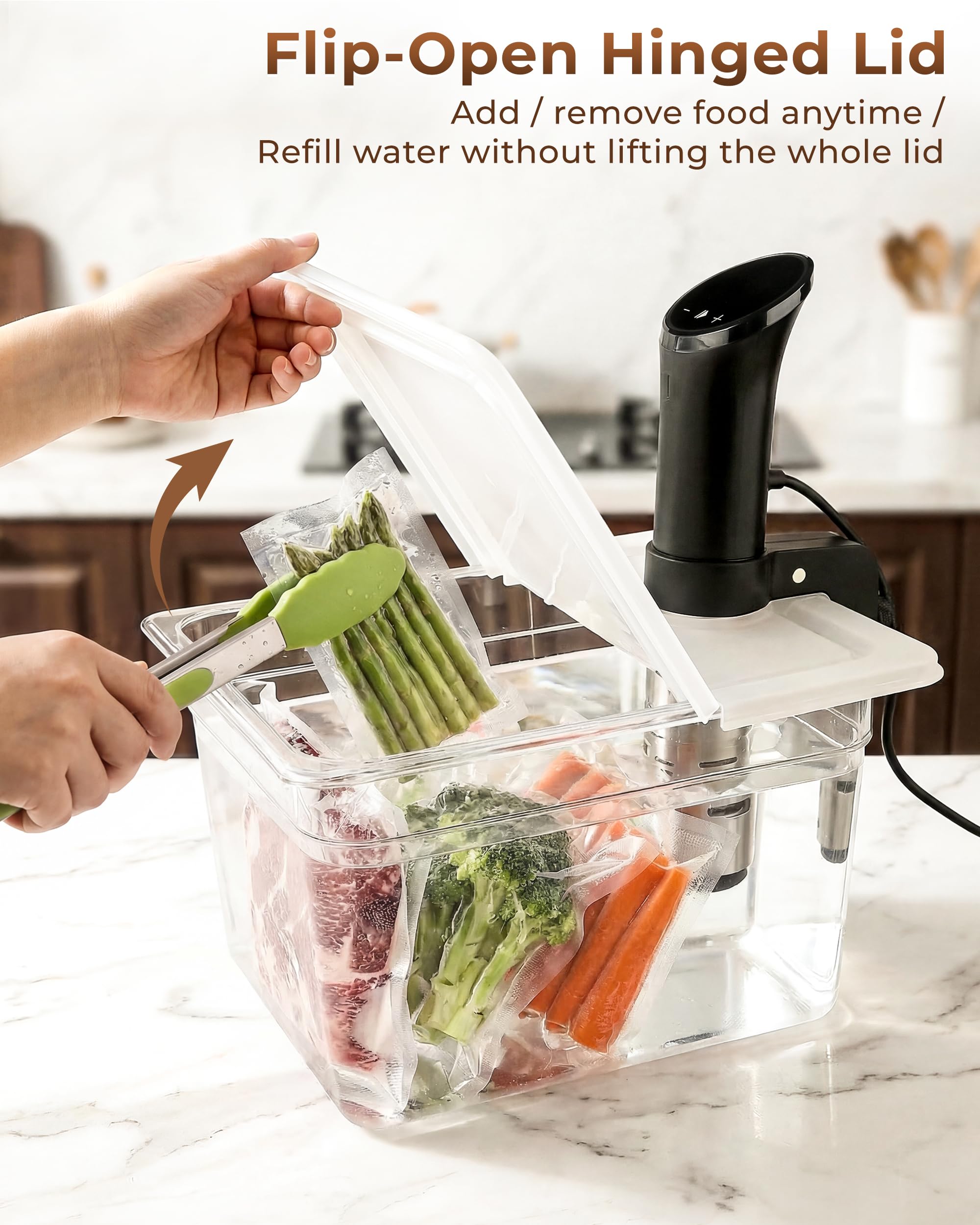 Collapsible Lid - The hinge is close to the machine giving enough space to check or refill or remove ingredients any time. Durable hinge is tested for 100,000 uses. No Clamps Required - The lid fits to the container snugly to clamps the sealed bags to stop it from swimming in the bath, no additional clamps required.