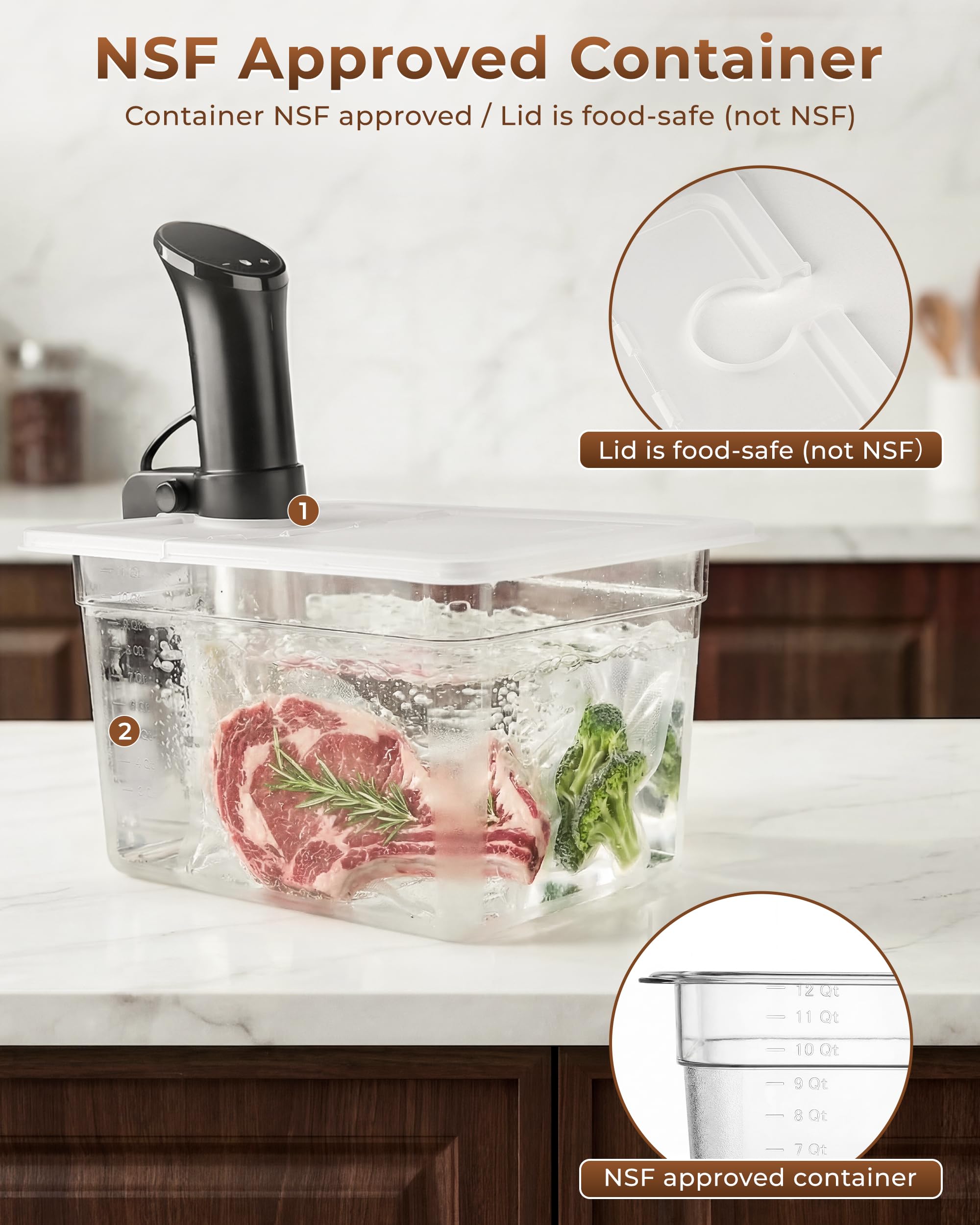 Container NSF Approved - EVERIE container EVC-12 is NSF approved for your safety for sous vide. Only the container in which water is filled and heated is NSF approved. The lid is not NSF approved, but the lid is food safe.