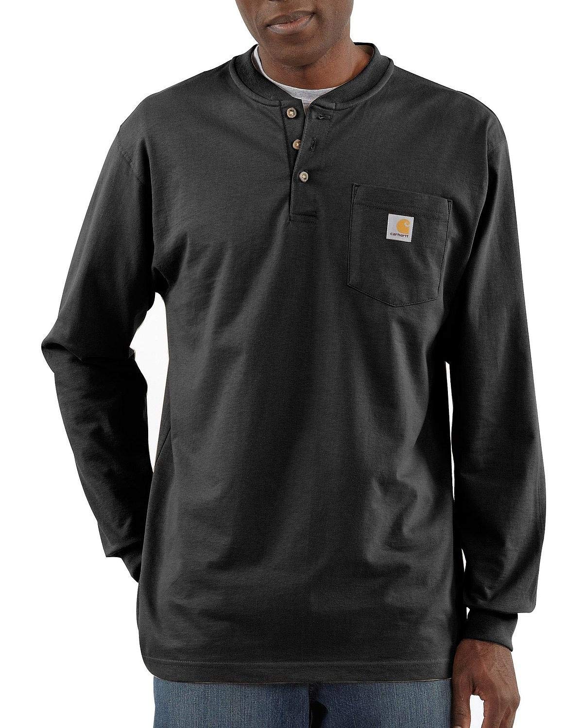Description Carhartt's long sleeve work wear henley is an all-purpose work shirt that is perfect for cooler days or as a layering piece Made of 675-ounce, 100-percent cotton jersey, it features a rib-knit collar with a three-button closure and a left chest pocket It also has side-seamed construction to minimize twisting and maximize comfort ash fiber content is 99-percent , 1-percent polyester Heather gray fiber content is 90-percent cotton , 10-percent polyester