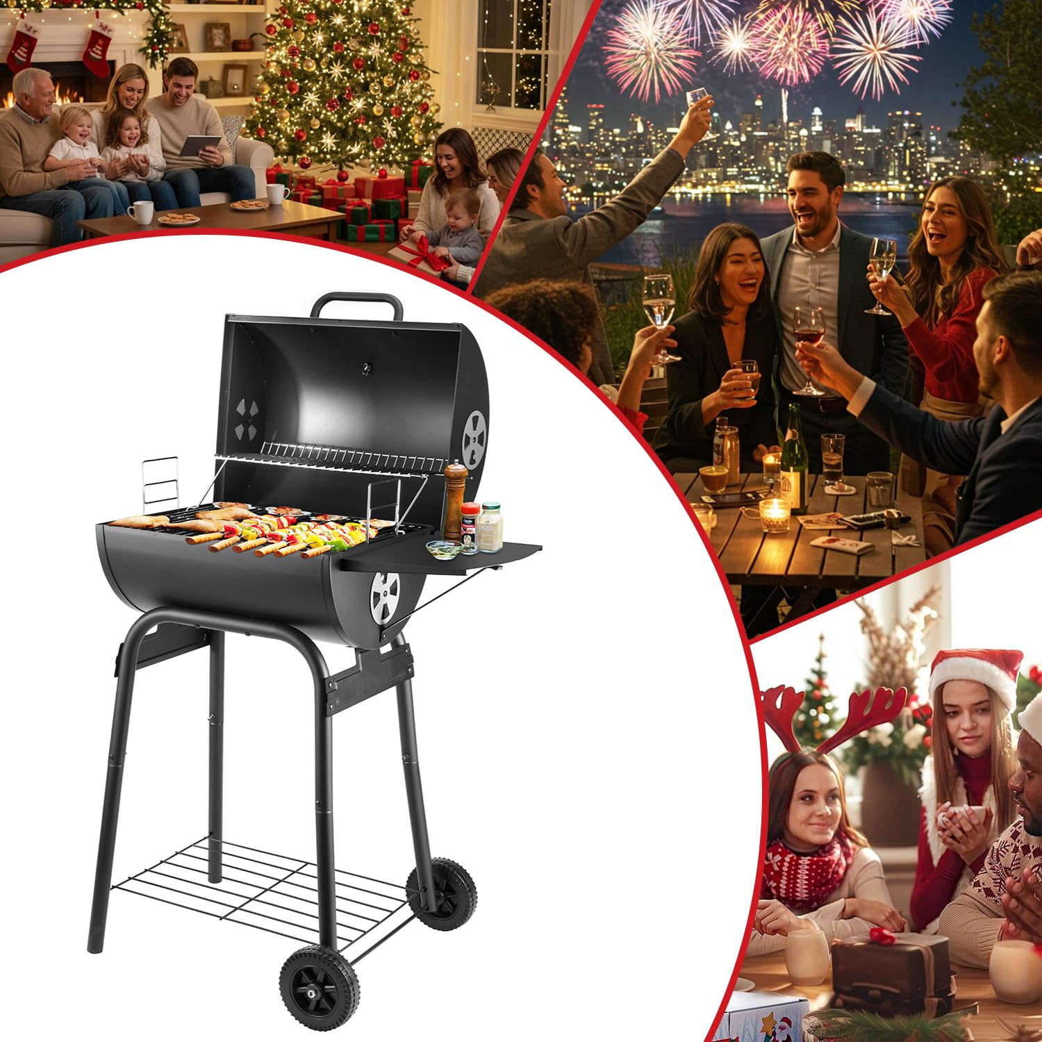 Expansive Cooking Surface: Kendane barrel charcoal grill features nearly 500 sq. in. cooking grid area with porcelain-enameled steel wire grates and a chrome-plated warming rack. This charcoal grill can accommodate up to 12 burgers, perfect for outdoor BBQs, backyard parties, and camping trips.