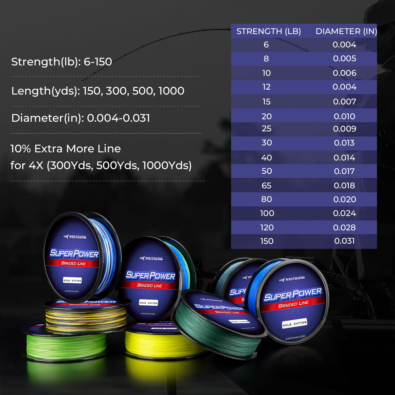 Wide Assortment of Colors & Strengths - SuperPower braided fishing line is available in 9 colors (Moss Green, Gray, Yellow, Blue, Multi-Color, Blue Camo, Sky Blue, Grass Camo, and Camo) and strengths from 6lb to 150lb, in spool lengths ranging from 150 to 1097 yards, ensuring a perfect match for various fishing conditions.