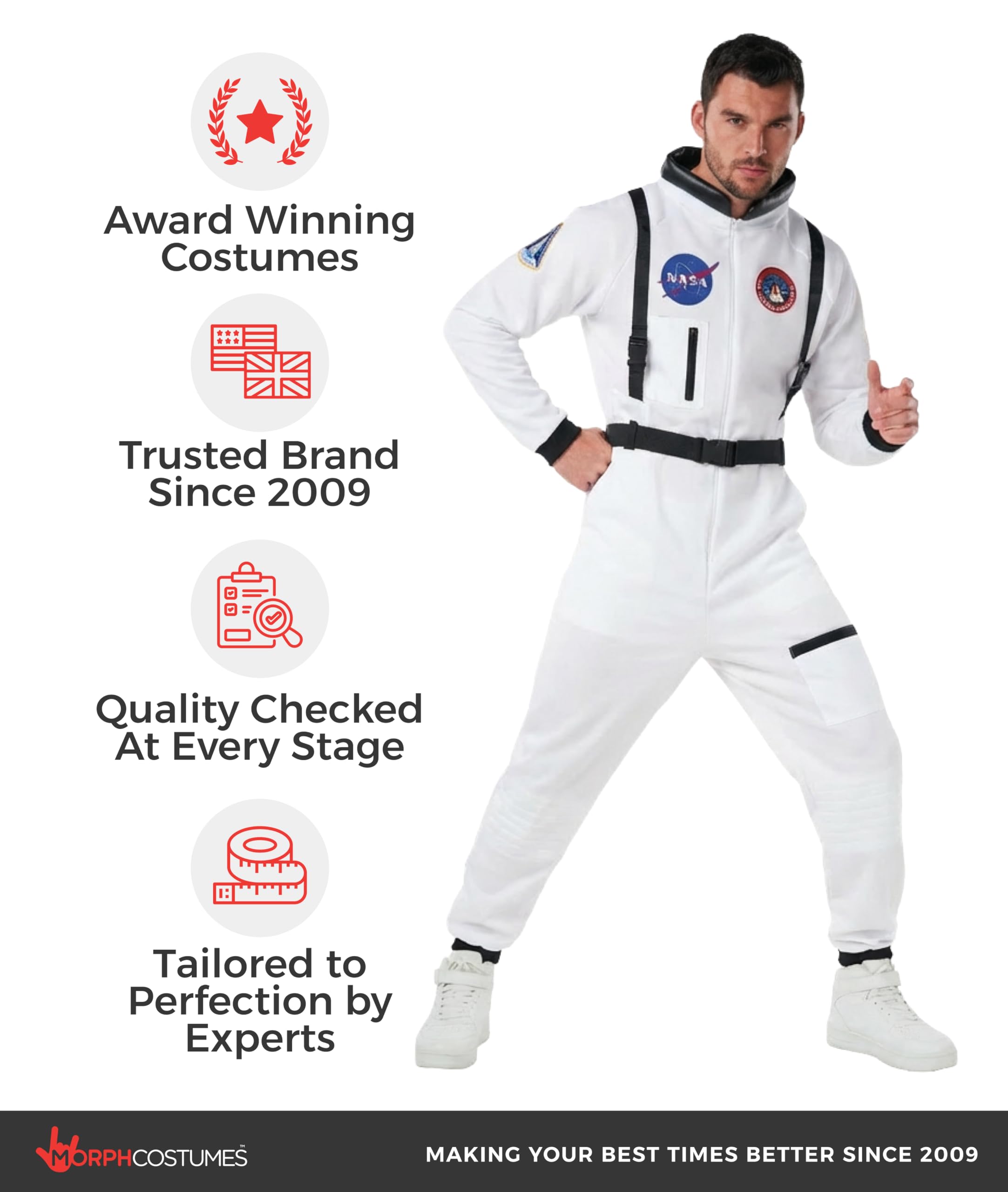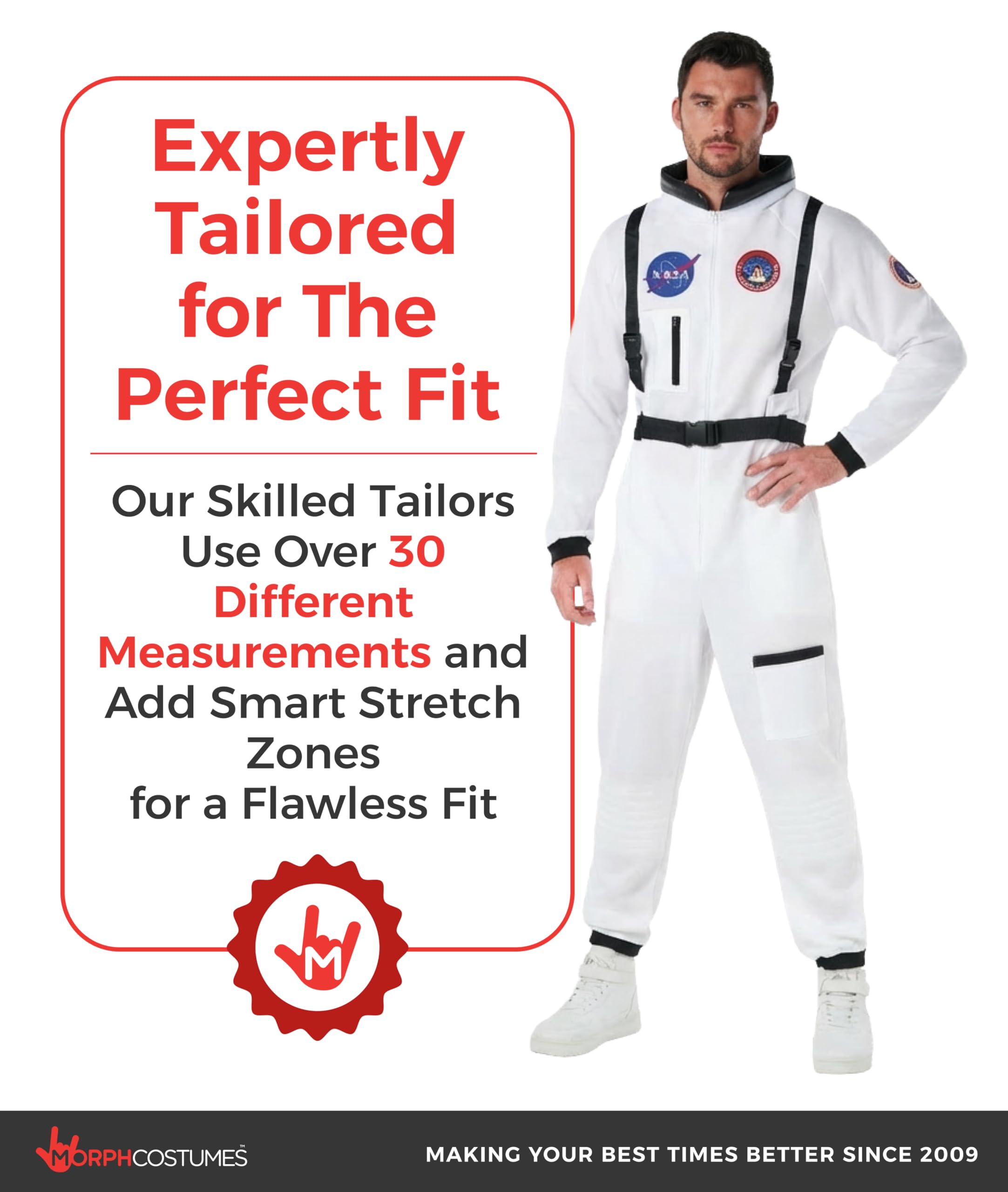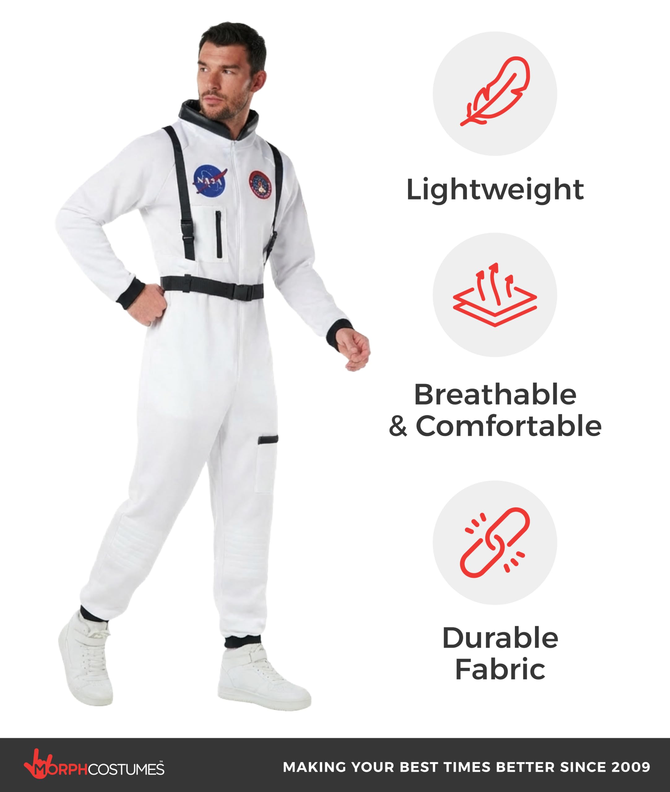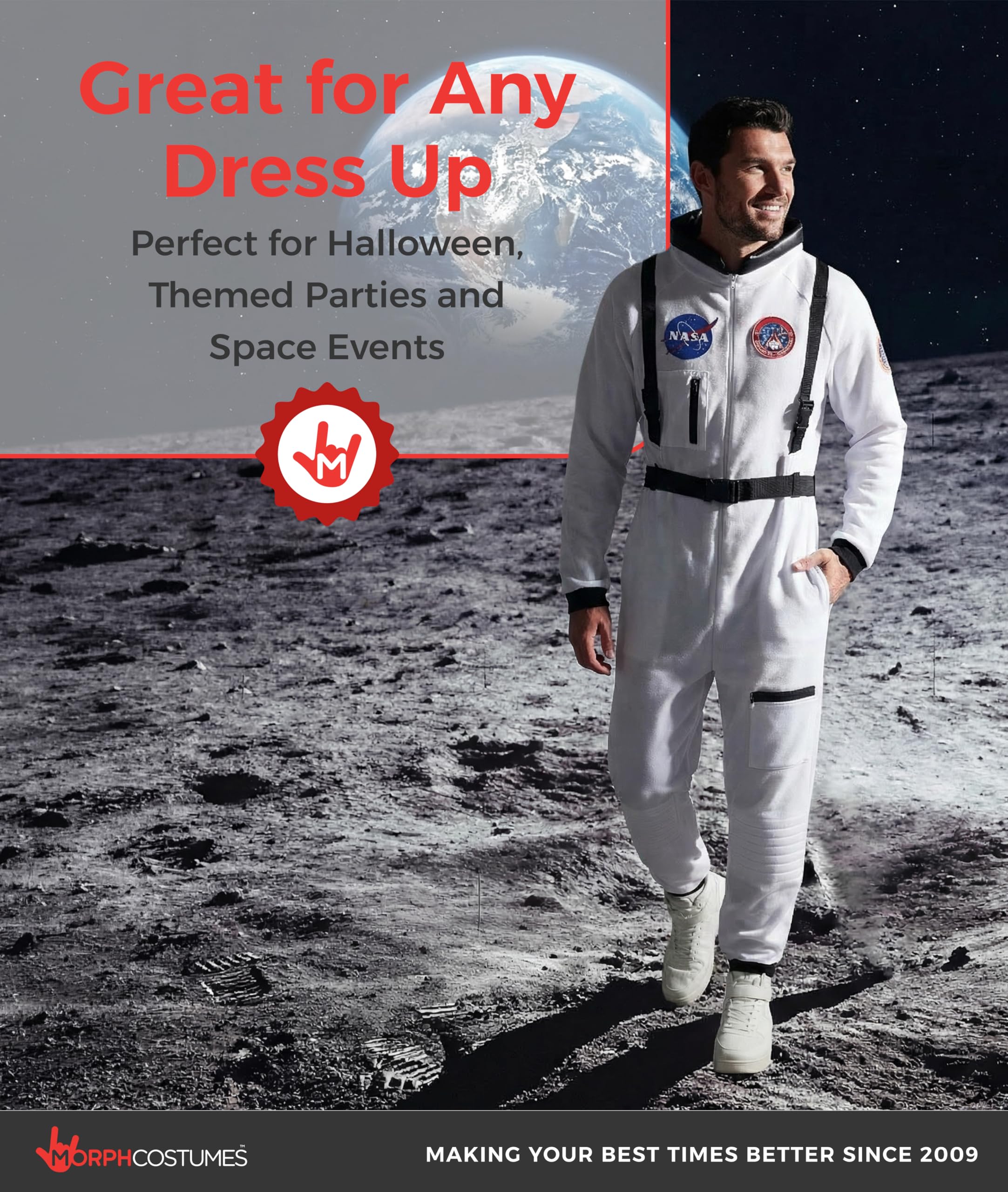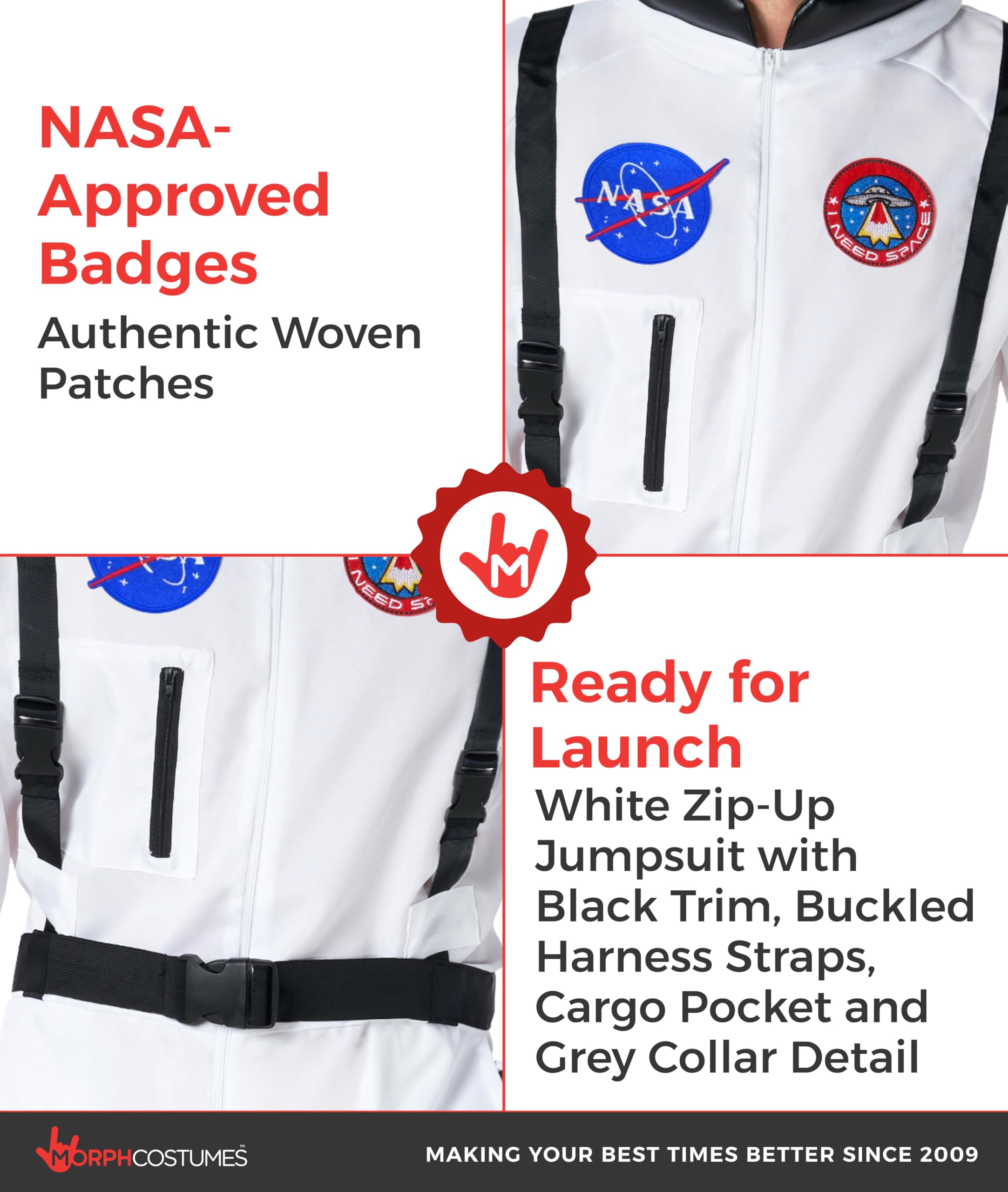 Astronaut costume is a sleek white space jumpsuit featuring authentic woven mission-style badges, zip front closure, adjustable straps with buckled belts, and structured detailing, designed as a nasa costume for bold space explorer dress up