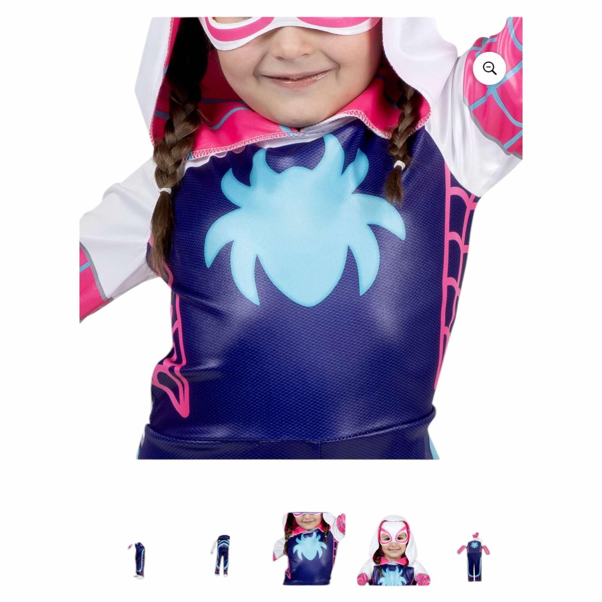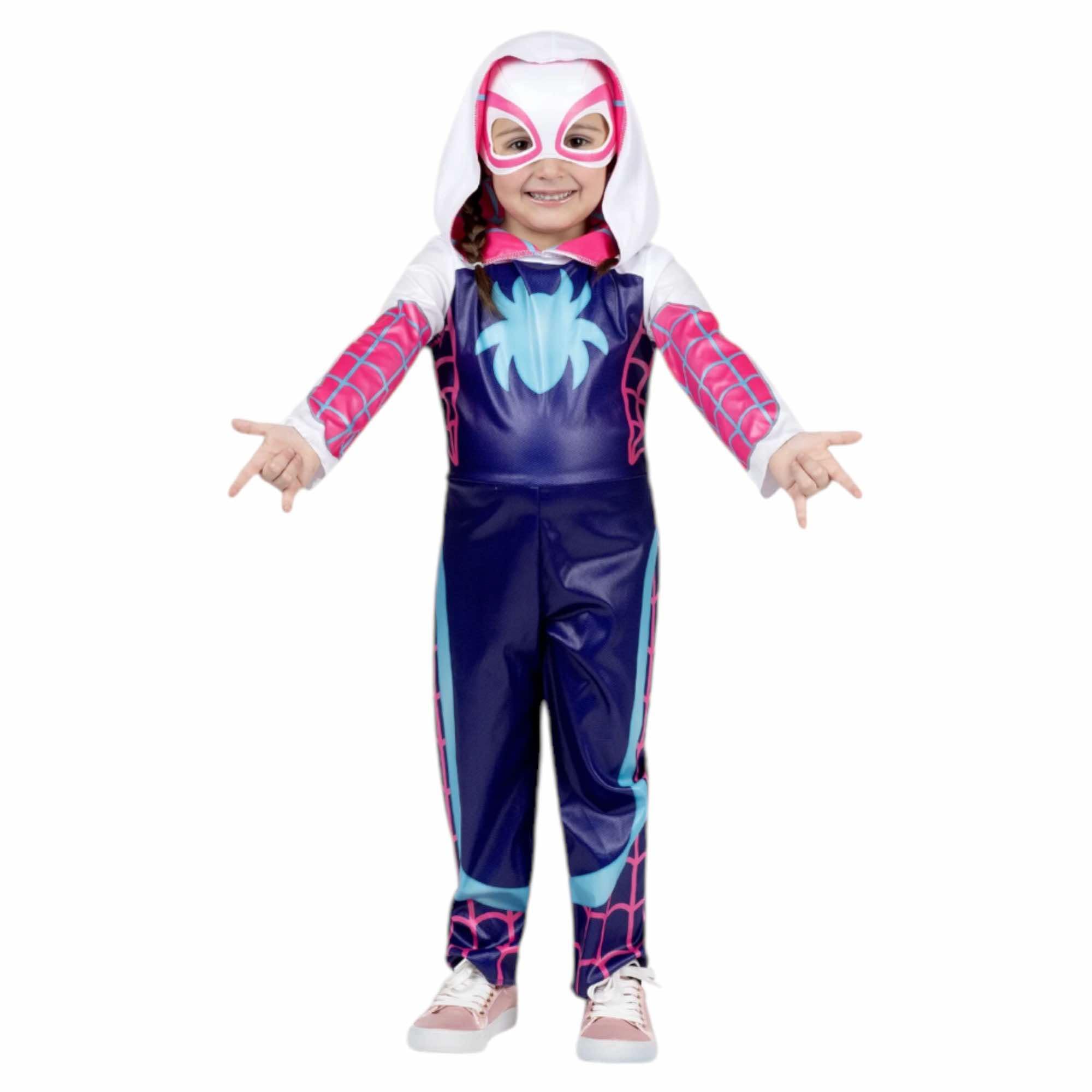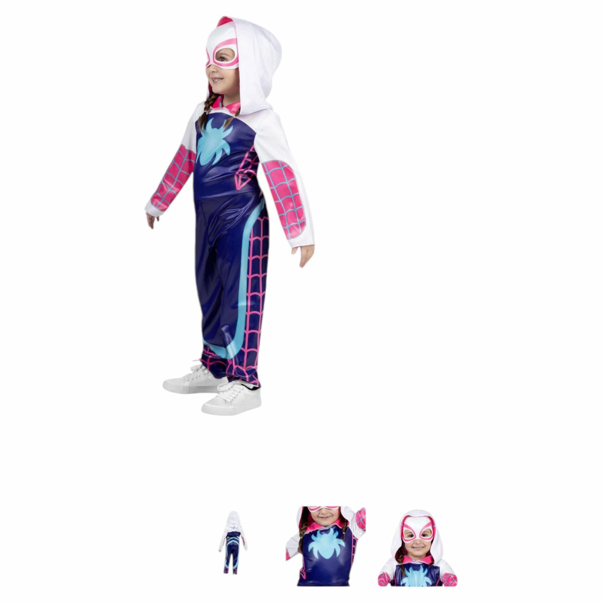 Description Swing into action with the MARVEL Ghost-Spider Official Toddler Halloween Costume 2T. Featuring a graphic design of Gwen Stacy's unique suit, this hooded jumpsuit closes with a hook and loop fastener. It also includes a fabric mask with a foam interior and an elastic strap. All superhero costumes are made from high-quality material with high-resolution prints. Jazwares Costume Play creates Halloween fun for every member of the family. Officially licensed MARVEL product from Jazwares. GHOST-SPIDER: Swing into action with the MARVEL Ghost-Spider Official Toddler Halloween Costume PRINTED JUMPSUIT: Hooded jumpsuit features graphic design of Gwen Stacy's unique suit FABRIC MASK: Also includes fabric mask with foam interior and elastic strap HIGHEST QUALITY: Made with high-quality material and high-resolution prints JAZWARES COSTUMES: Halloween costumes made for every member of the family