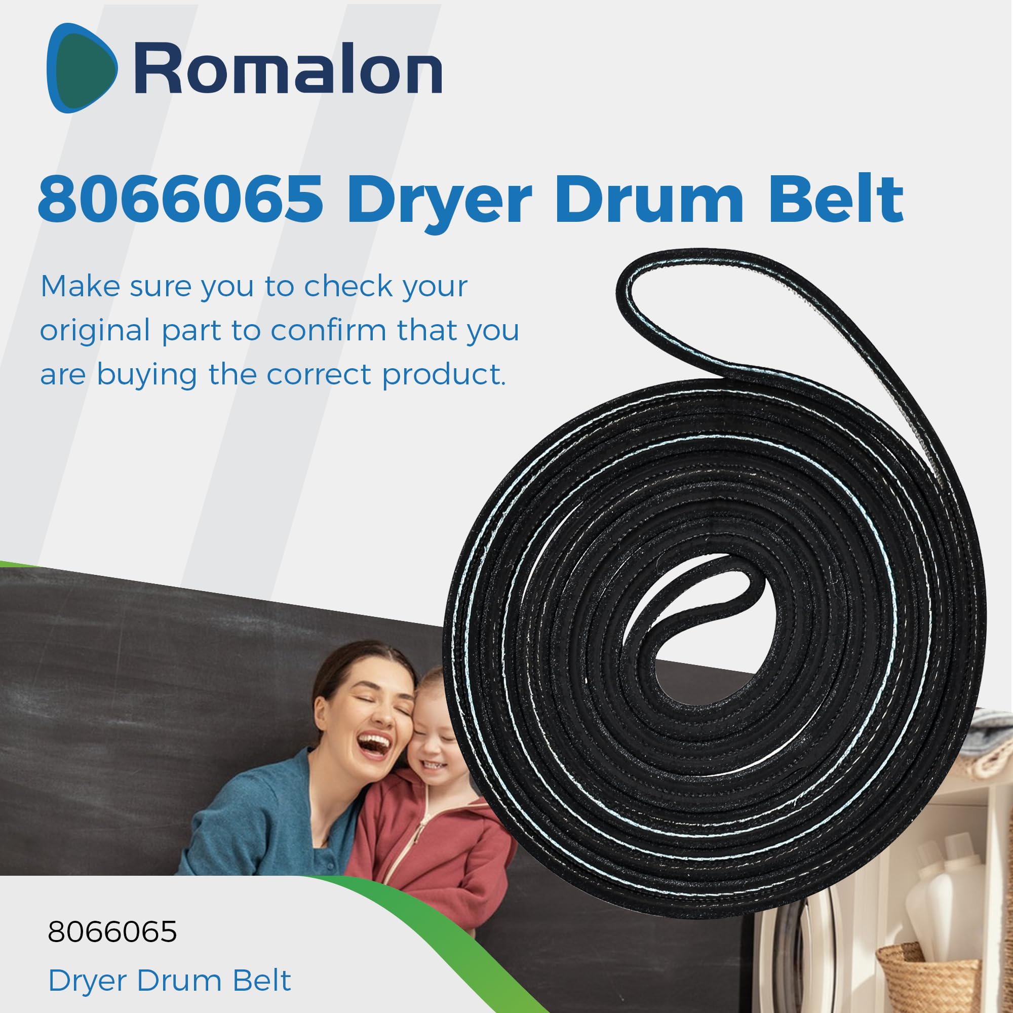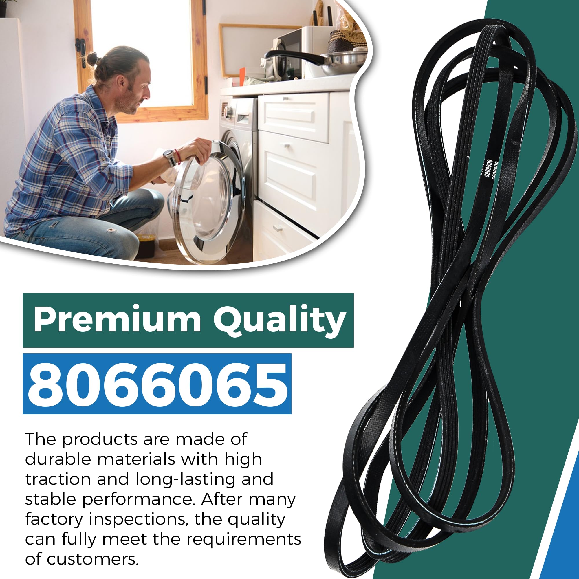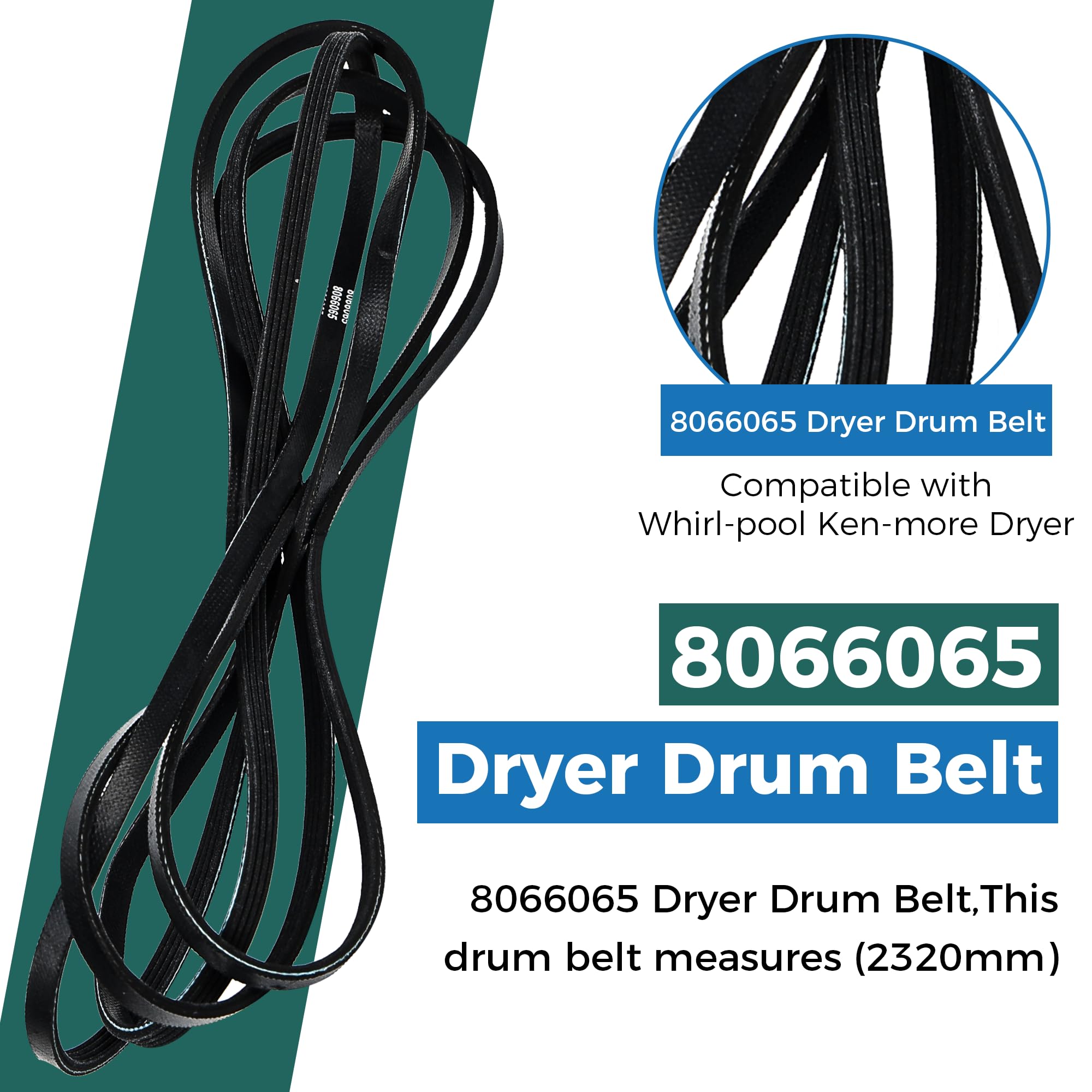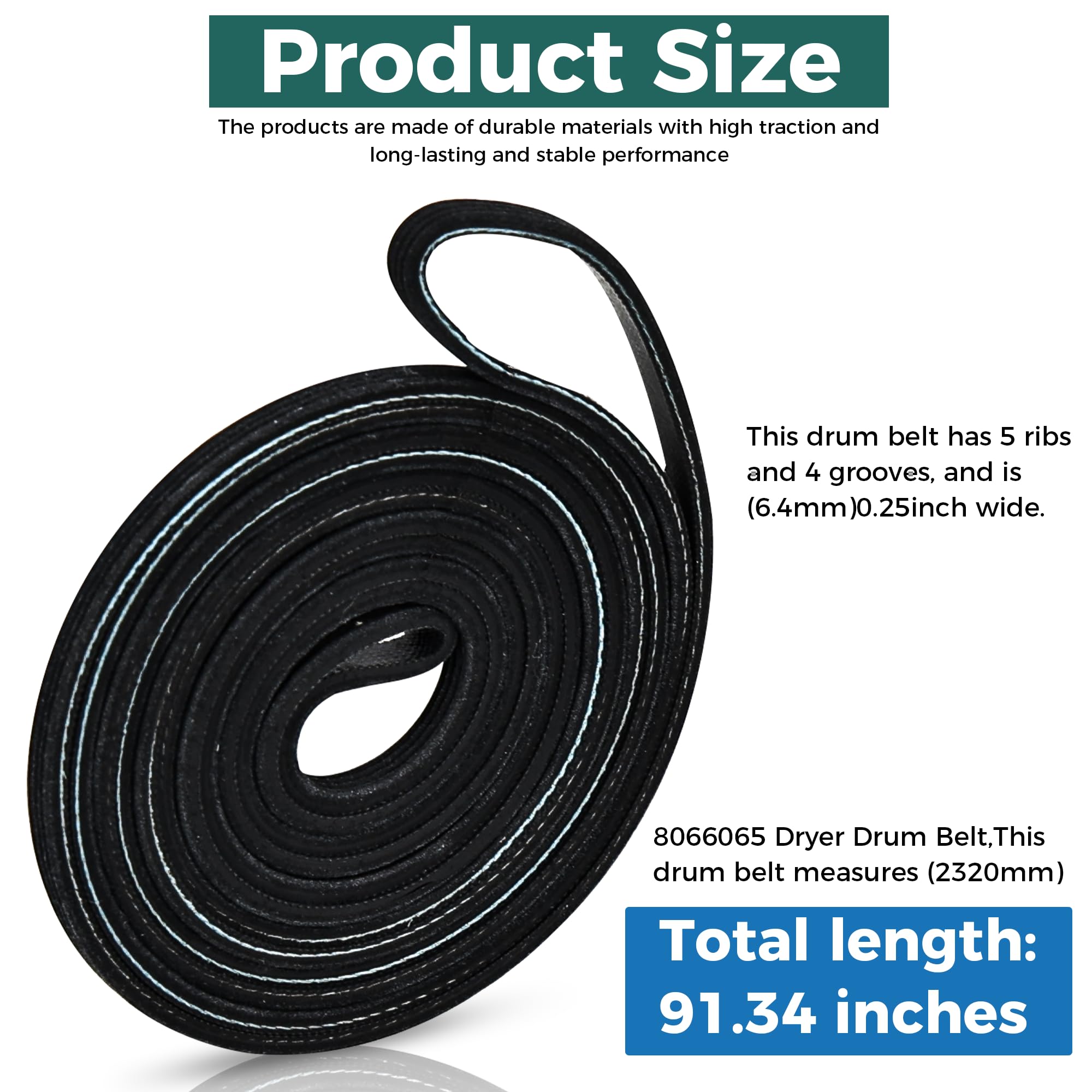 Parts Number:8066065 Dryer Drum Belt,This drum belt measures (2320mm),91.34 inches in total length, has 5 ribs and 4 grooves, and is (6.4mm)0.25inch wide
