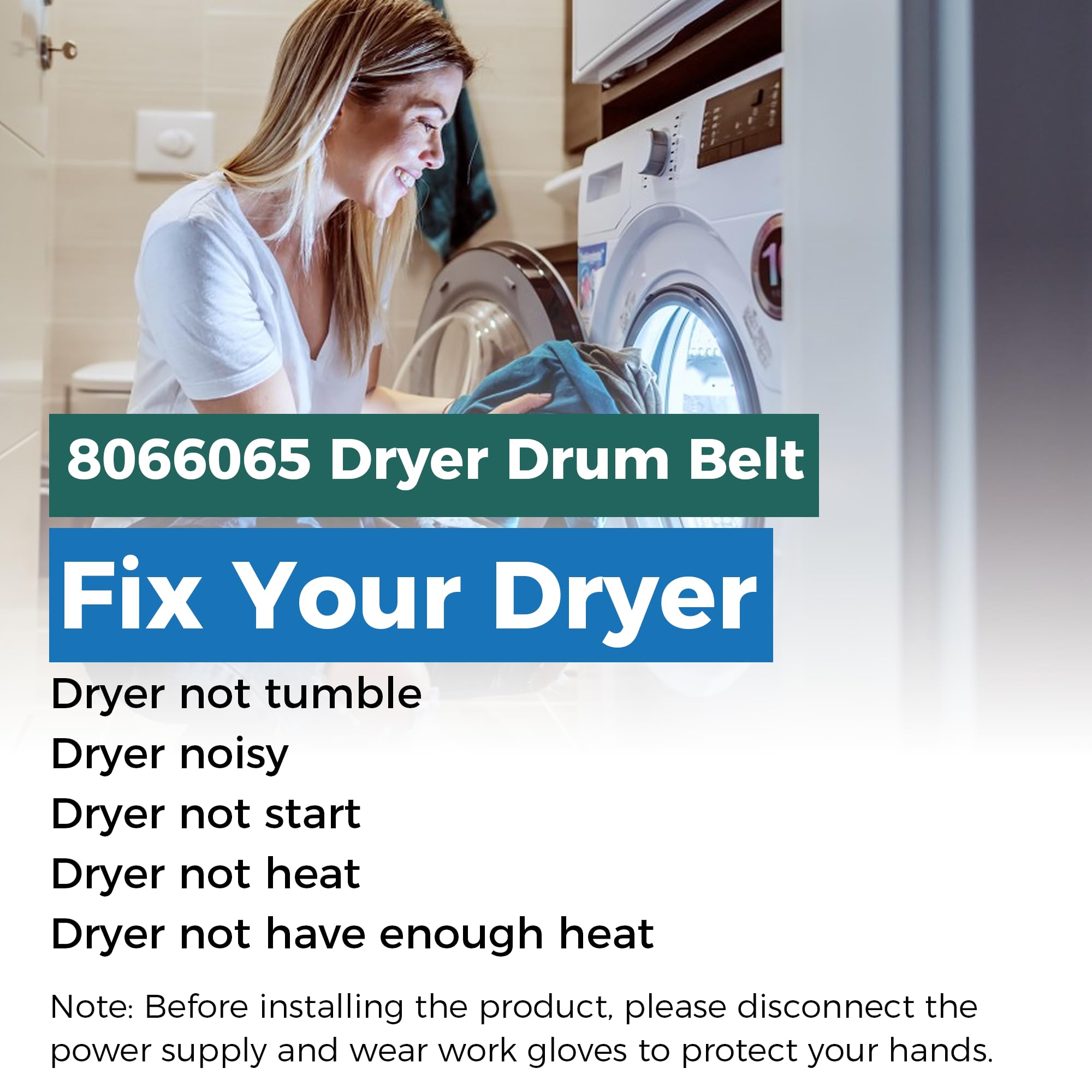 Fix Your Dryer:not tumble; noisy; not start; not heat or not have enough heat.Note: Before installing the product, please disconnect the power supply and wear work gloves to protect your hands